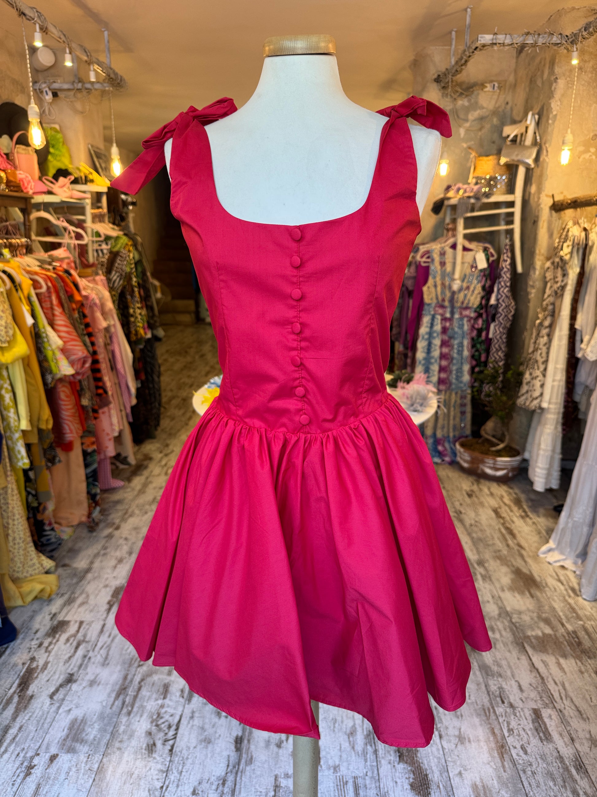 abito con gonna a ruota in cotone tessuto doppio. Fiocchetti sulle spalline. Finti bottoncini frontali. Zip posteriore a chiusura. Gonna a ruota.