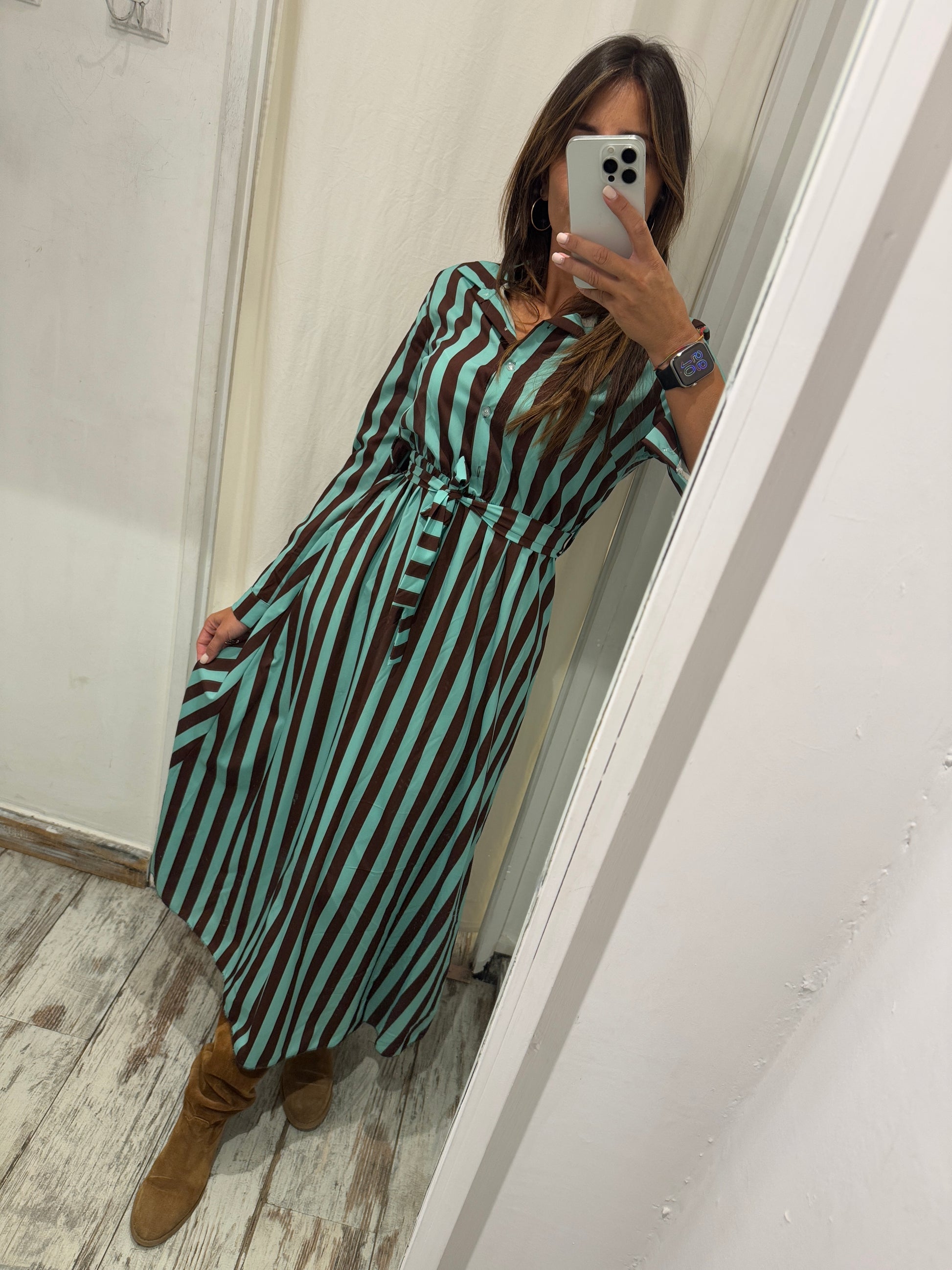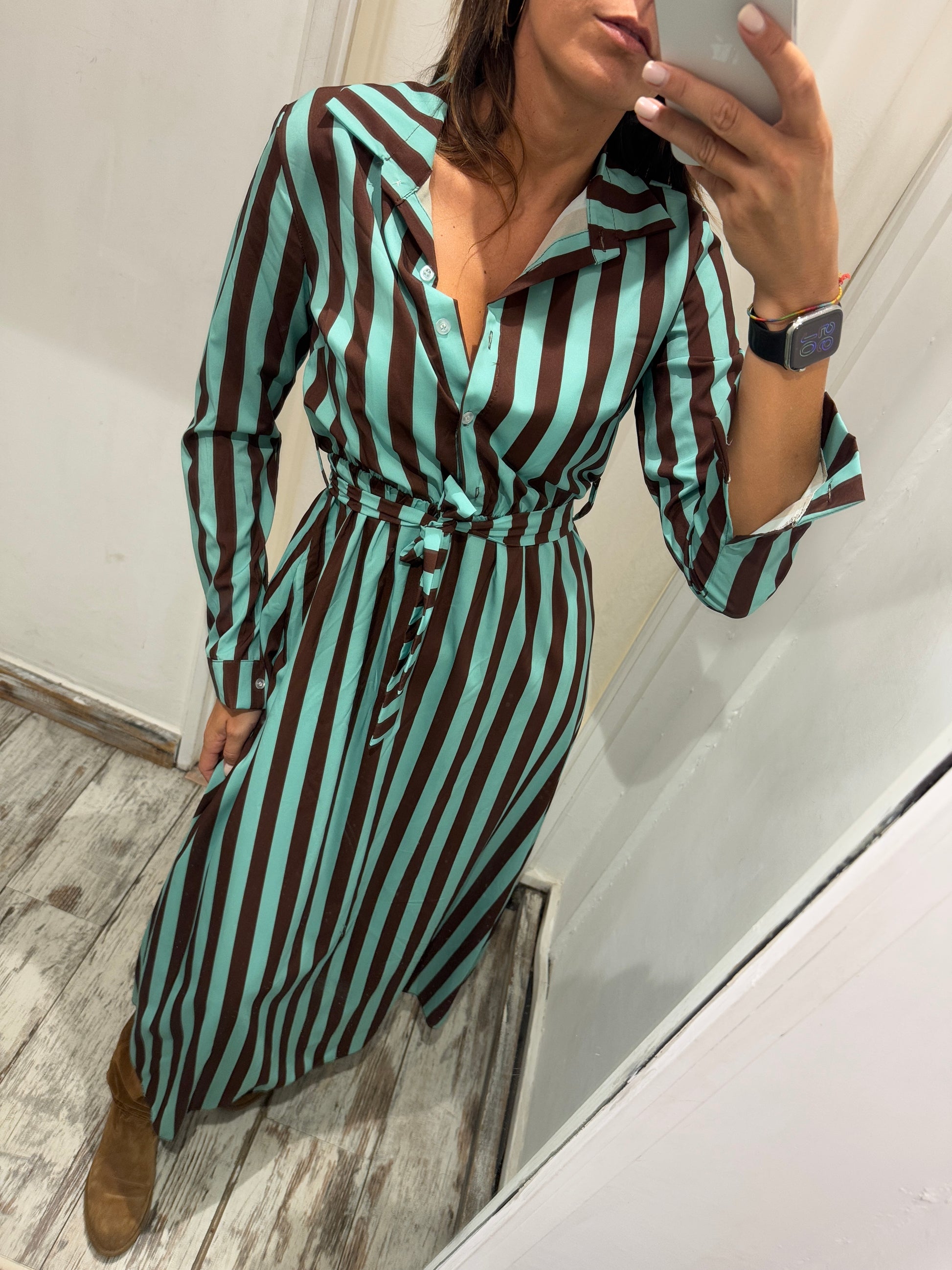 abito chemisier a righe tiffany e marrone con cintura alla vita removibile.cbottoncini fino al punto vita elastsicizzato