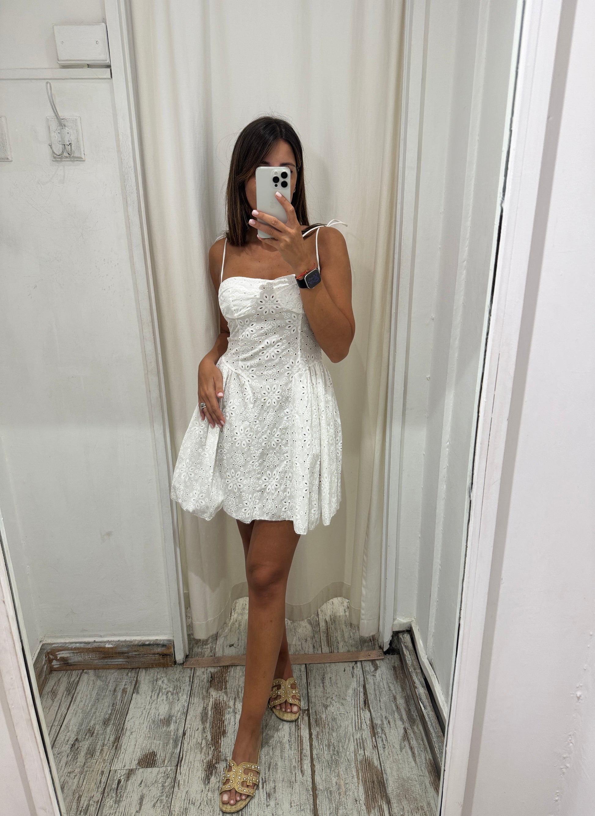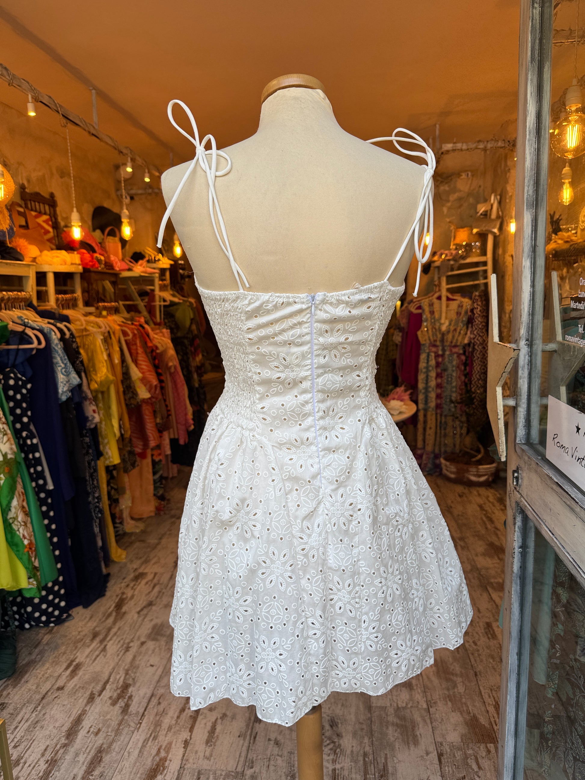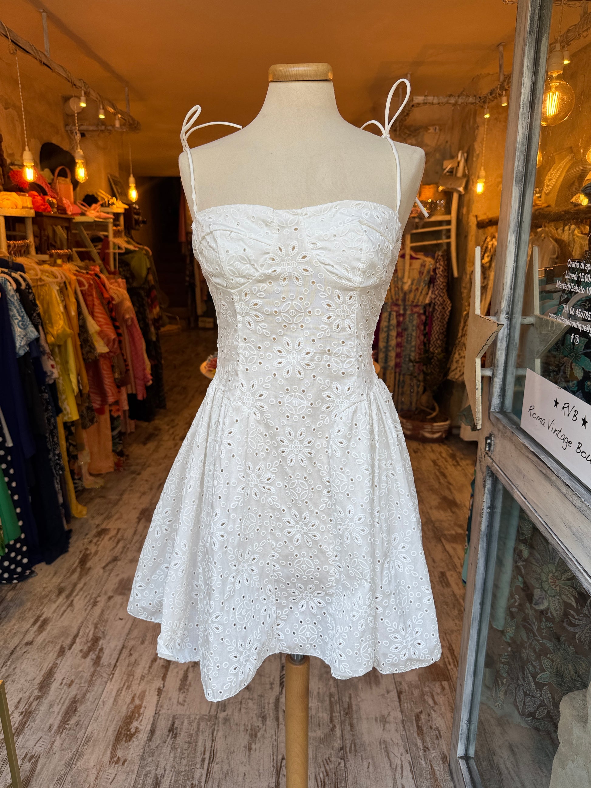 Abito corto effetto sangallo bianco. Spalline regolabili elasticizzate. Coppette non imbottite. Zip posteriore a chiusura. Spilla venduta separatamente