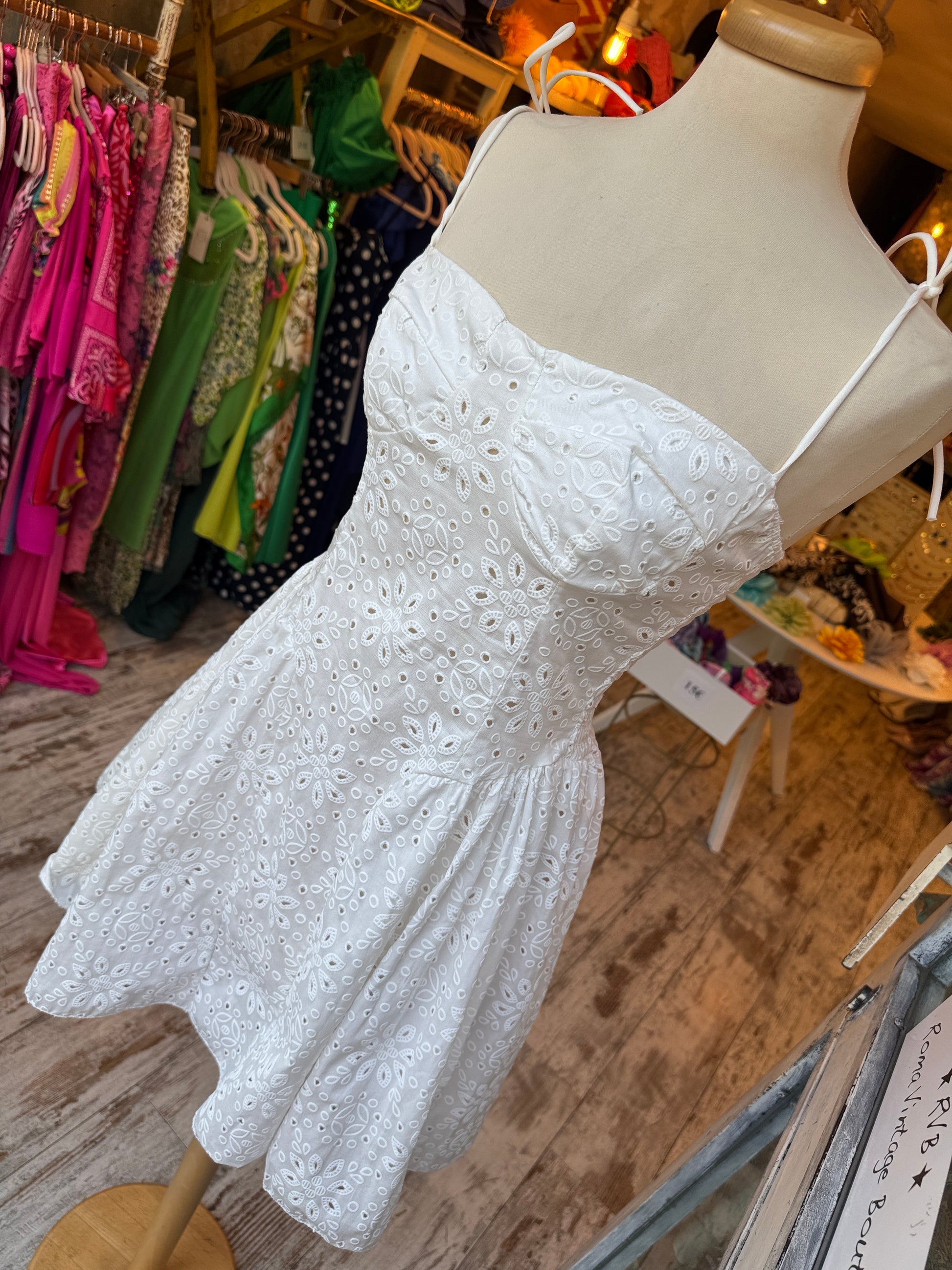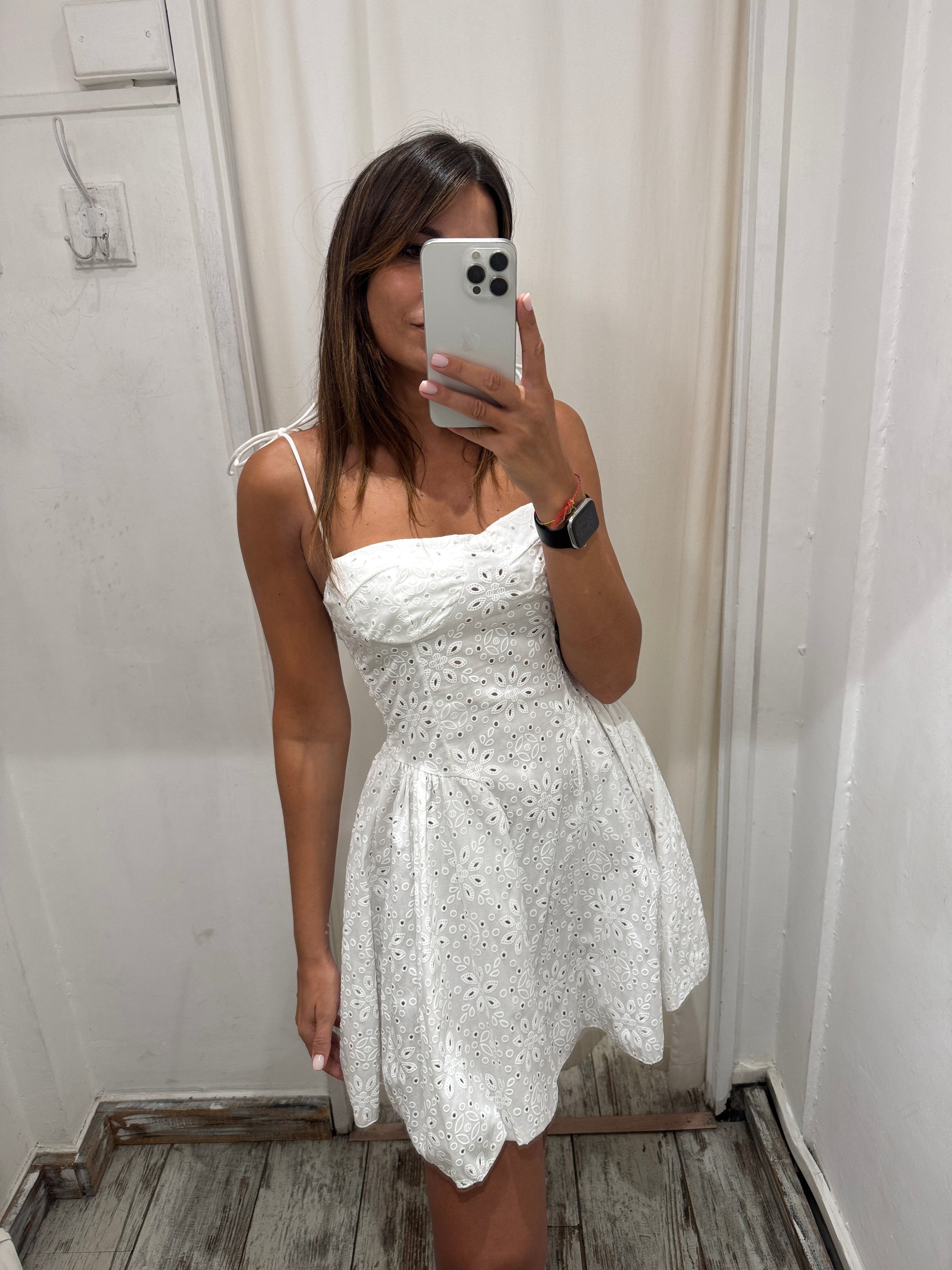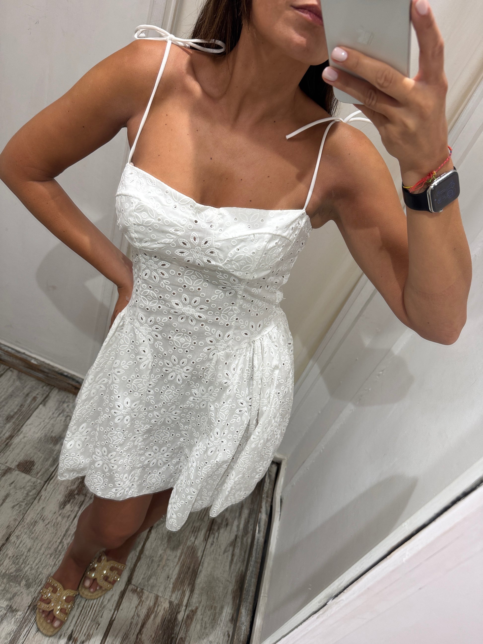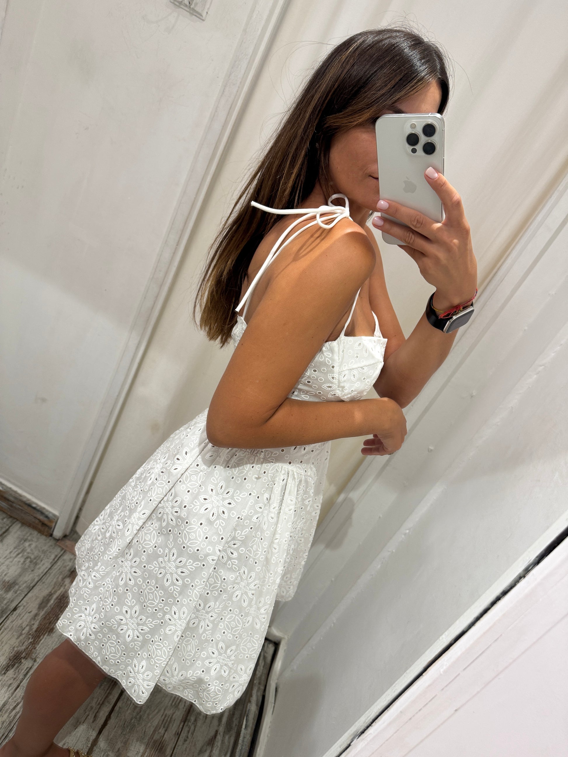 Abito corto effetto sangallo bianco. Spalline regolabili elasticizzate. Coppette non imbottite. Zip posteriore a chiusura. Spilla venduta separatamente