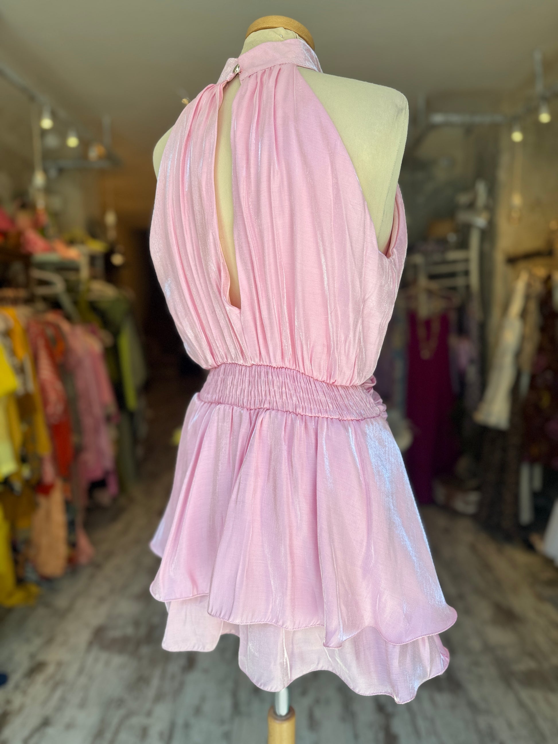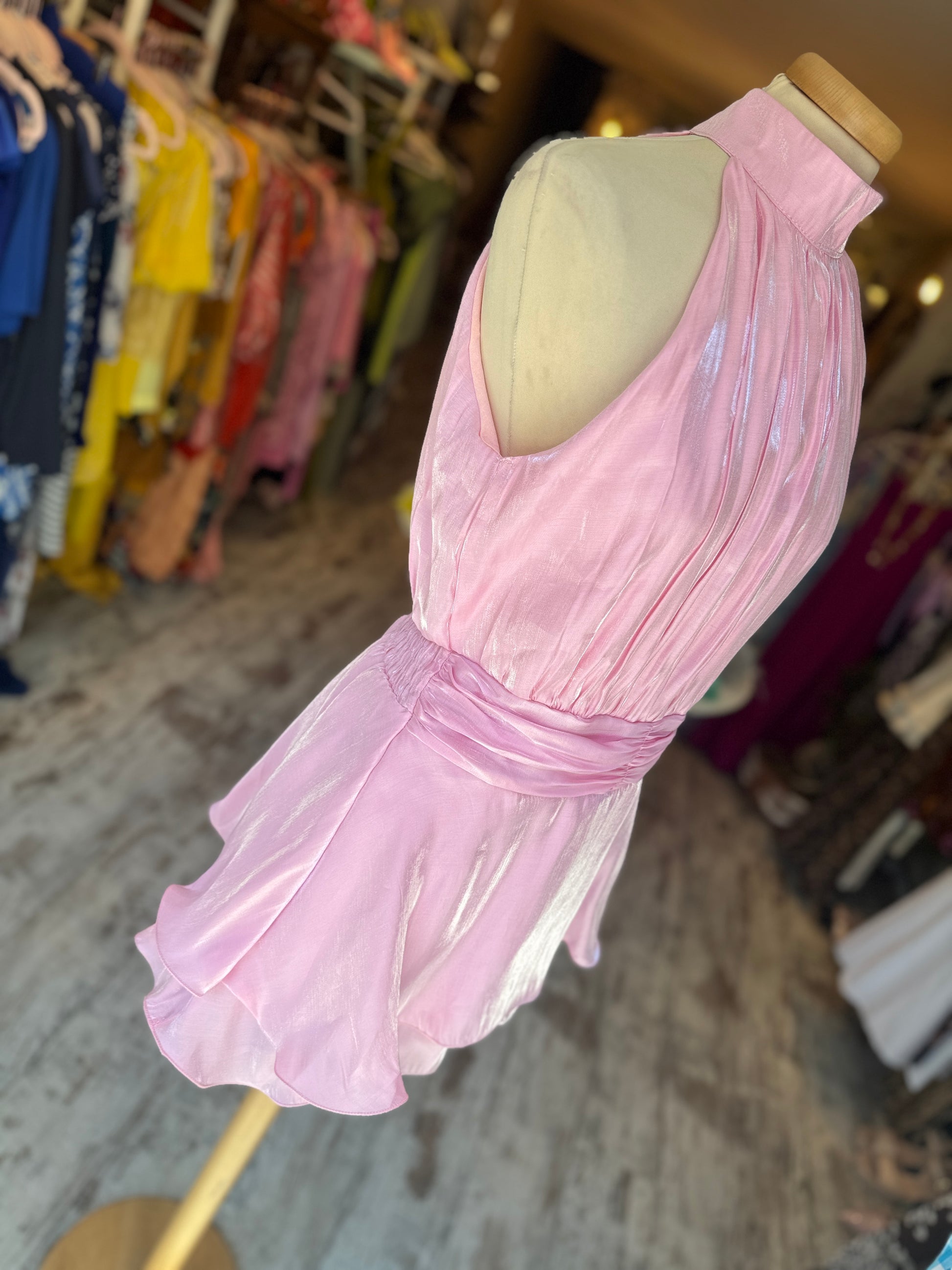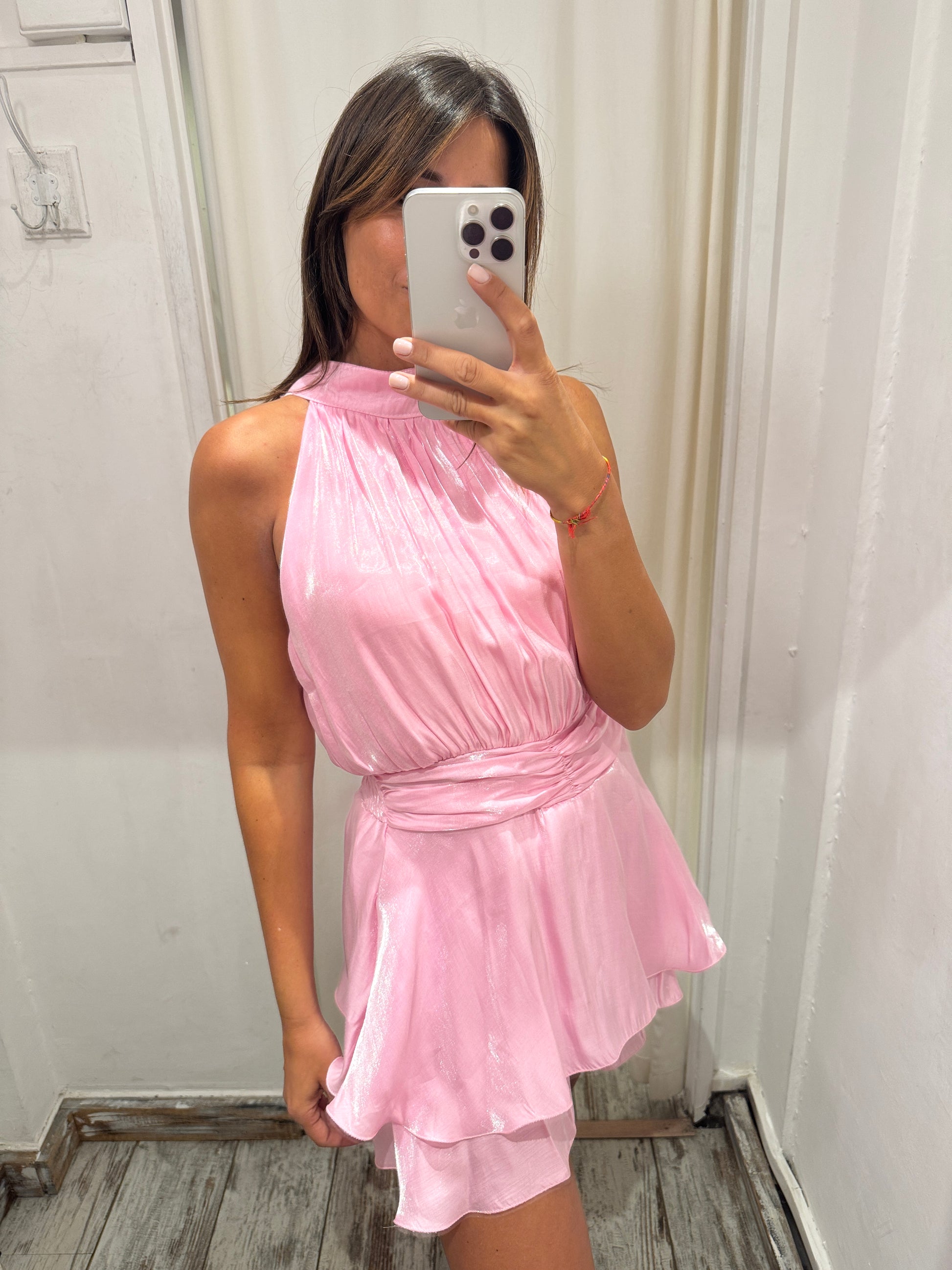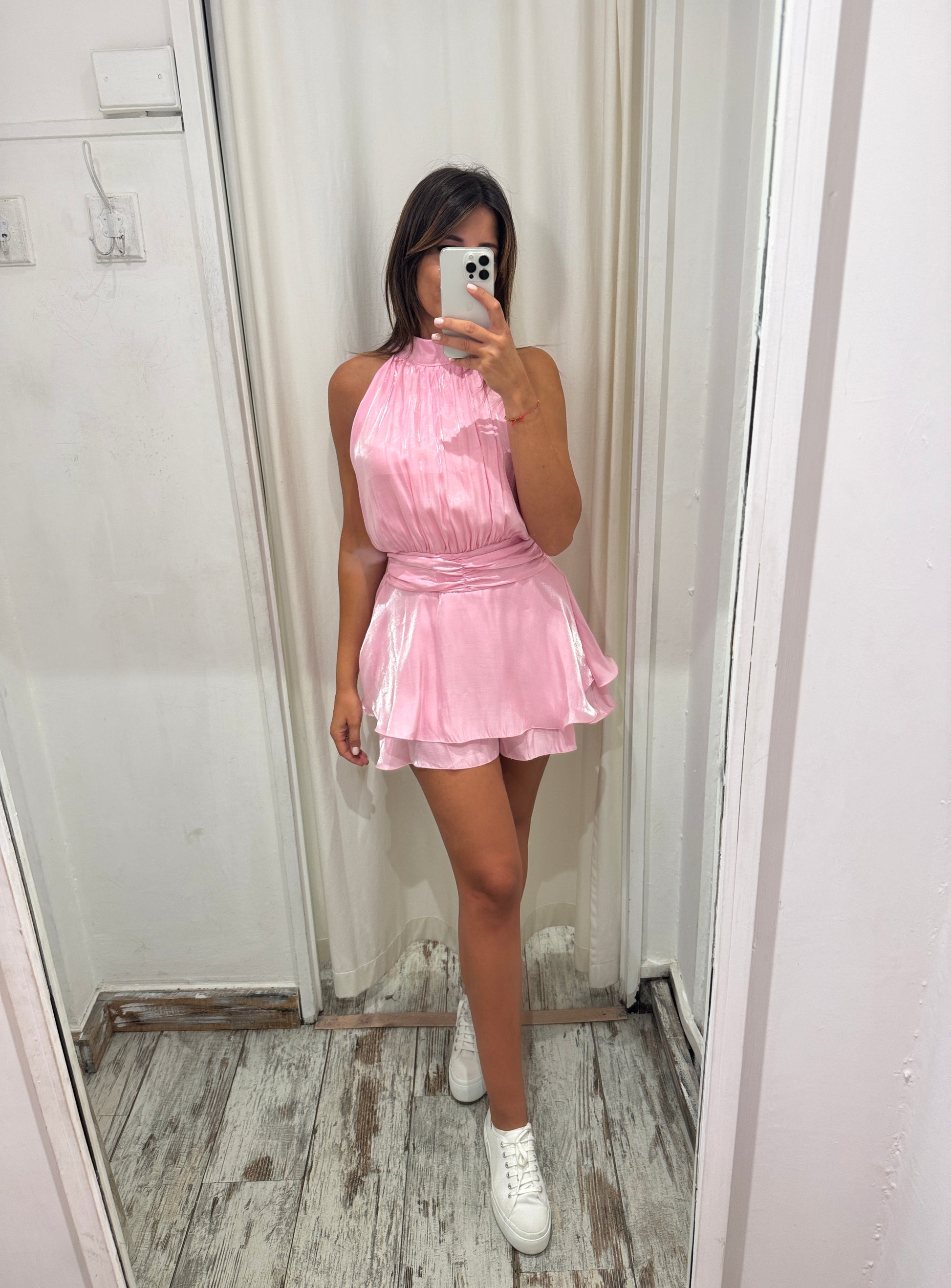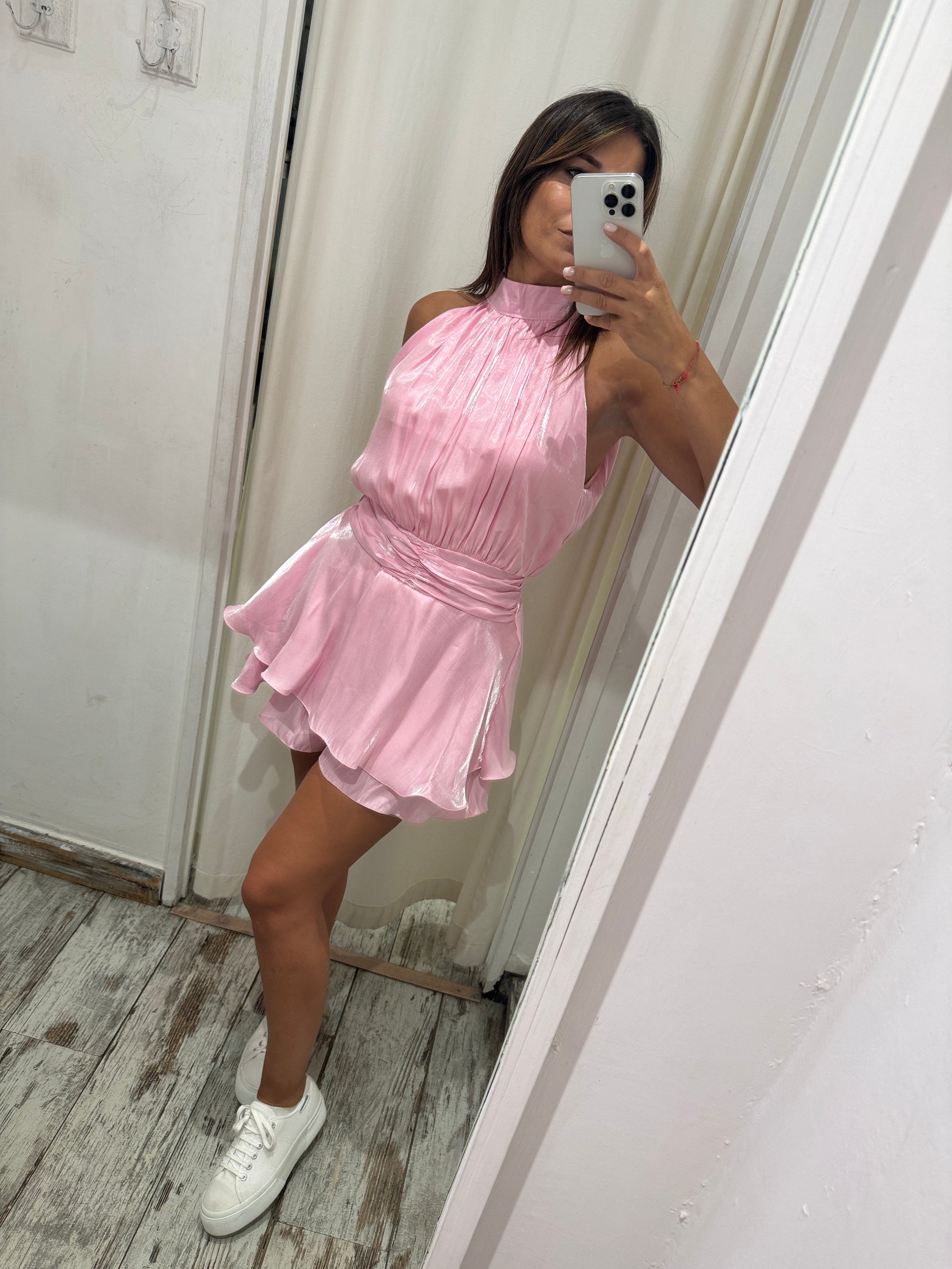 Abito corto con pantaloncino interno in tessuto satinato rosa e scollo all’americana.