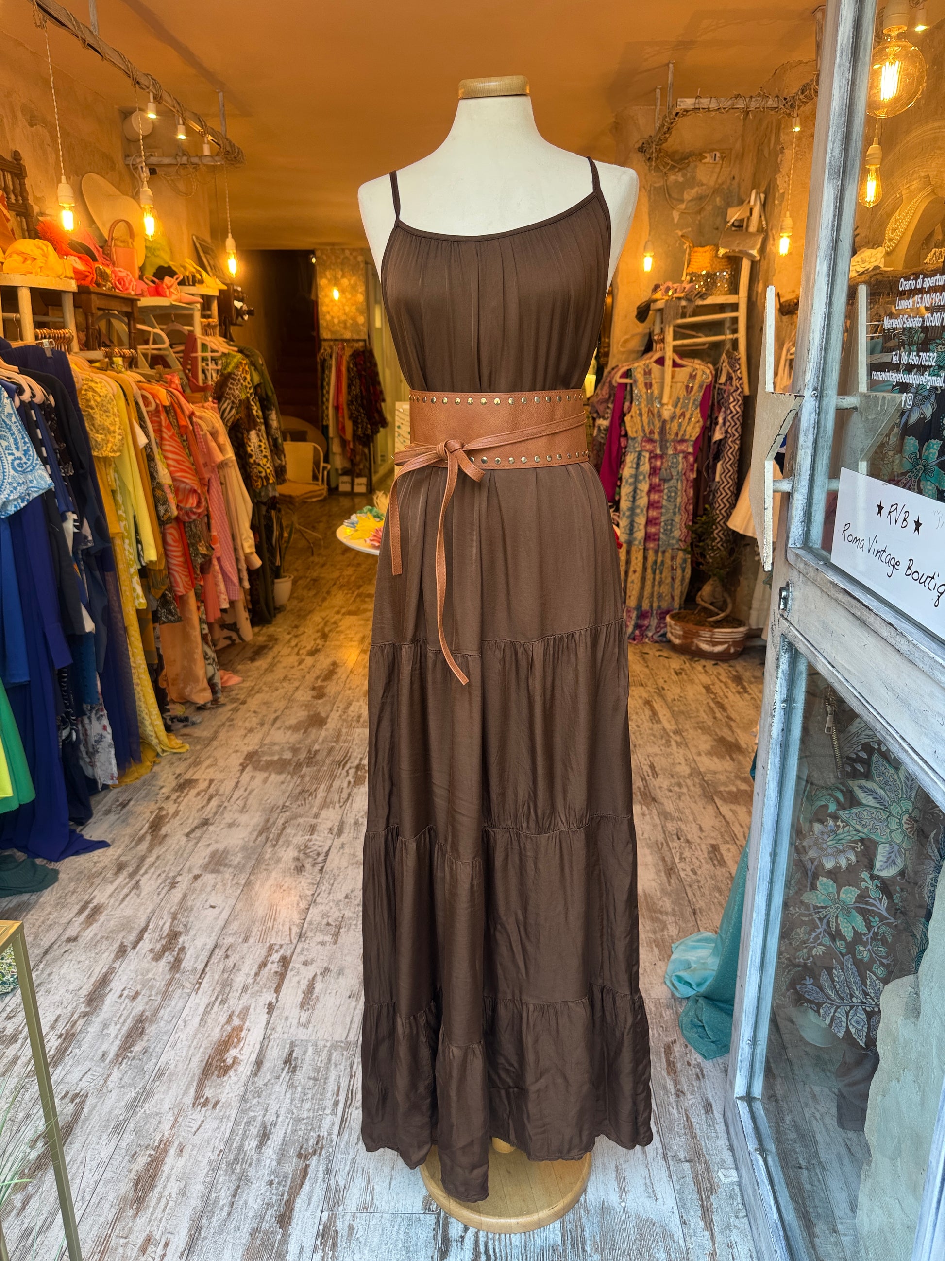 Abito lungo e ampio con bretelline satinato. Cintura vendita separatamente.