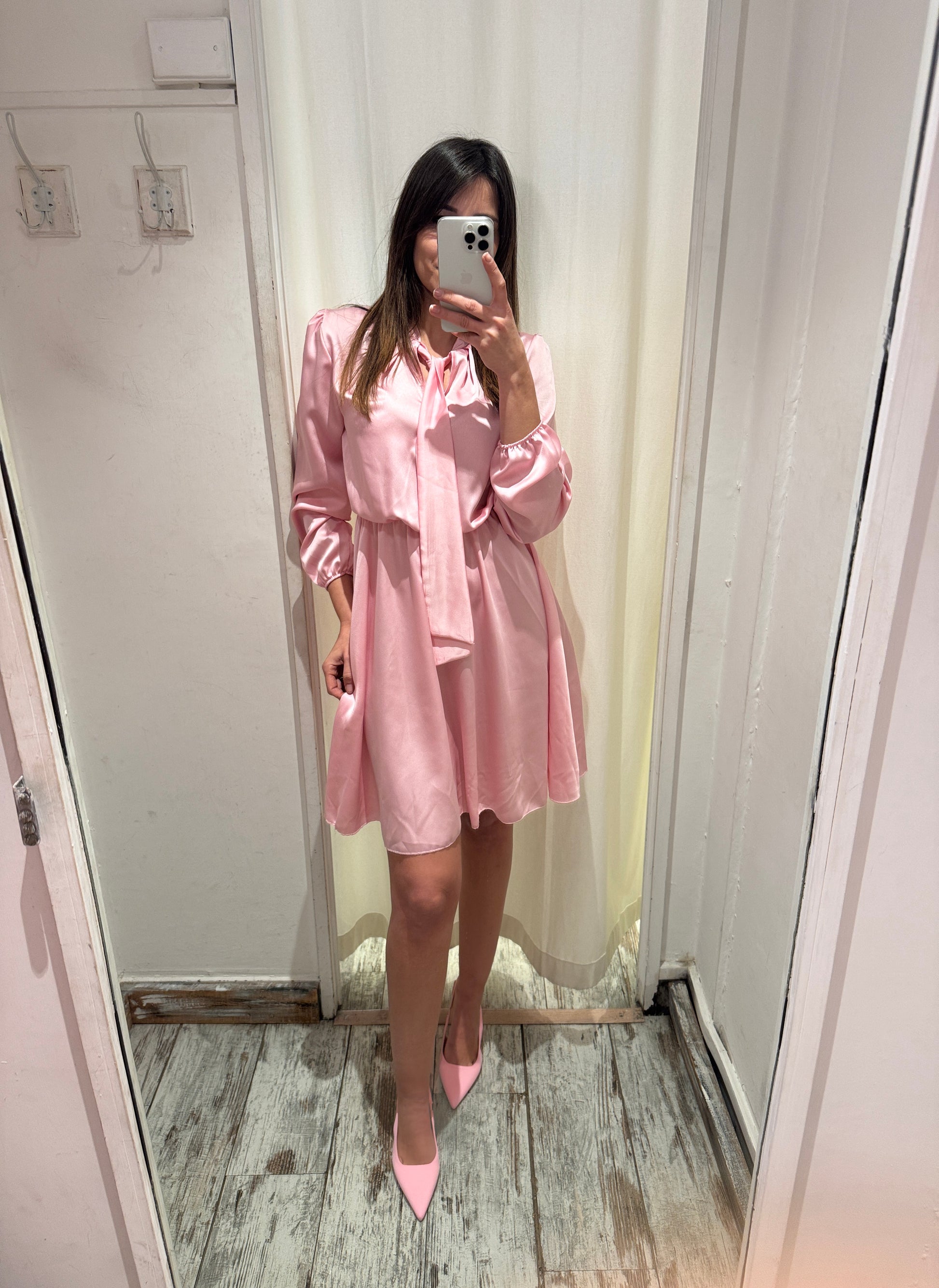 Abito satin rosa con scollo a V e fiocco al collo. Elastico in vita e manica leggermente a sbuffo