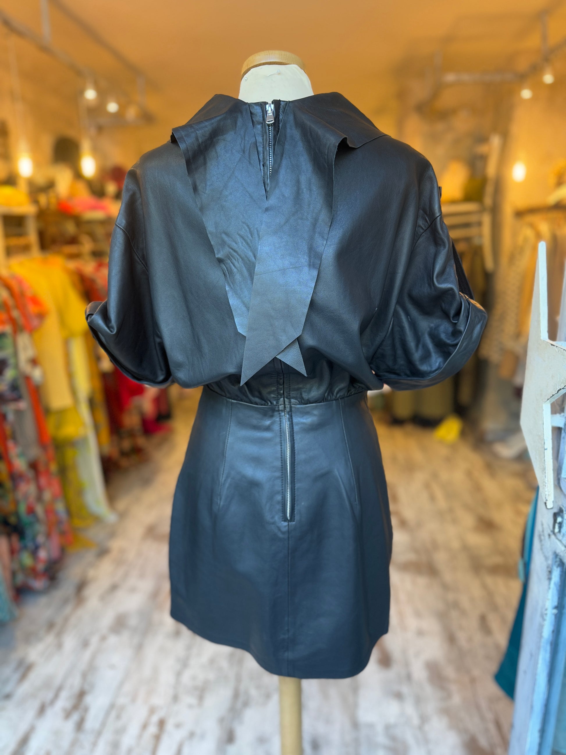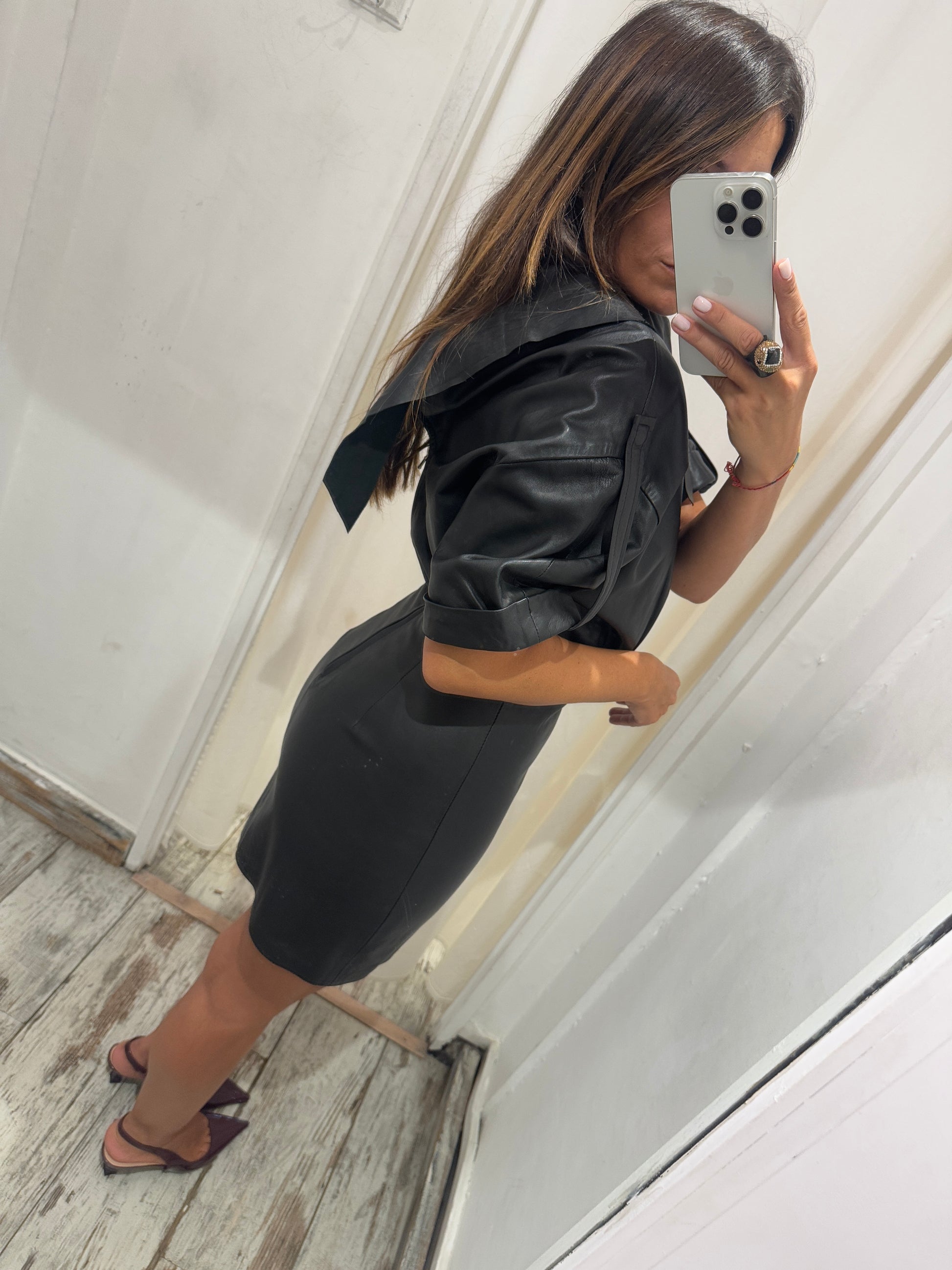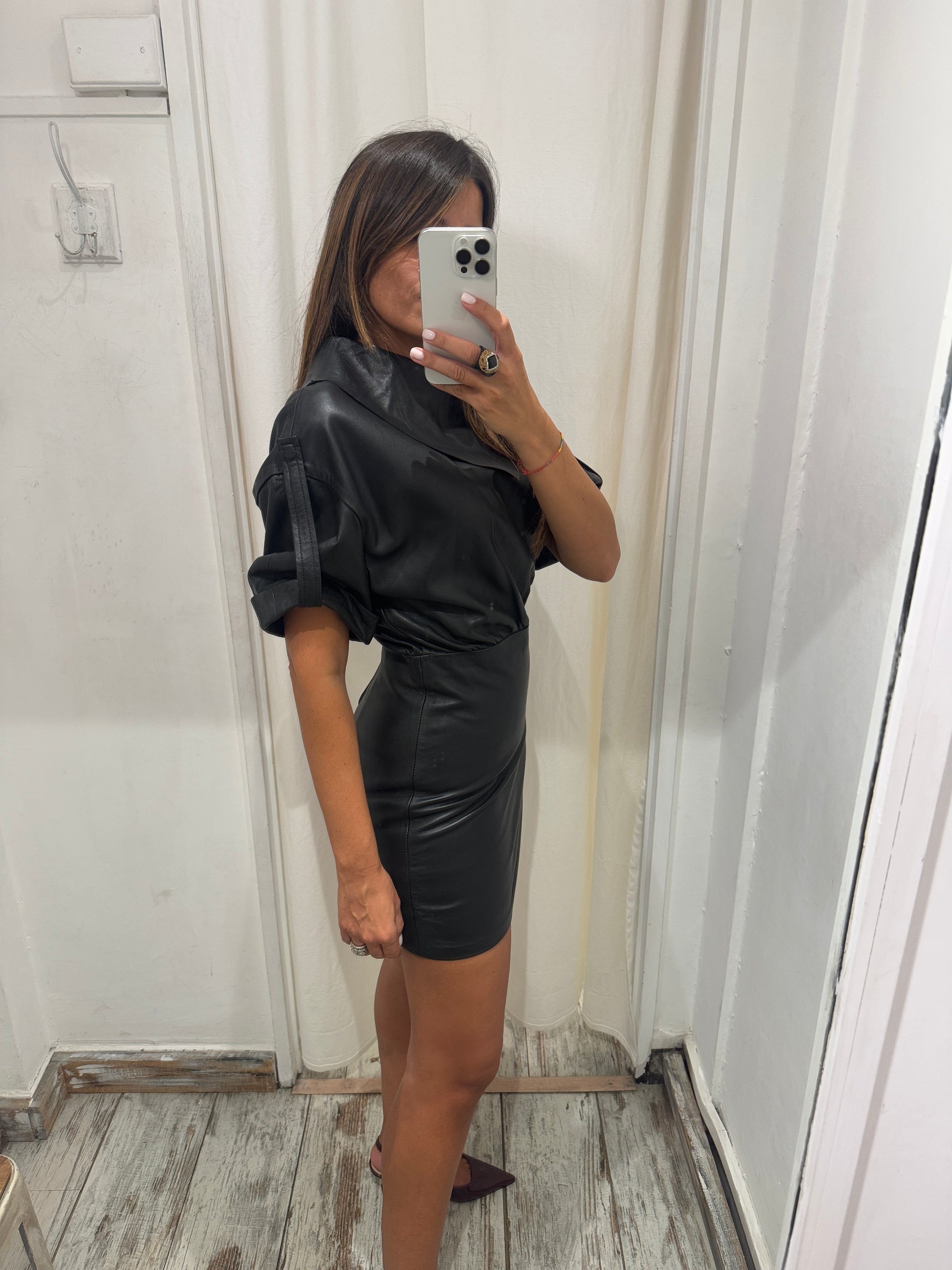 abito Zara in pelle ovina nero con bavero al collo e maniche corte con risvolto regolabile e zip posteriore a chiusura.