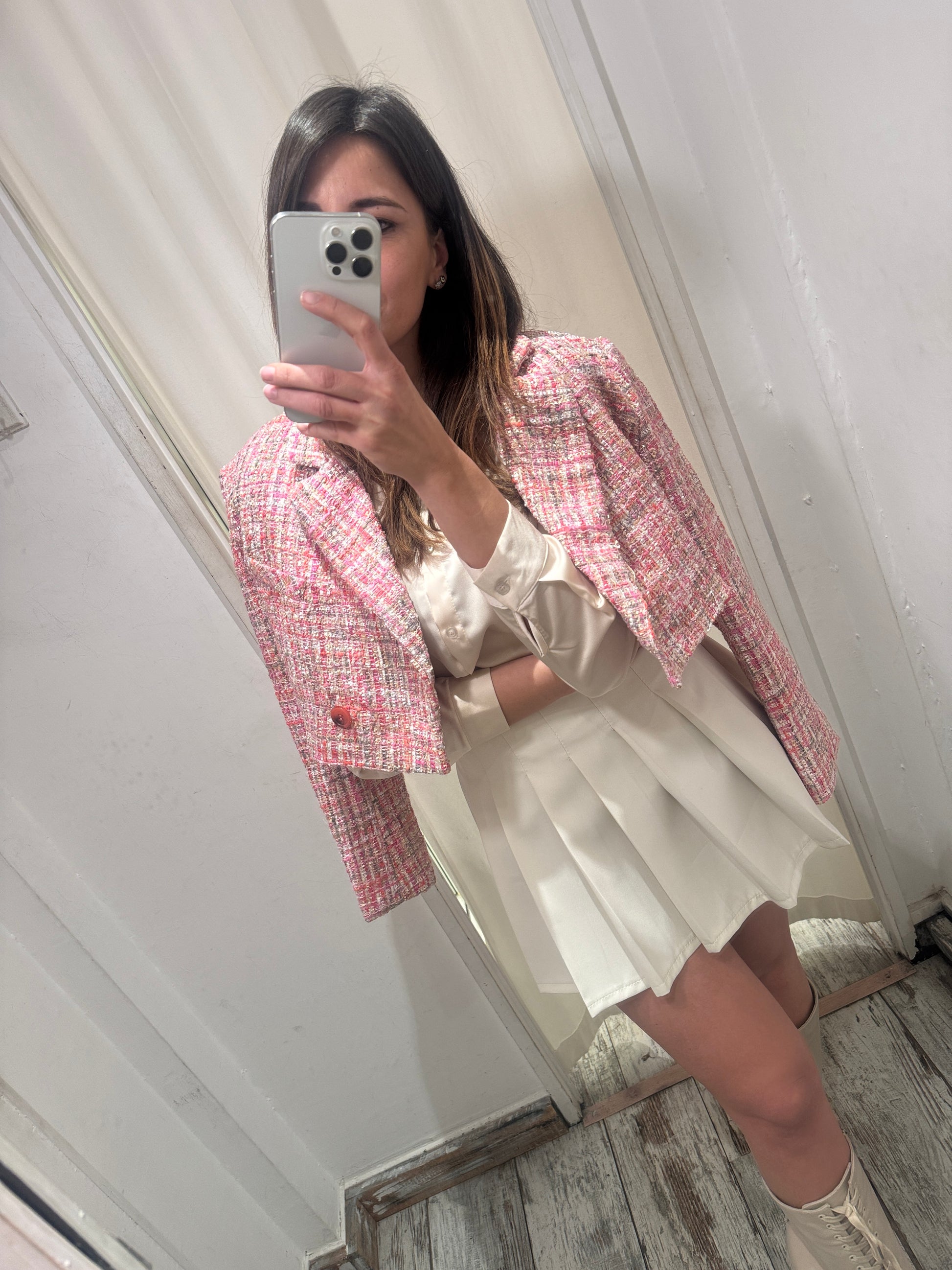 Blazer crop bouclè rosa monopetto con finta tasca con micro paillettes. Fodera fucsia in poliestere. spilla venduta separatamente