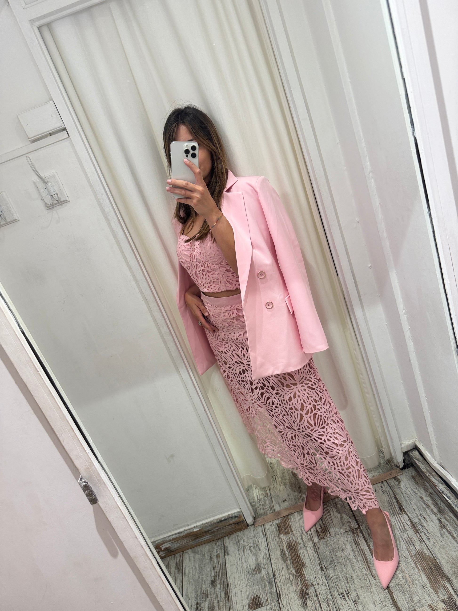 Blazer Le Robe taglio over rosa senza chiusura con bottoni rosa e oro. Tasche finte laterali e spalline.