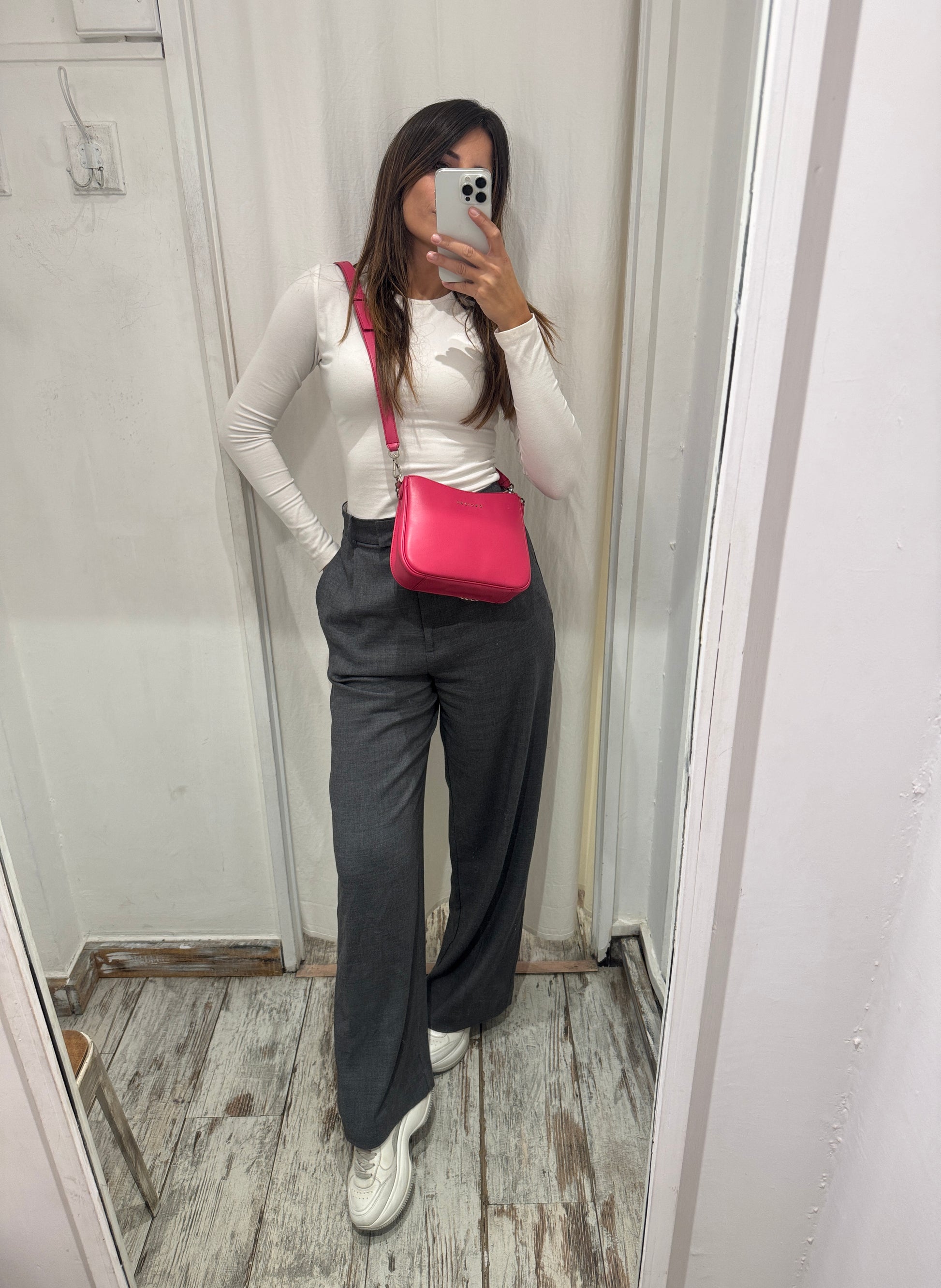 Borsa Orciani in pelle fucsia con tracollina in metallo argentato e tracolla in pelle regolabile e removibile. Taschina interna e esterna. Chiusura zip