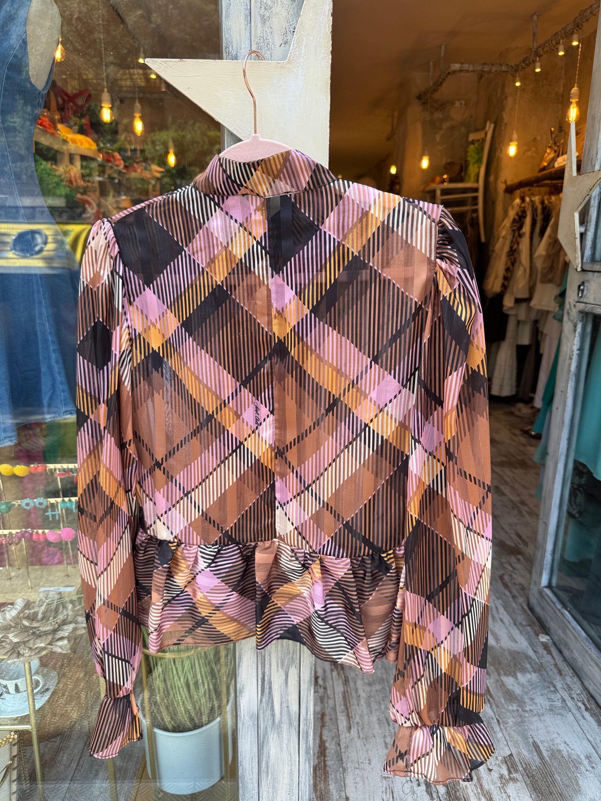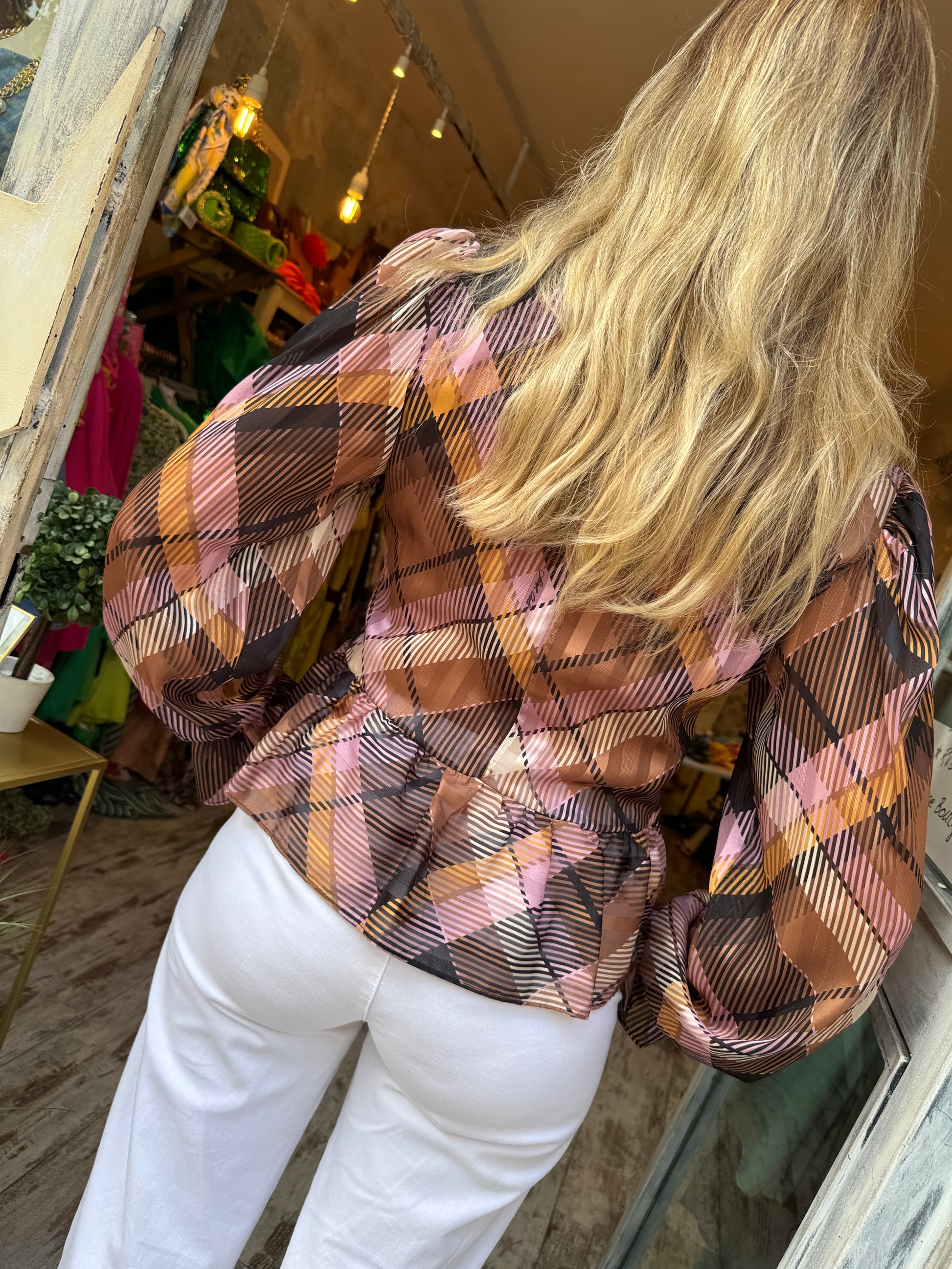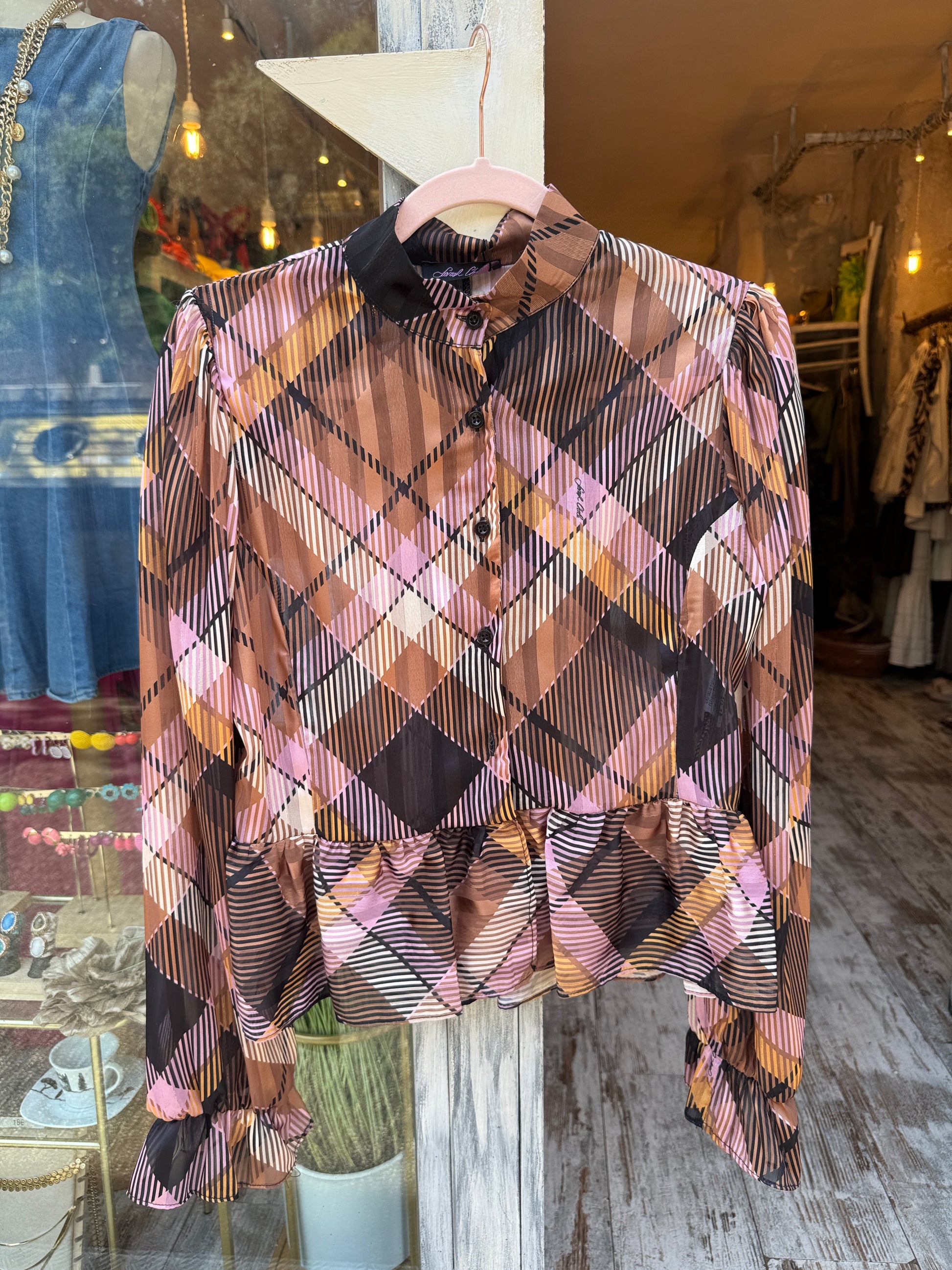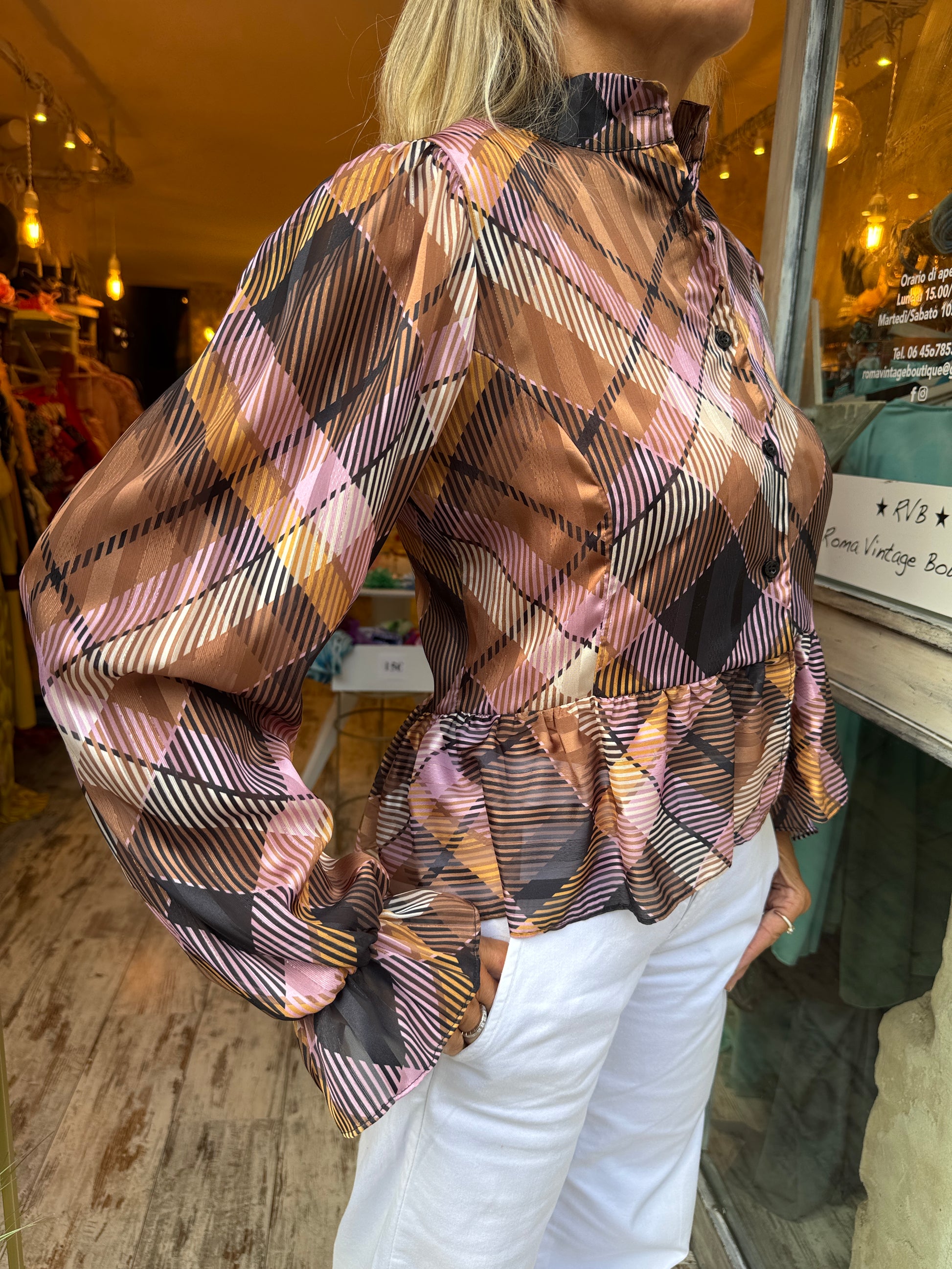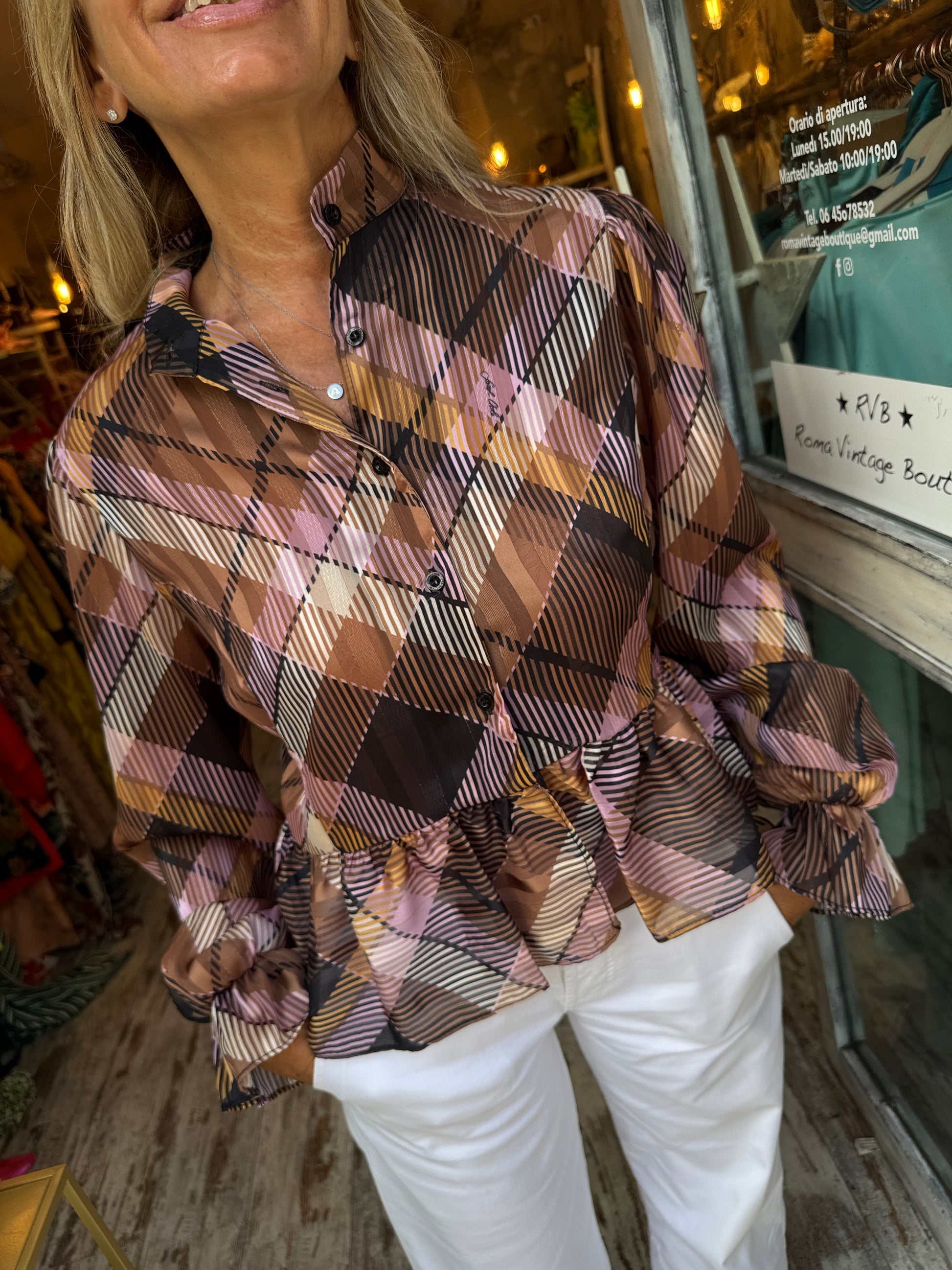 camicia fantasia scozzese grande multicolore con inserti laminati. Balza sul punto vita. Collo alla corena e polsini elasticizzati con rouches.