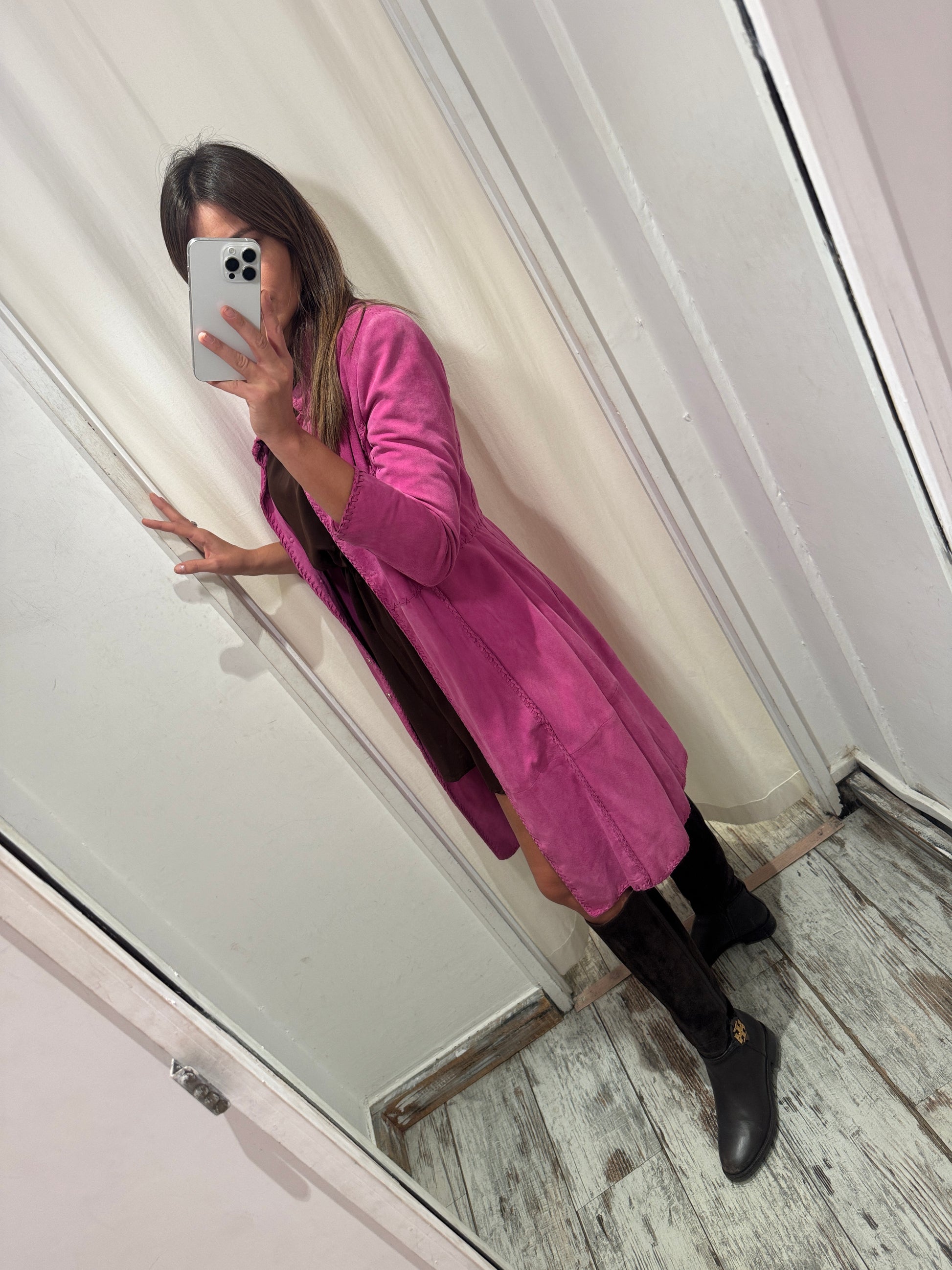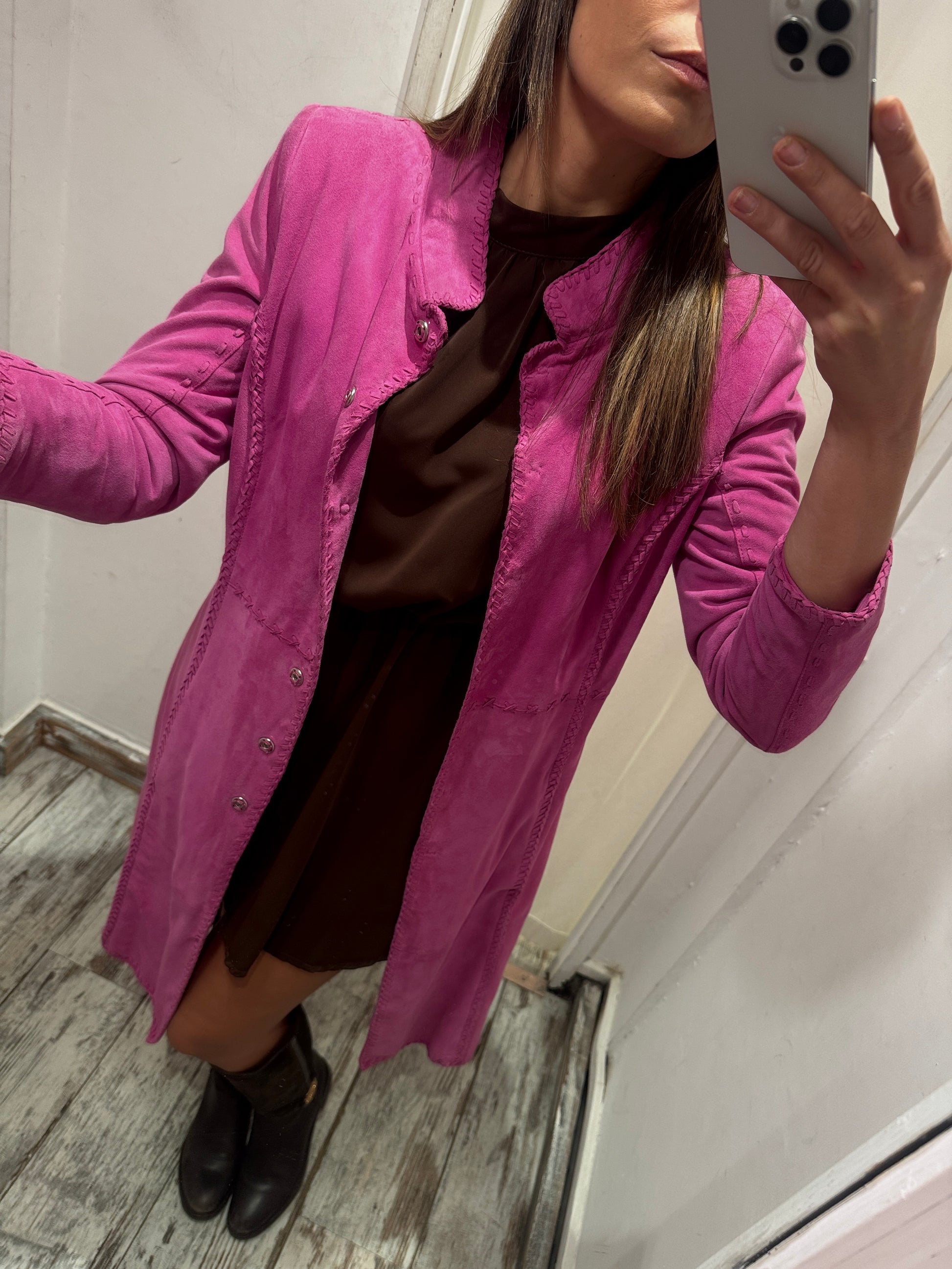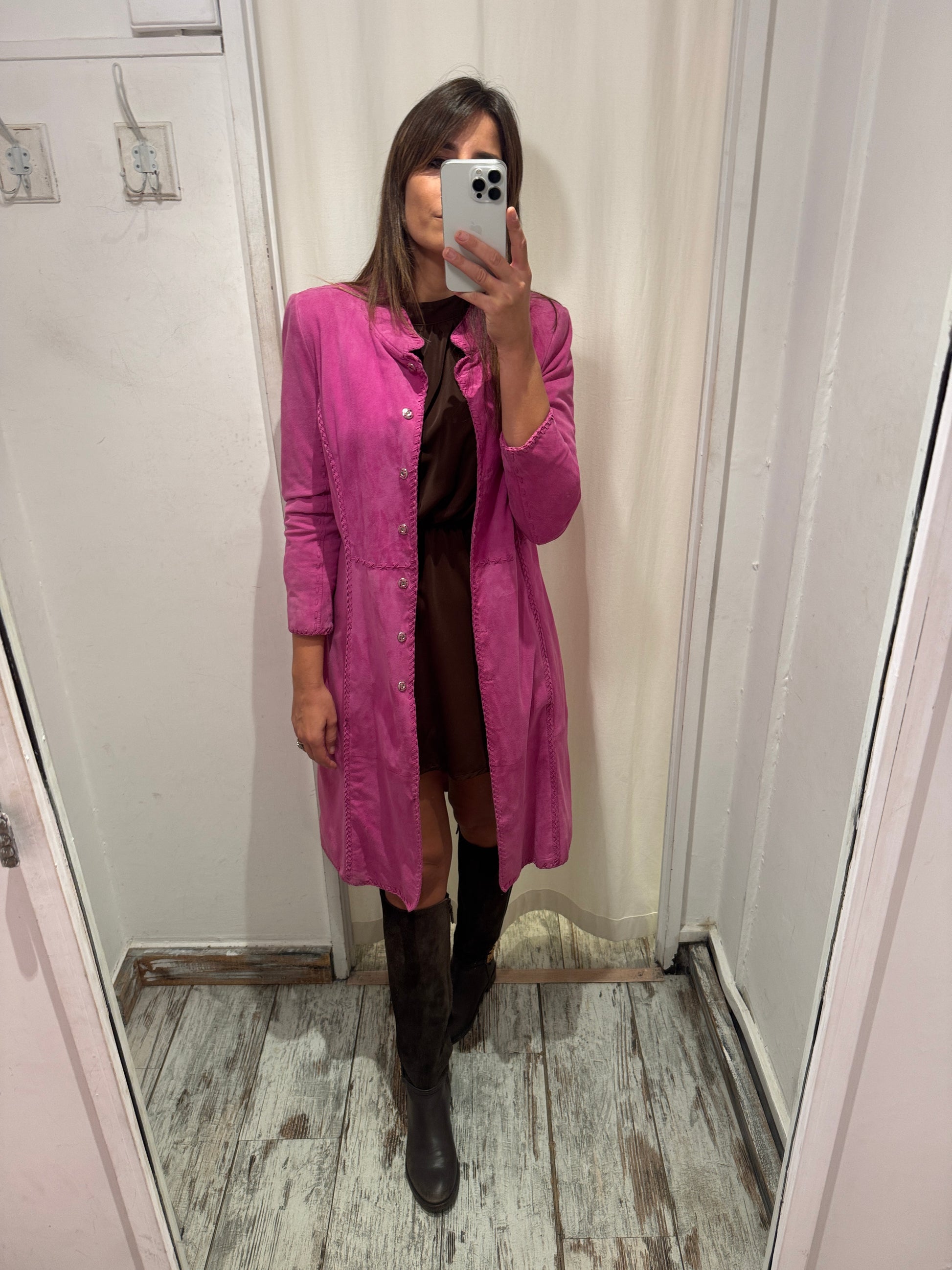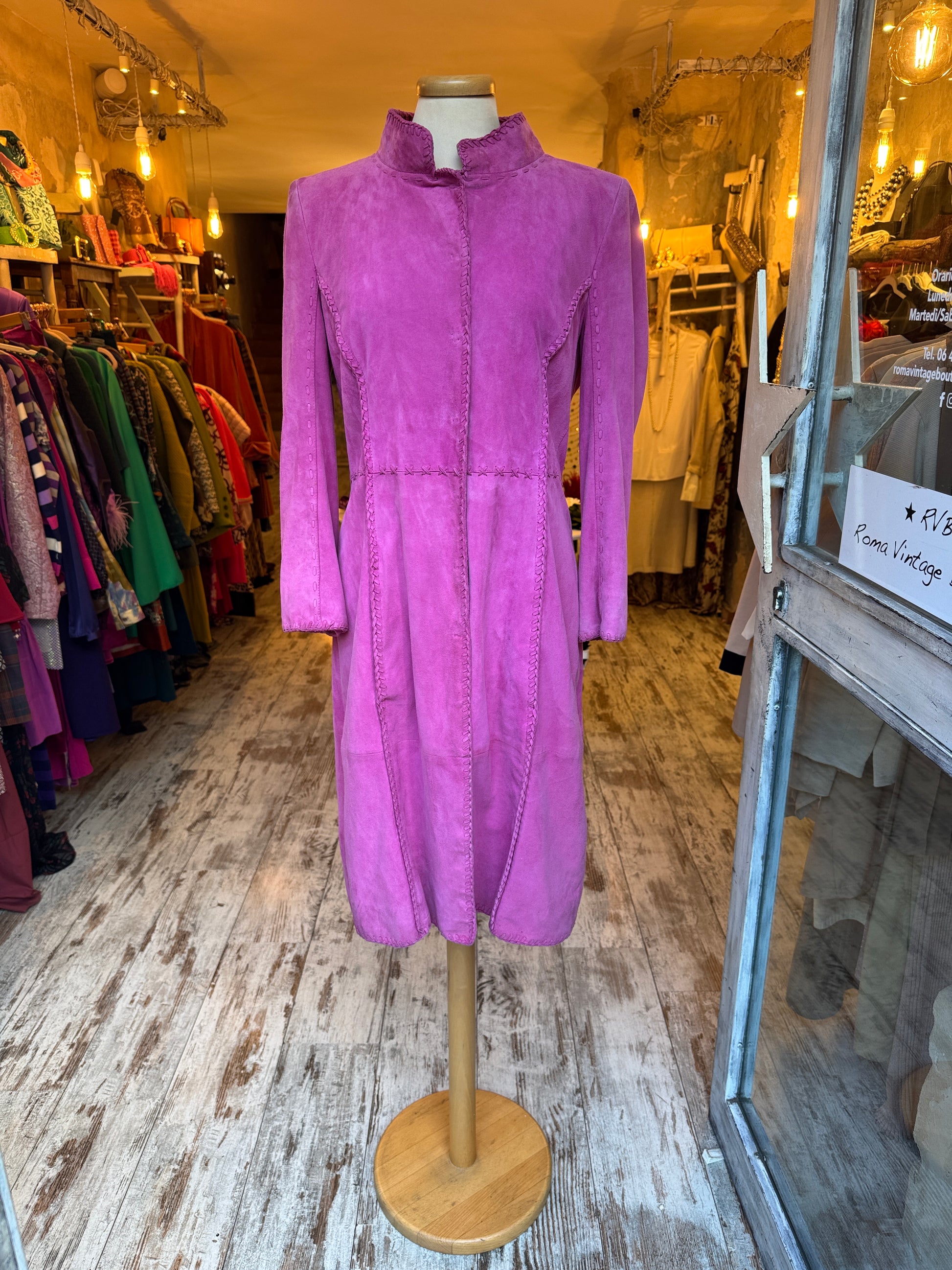 Cappottino Philosophy by Alberta Ferretti color ciclamino in pelle di capra con colletto alla coreana e inserti intrecciati. Chiusura con bottoni a clip e fodera intera color ciclamino.