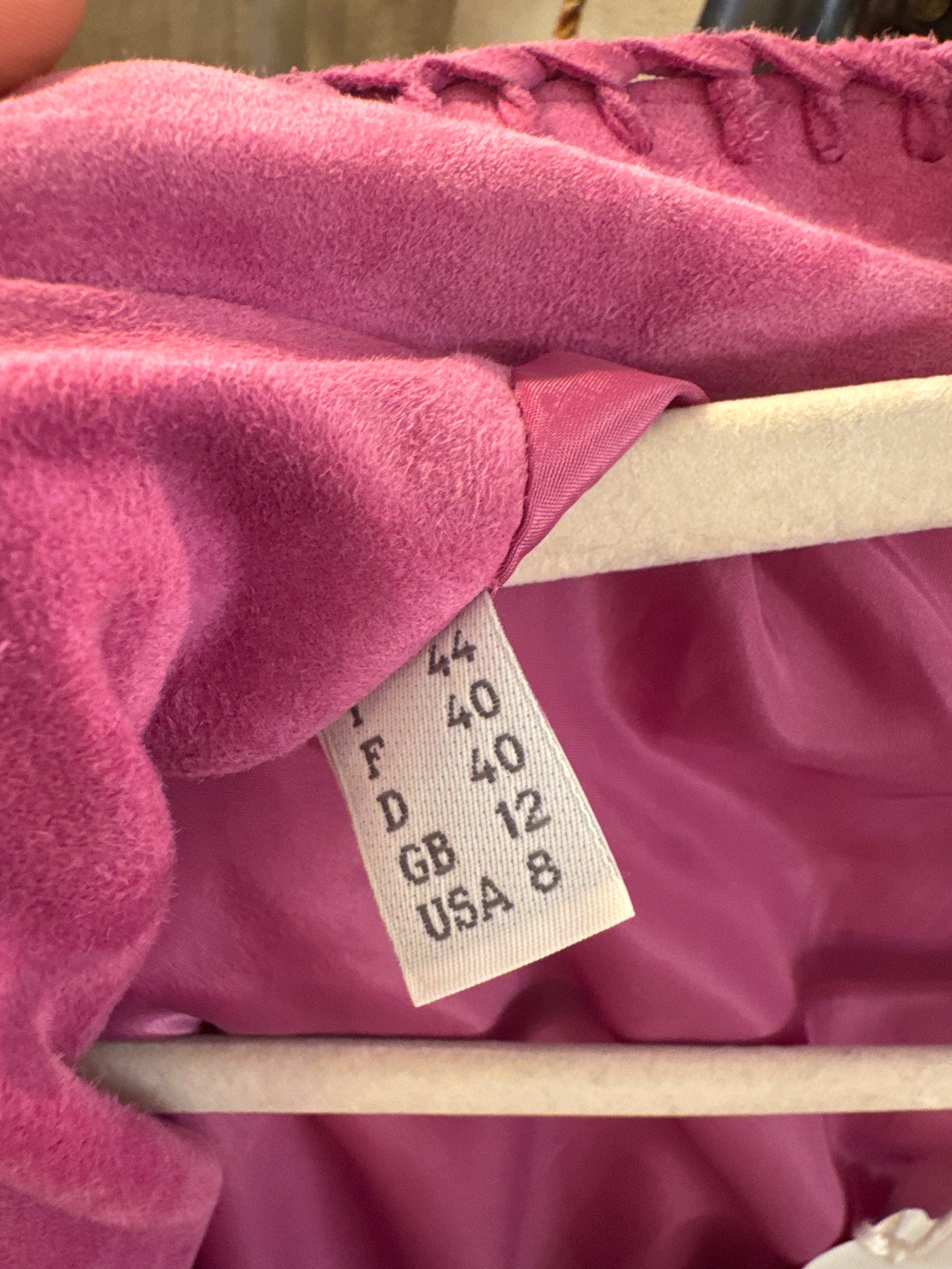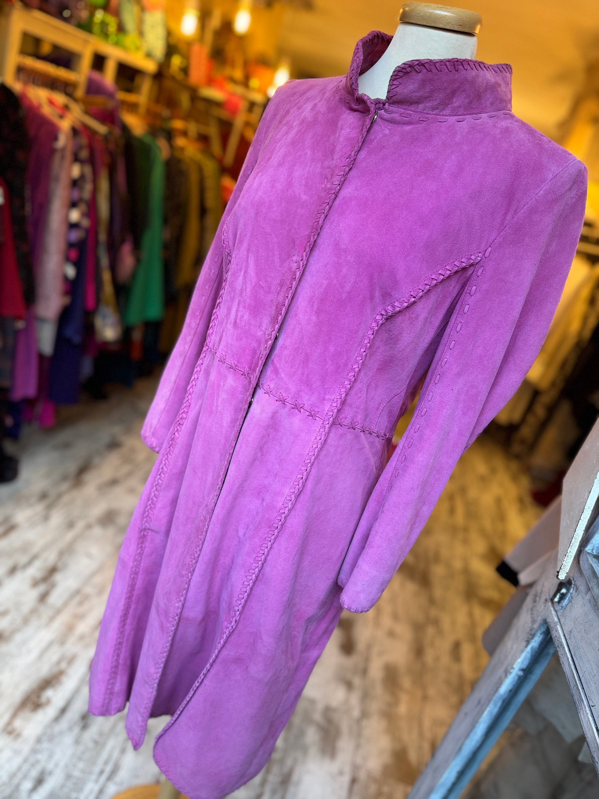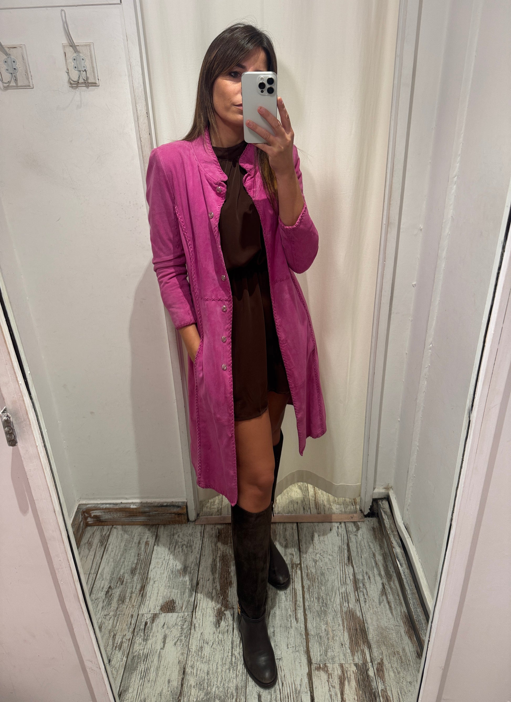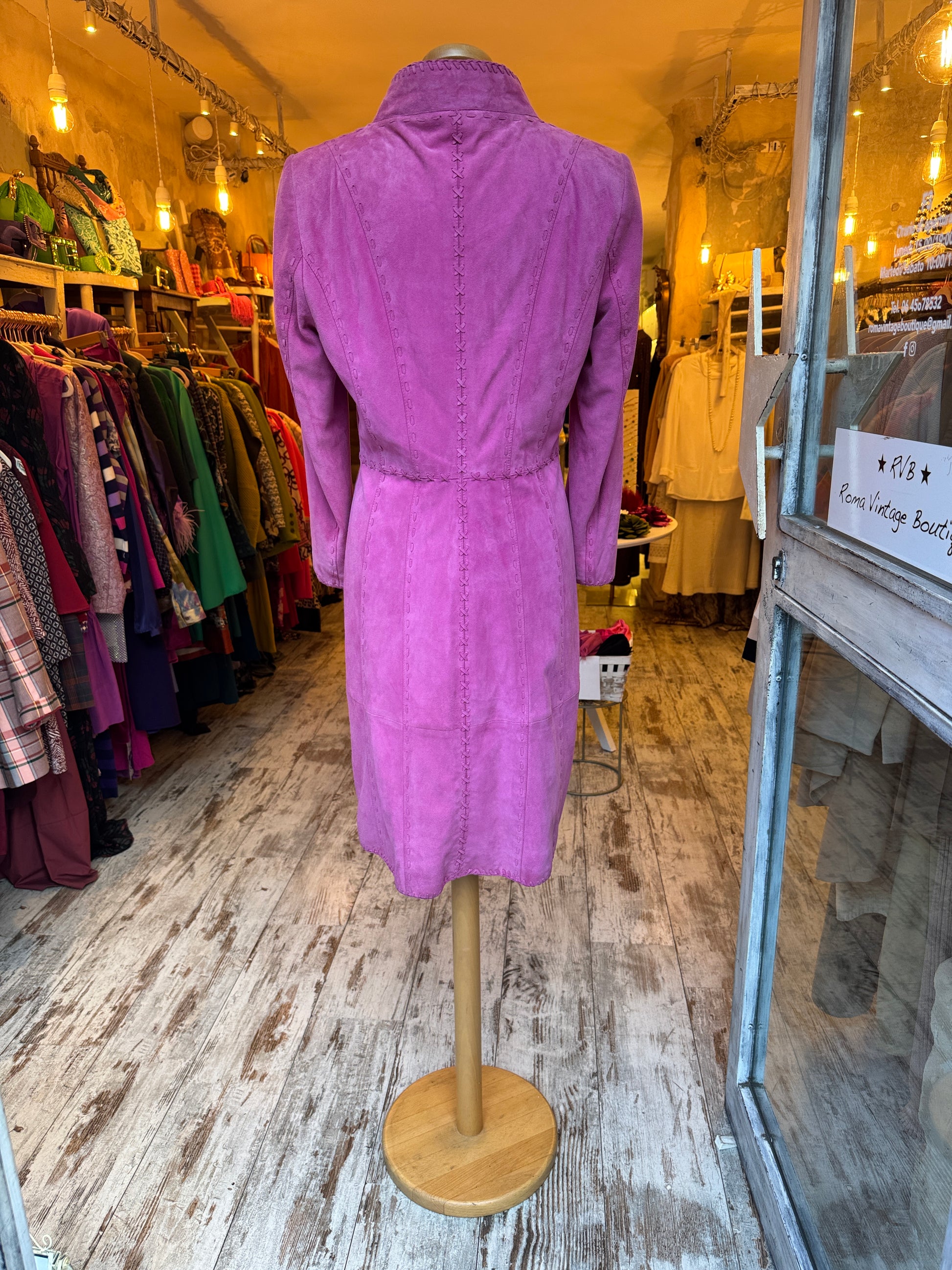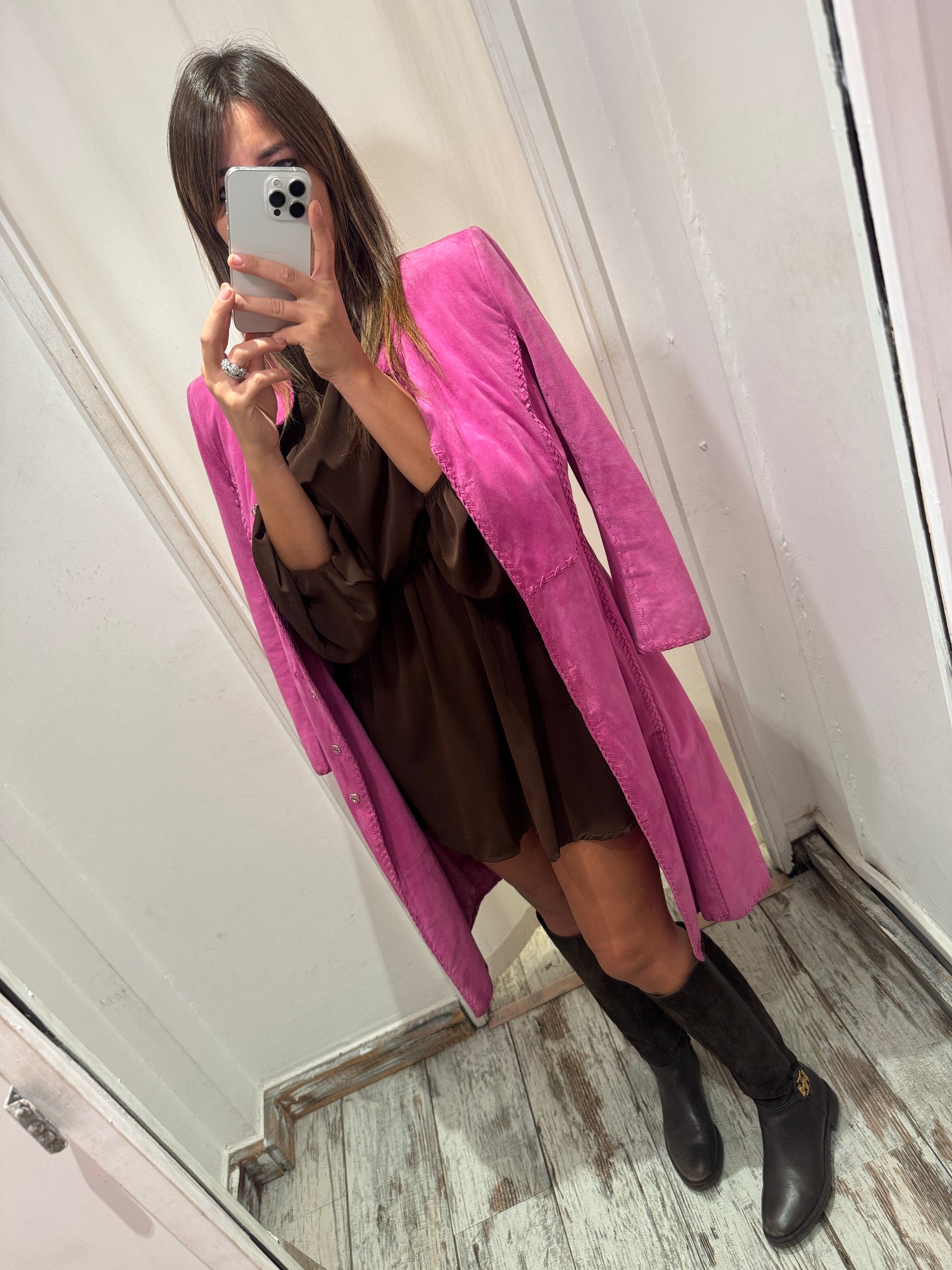 Cappottino Philosophy by Alberta Ferretti color ciclamino in pelle di capra con colletto alla coreana e inserti intrecciati. Chiusura con bottoni a clip e fodera intera color ciclamino.