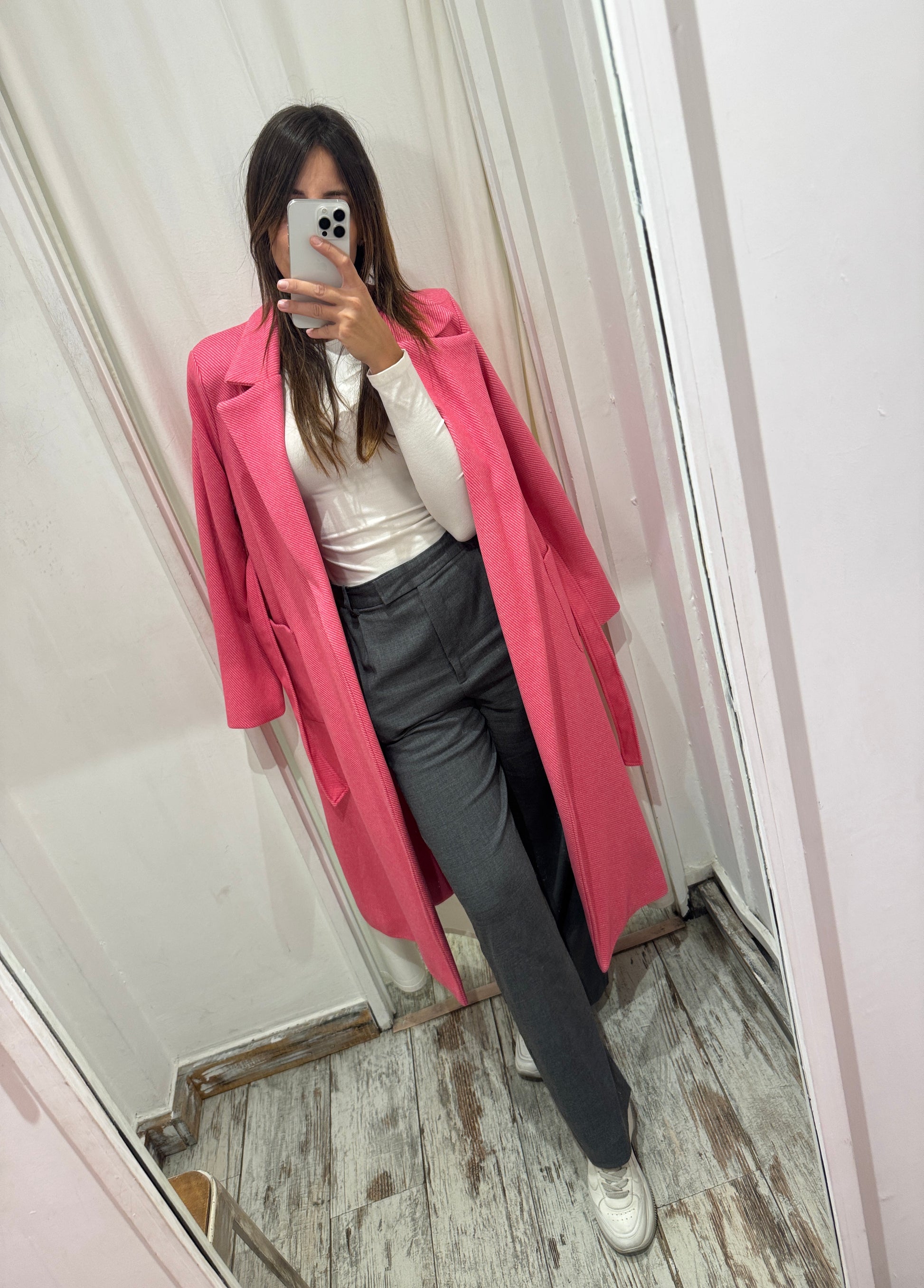 Cappotto modello a vestaglia rosa barbie con cintura removibile e tasconi frontali. Foderato