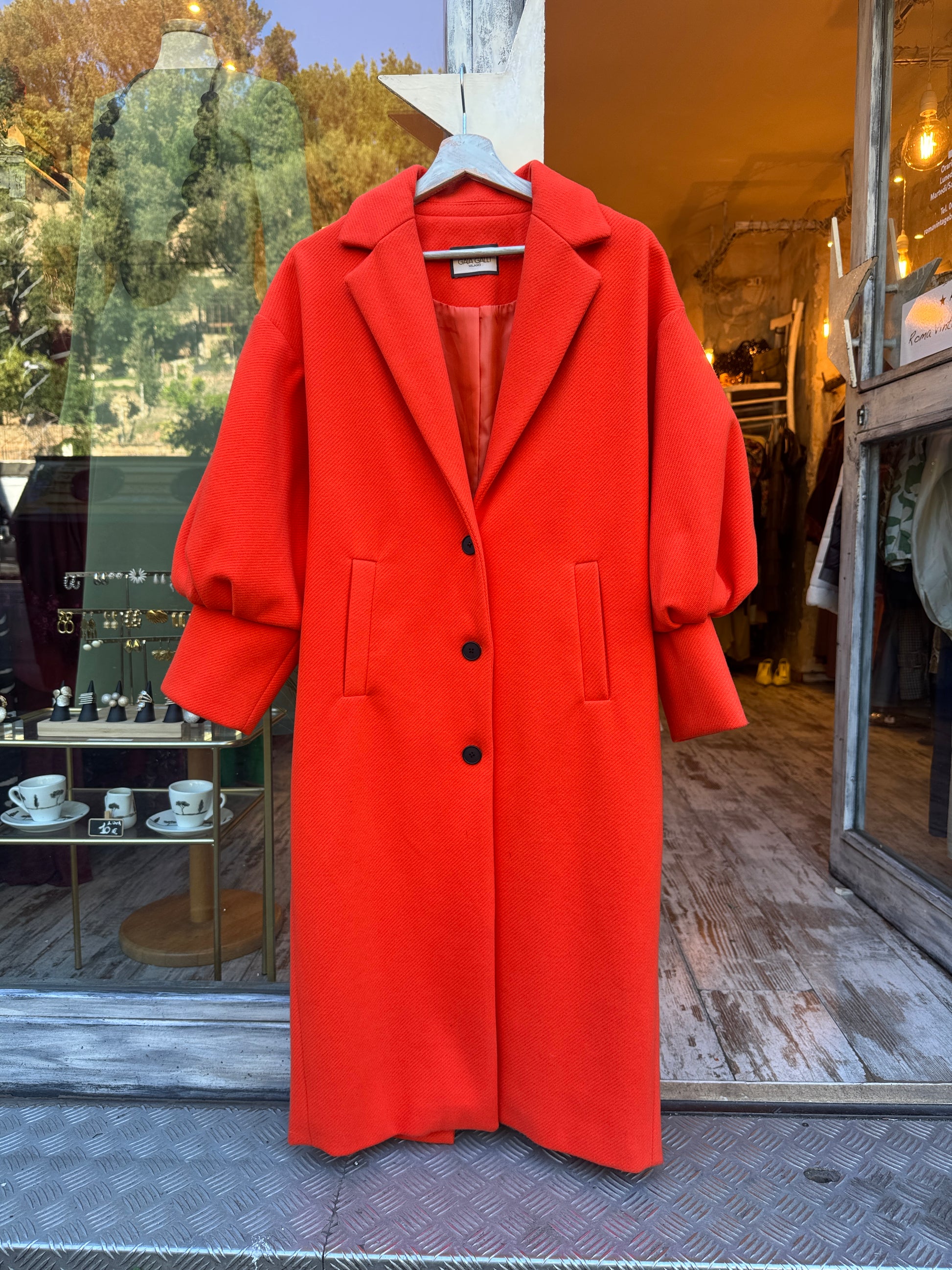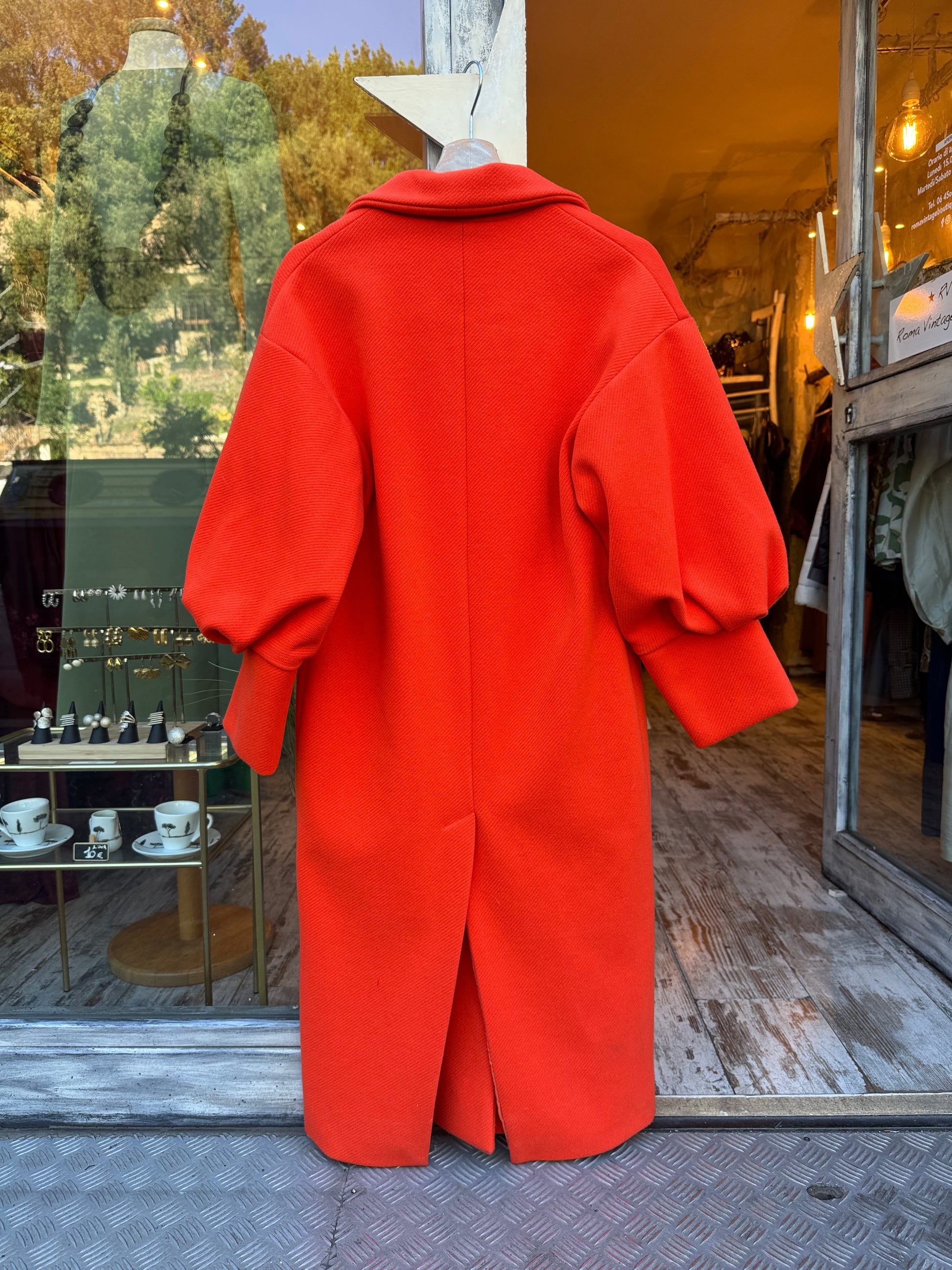 Cappotto Gaia Galli arancione con maniche a 3/4 a palloncino. Spalla scesa. Bottoni neri e tasche
