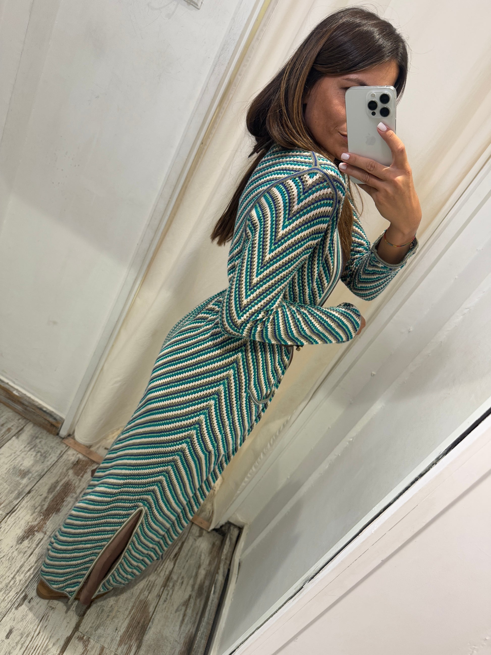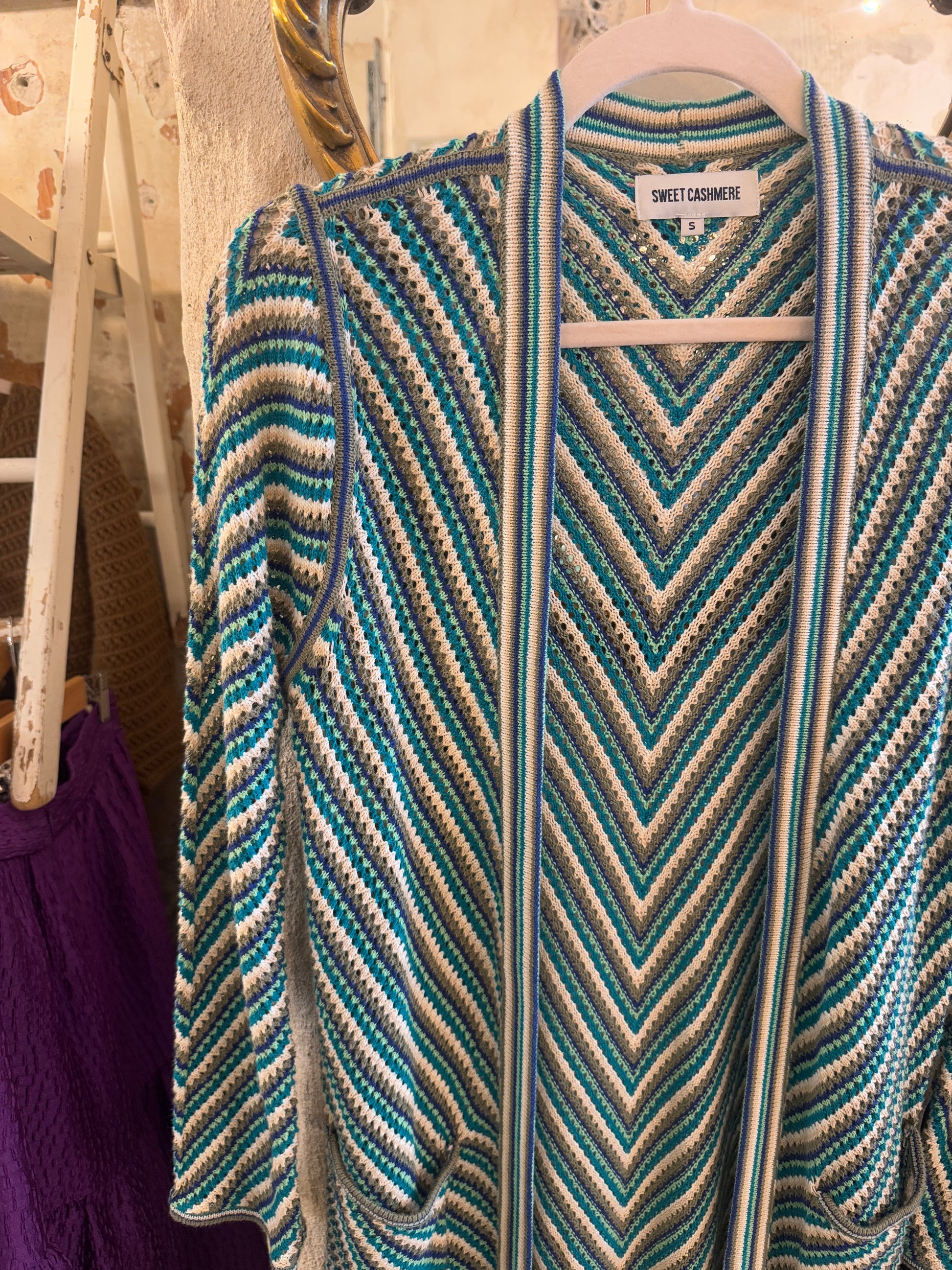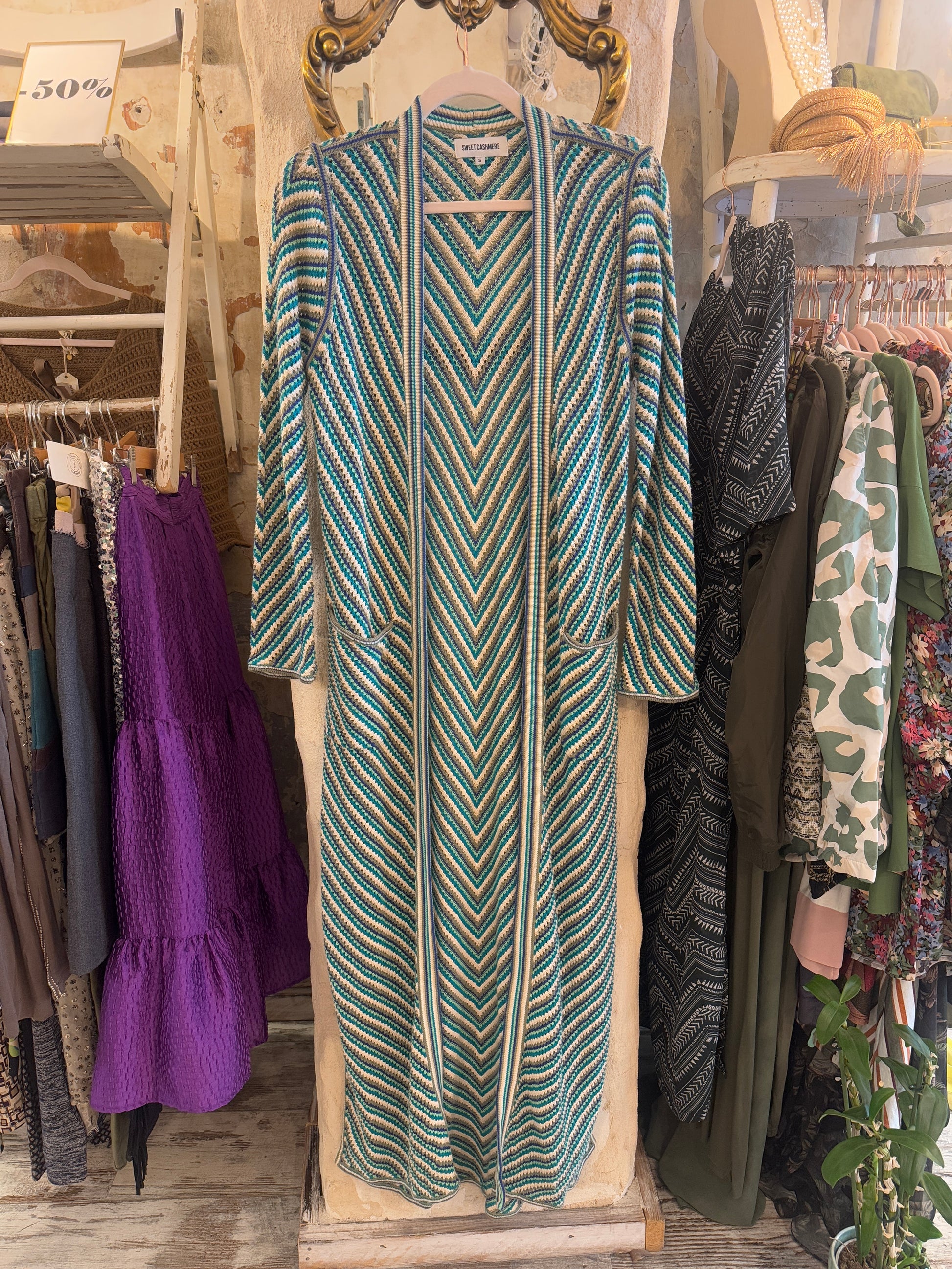 cardigan lungo in maglia multicolore senza chiusure con tasche.