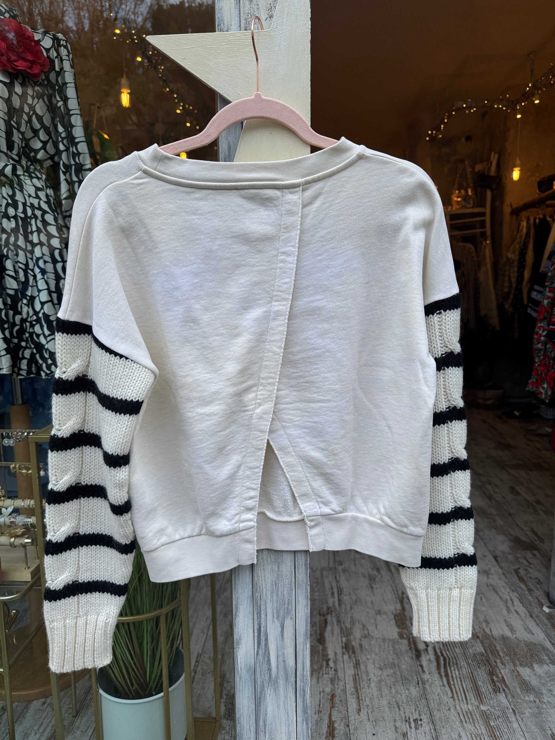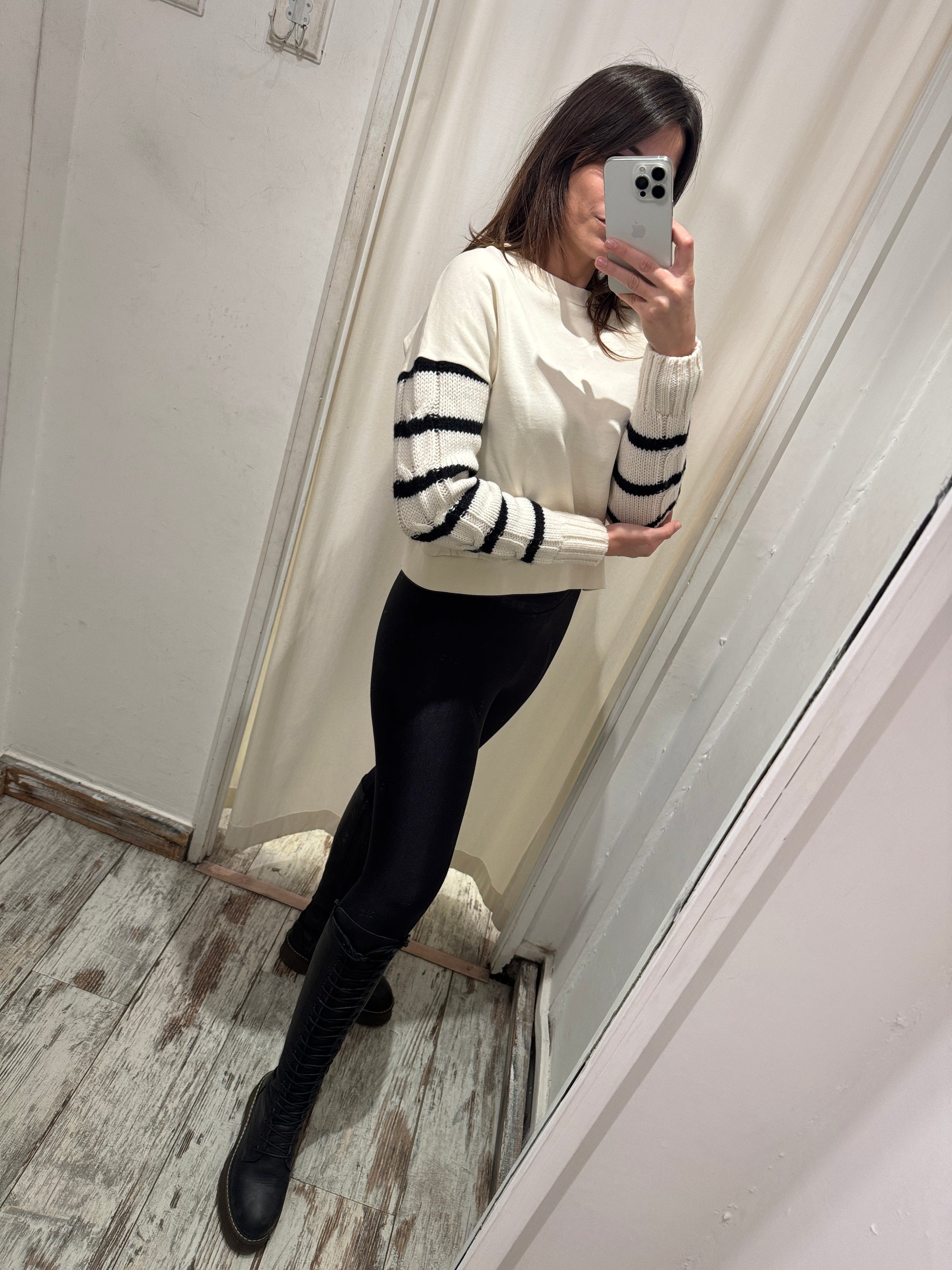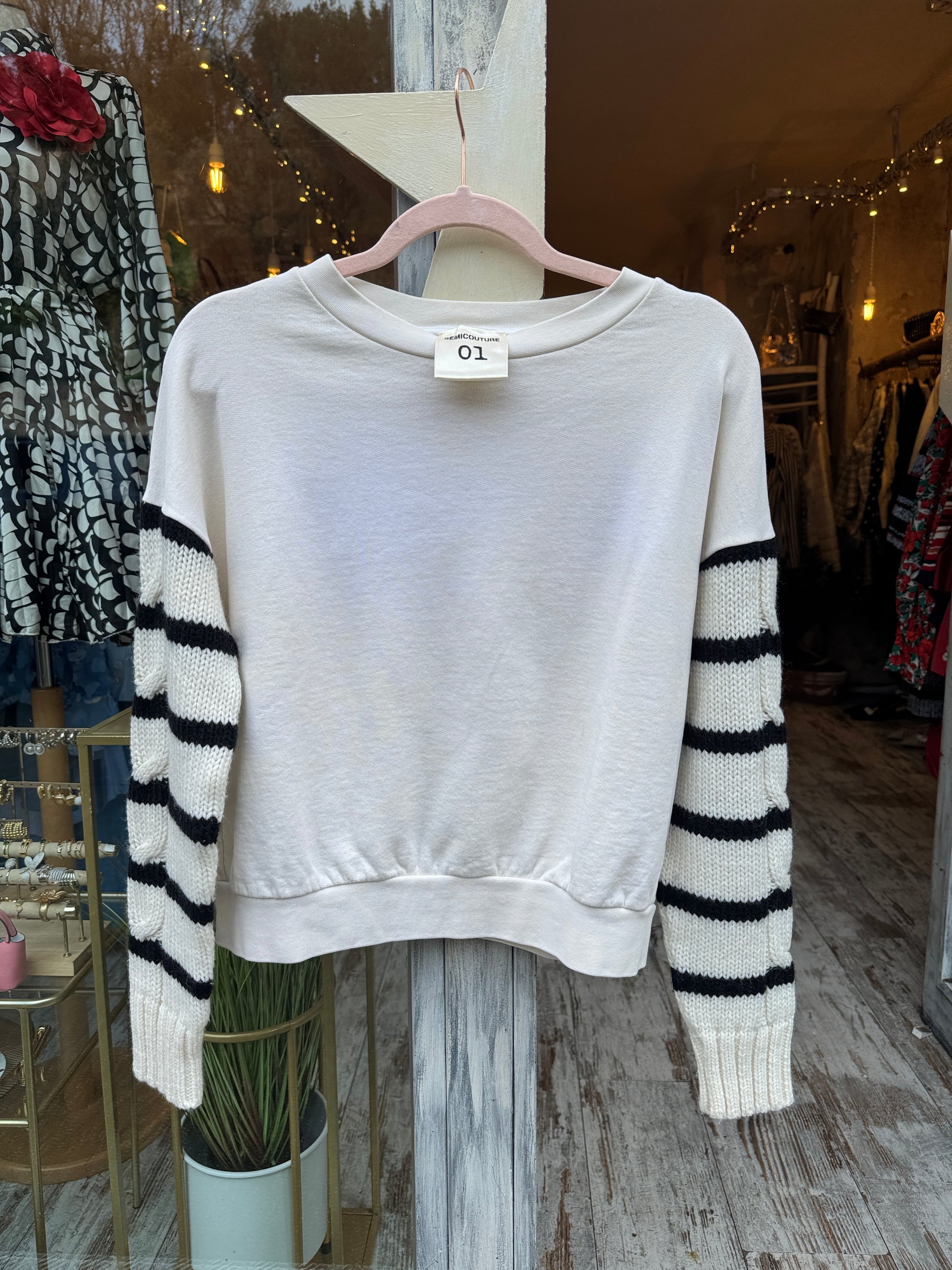 Felpa Semicouture panna con maniche in lana a righe. Spacchetto posteriore.