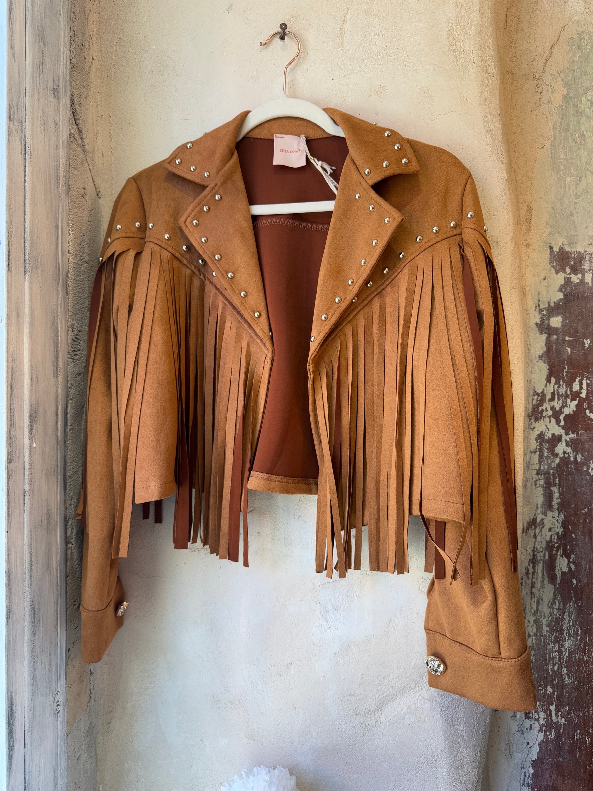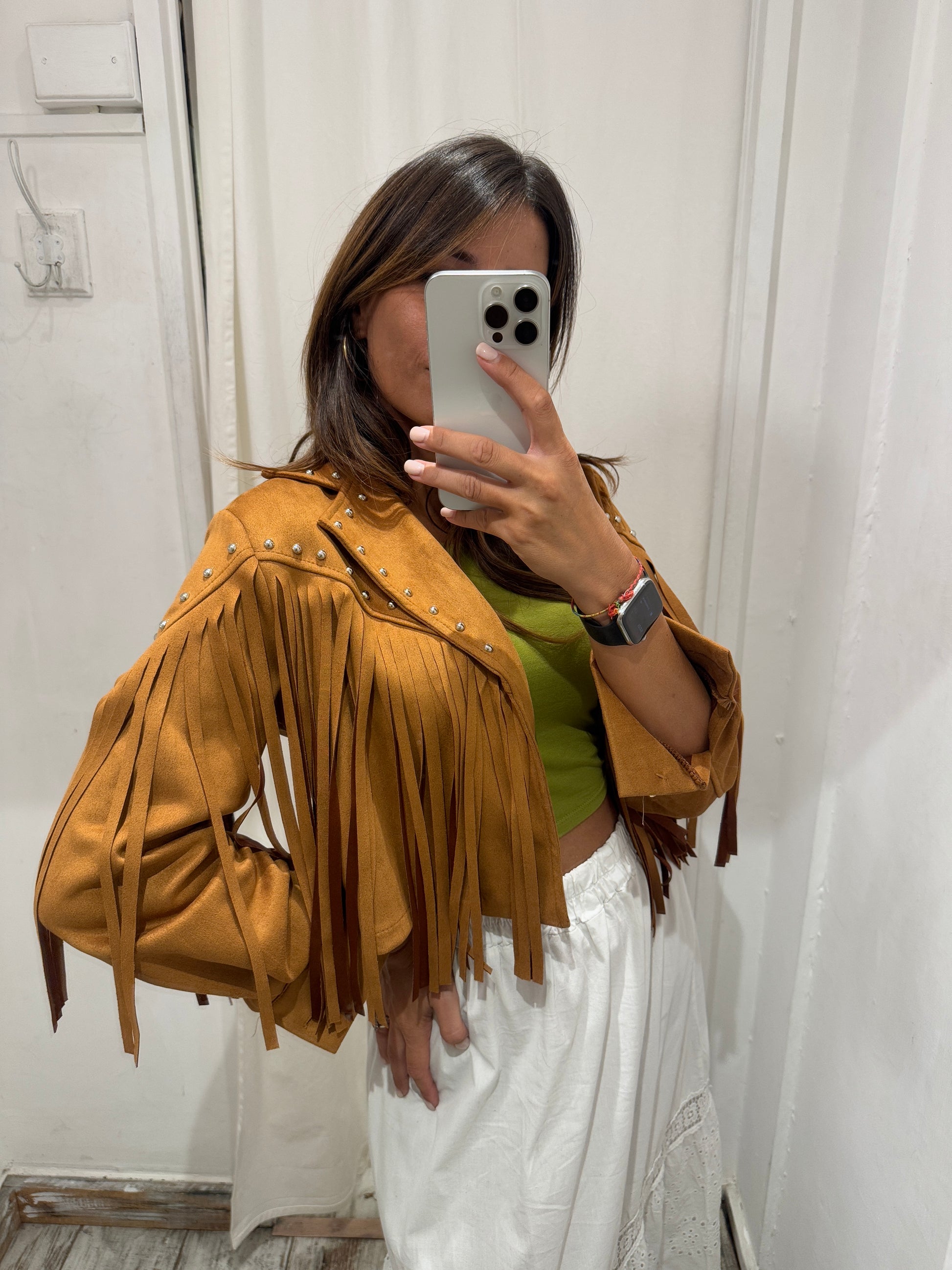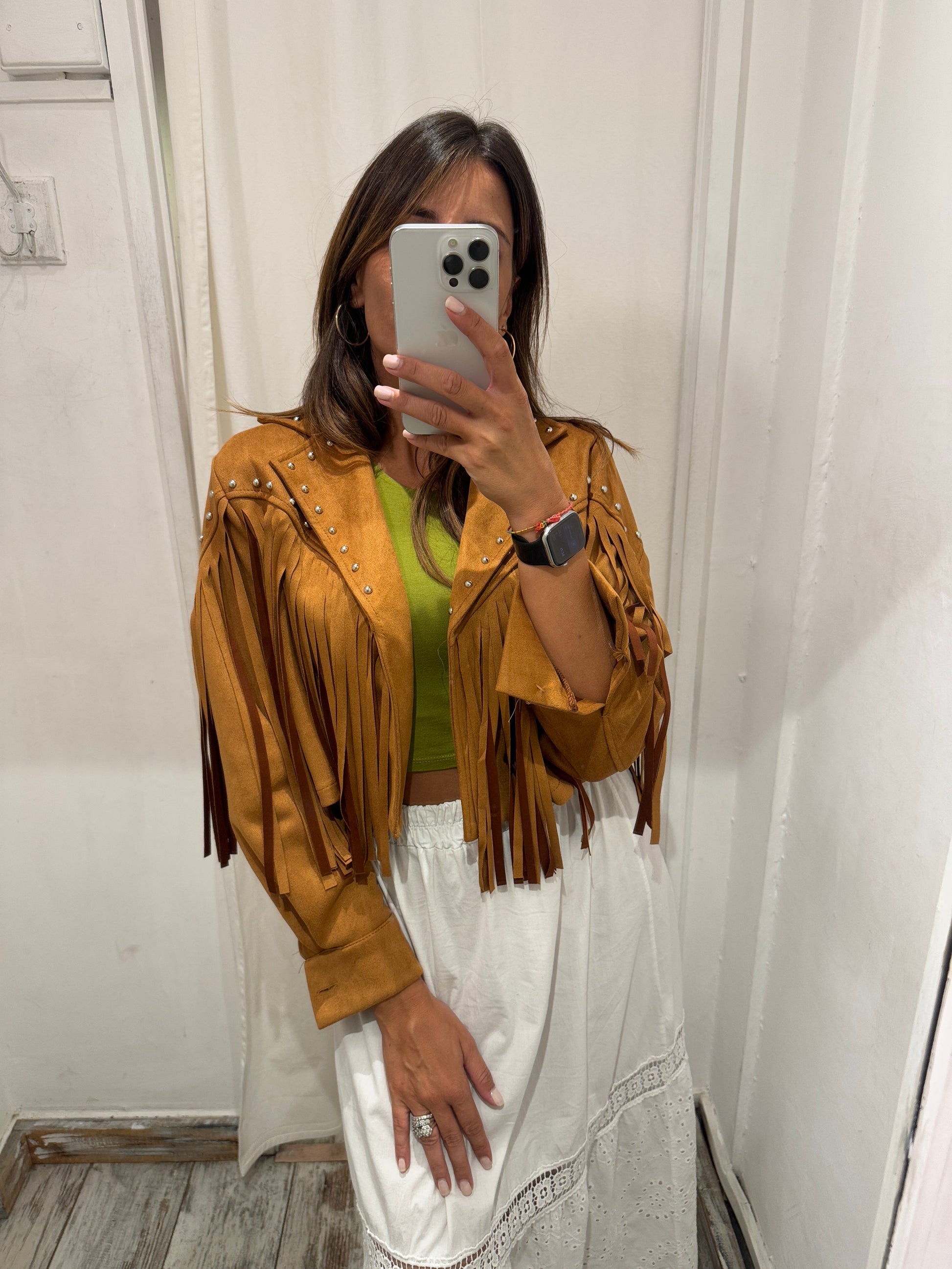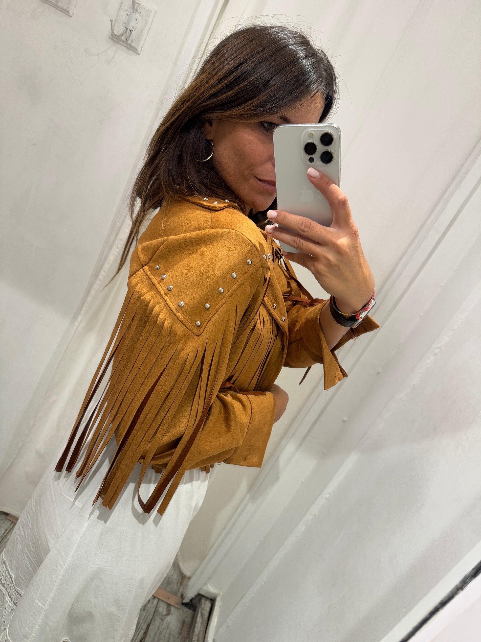 Giubbino in suede color cammello con frange e borchie. Non ha bottoni e zip a chiusura.