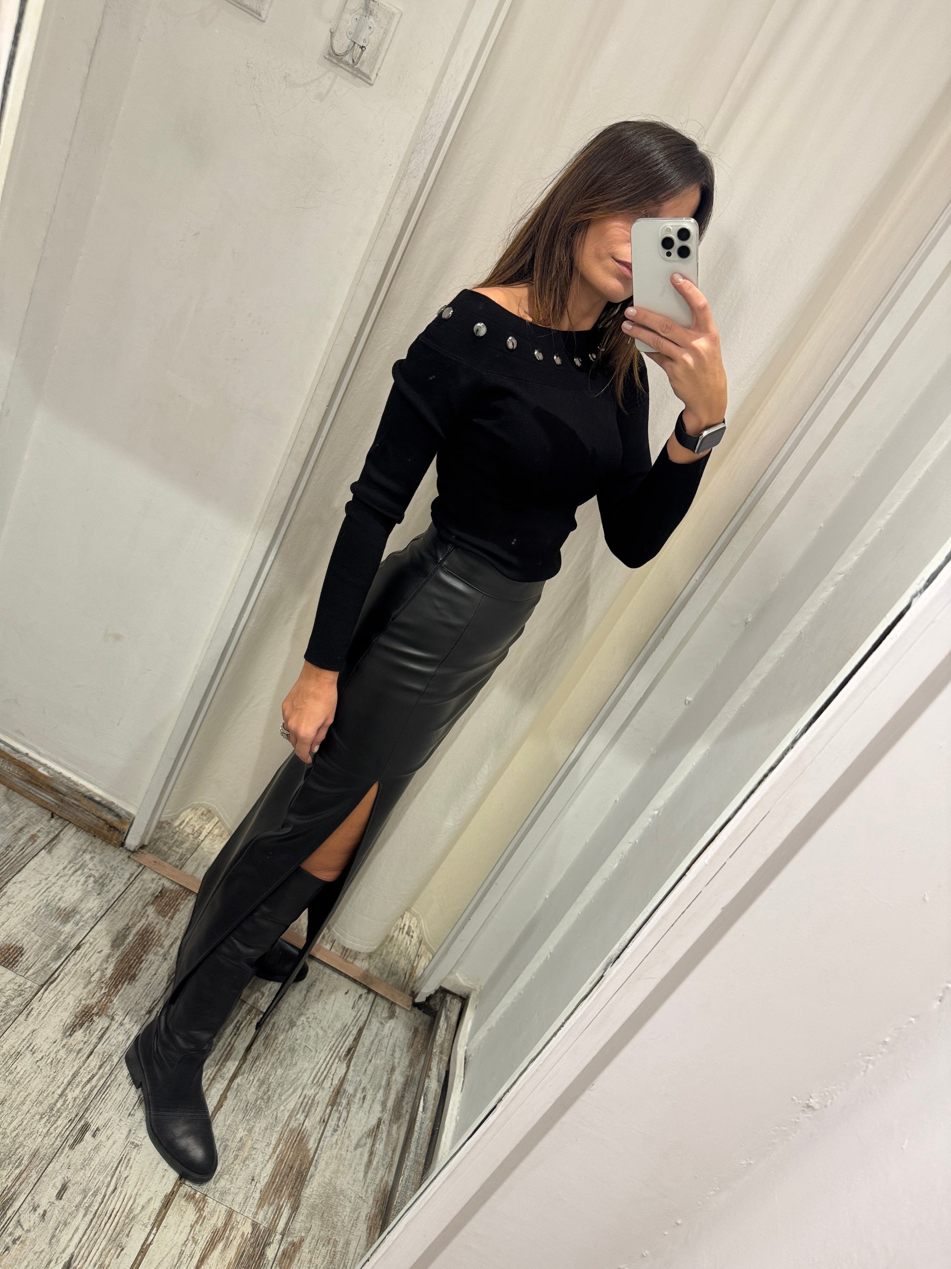 Gonna longuette ecopelle nero con spacco profondo. Zip laterale a chiusura