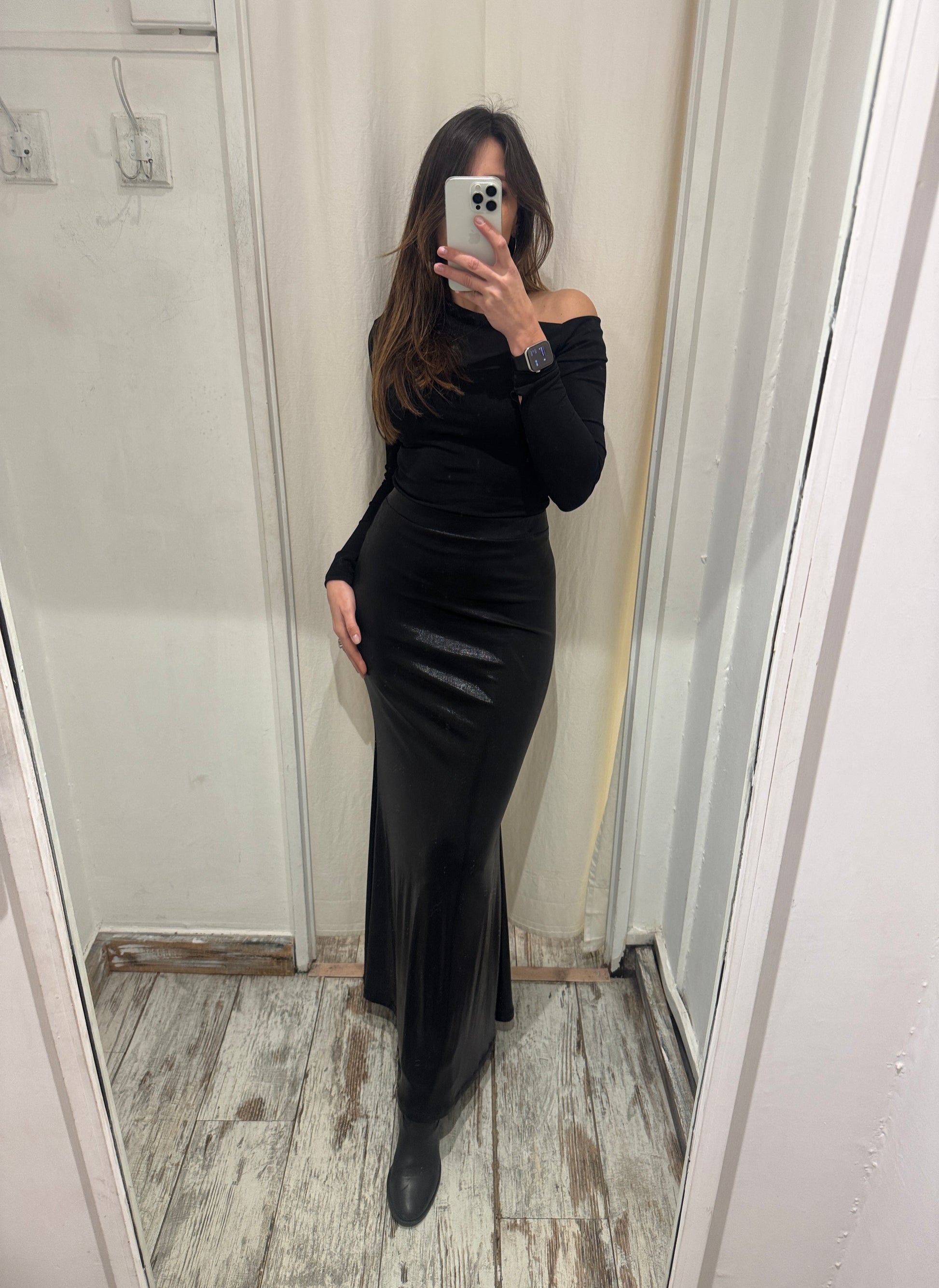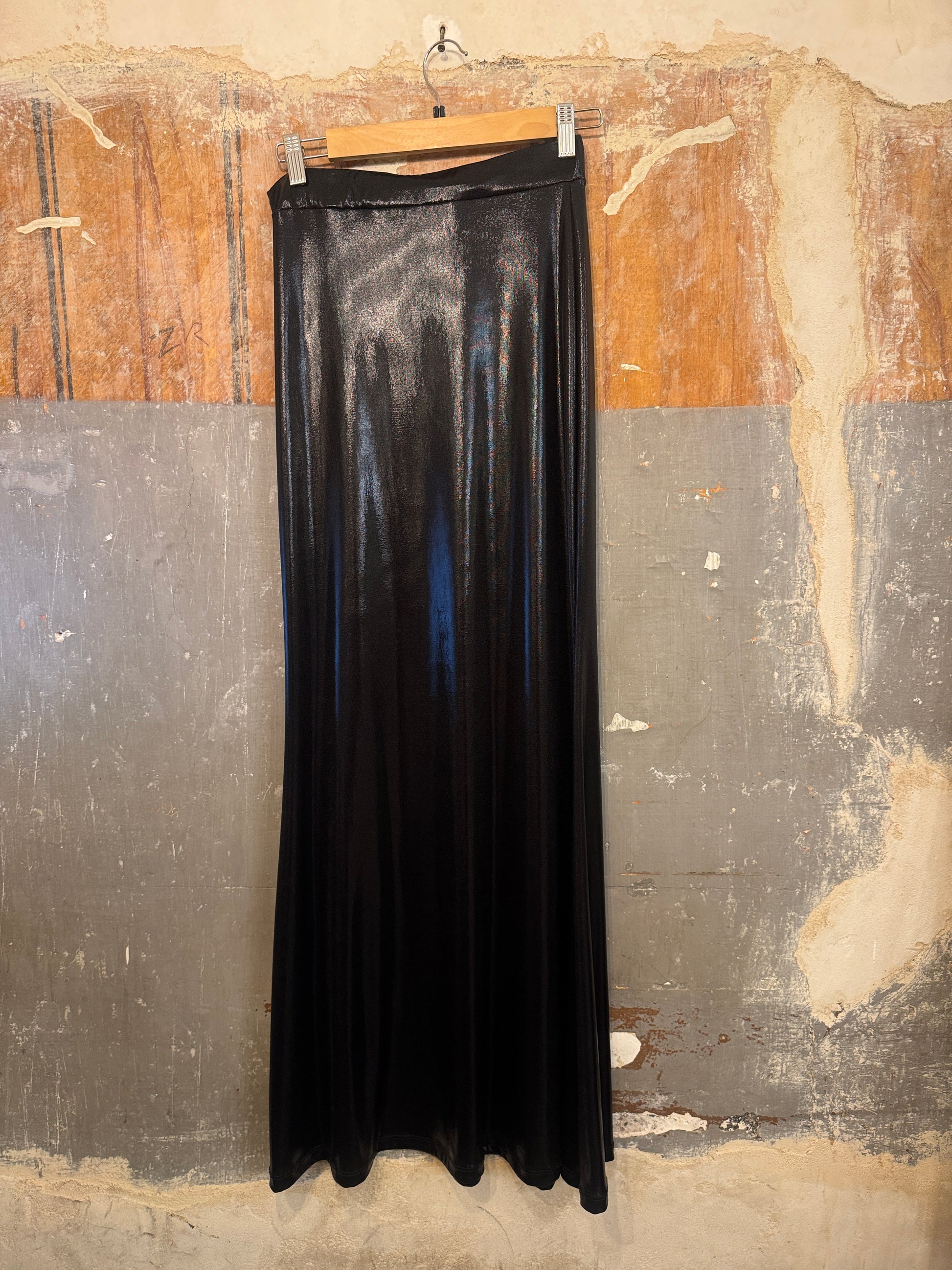 Gonna lunga svasata nera effetto lucido. Elastico in vita.
