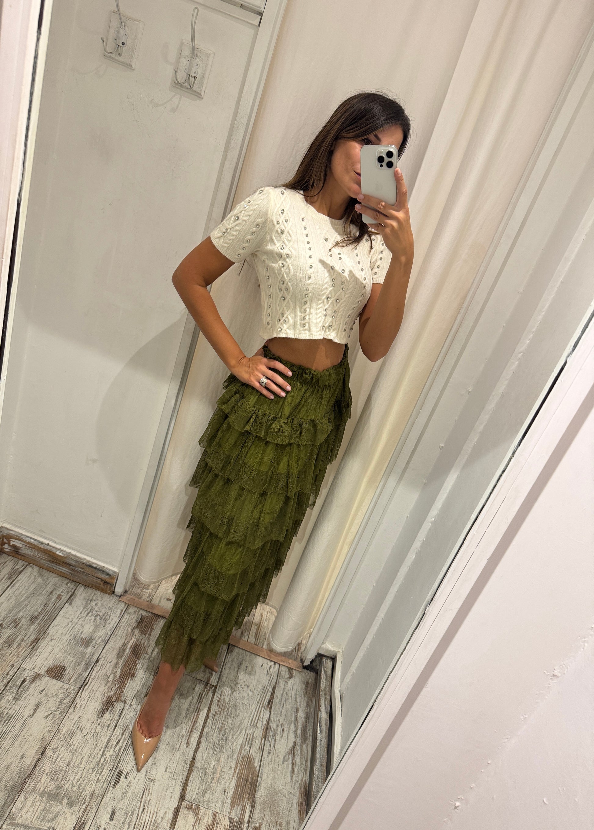 Gonna midì verde militare in pizzo con balze. Elasticizzata in vita