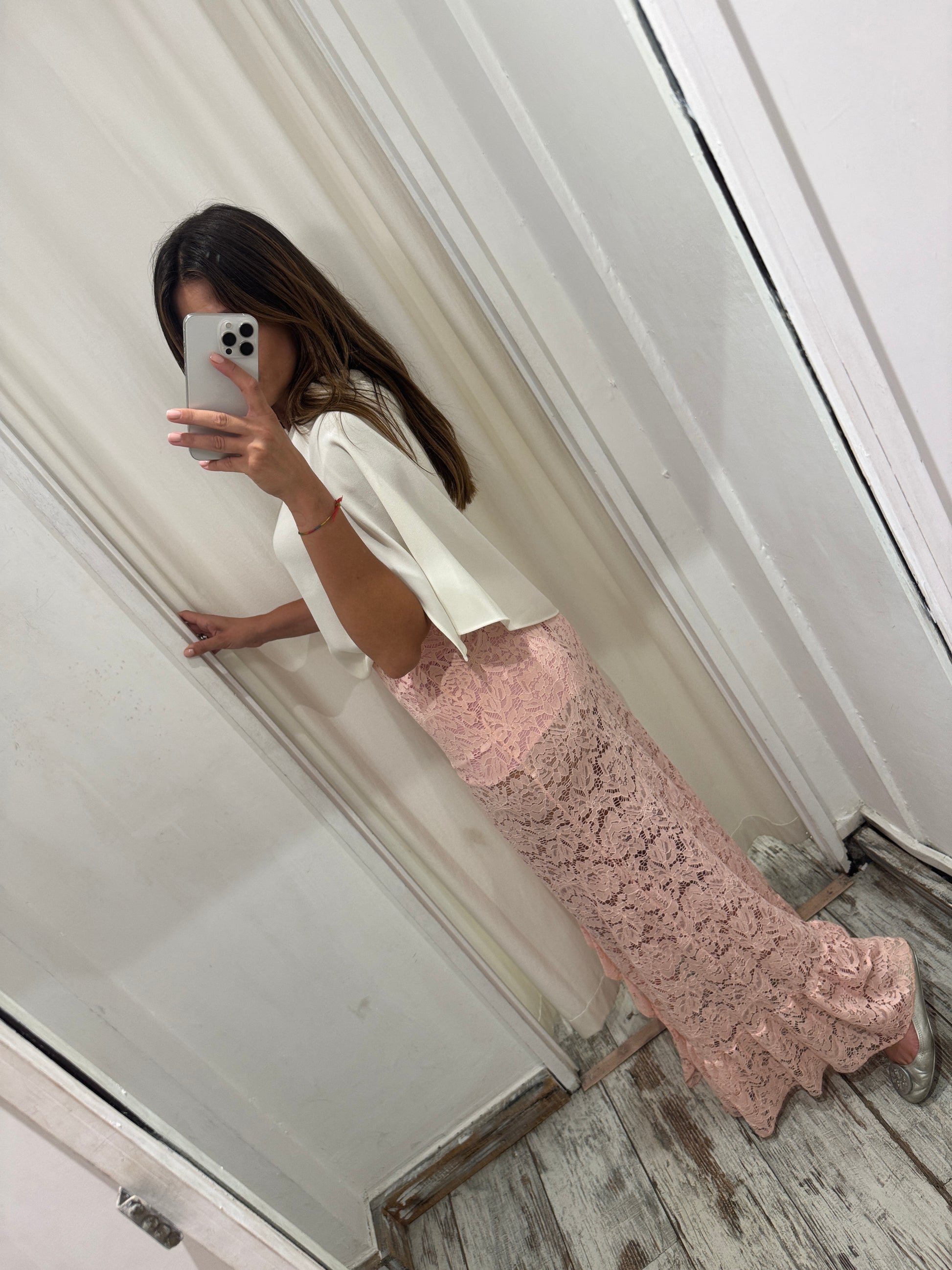 Gonna lunga in pizzo rosa elasticizzata in vita con rouches sullo spacco laterale. Pantaloncino interno.