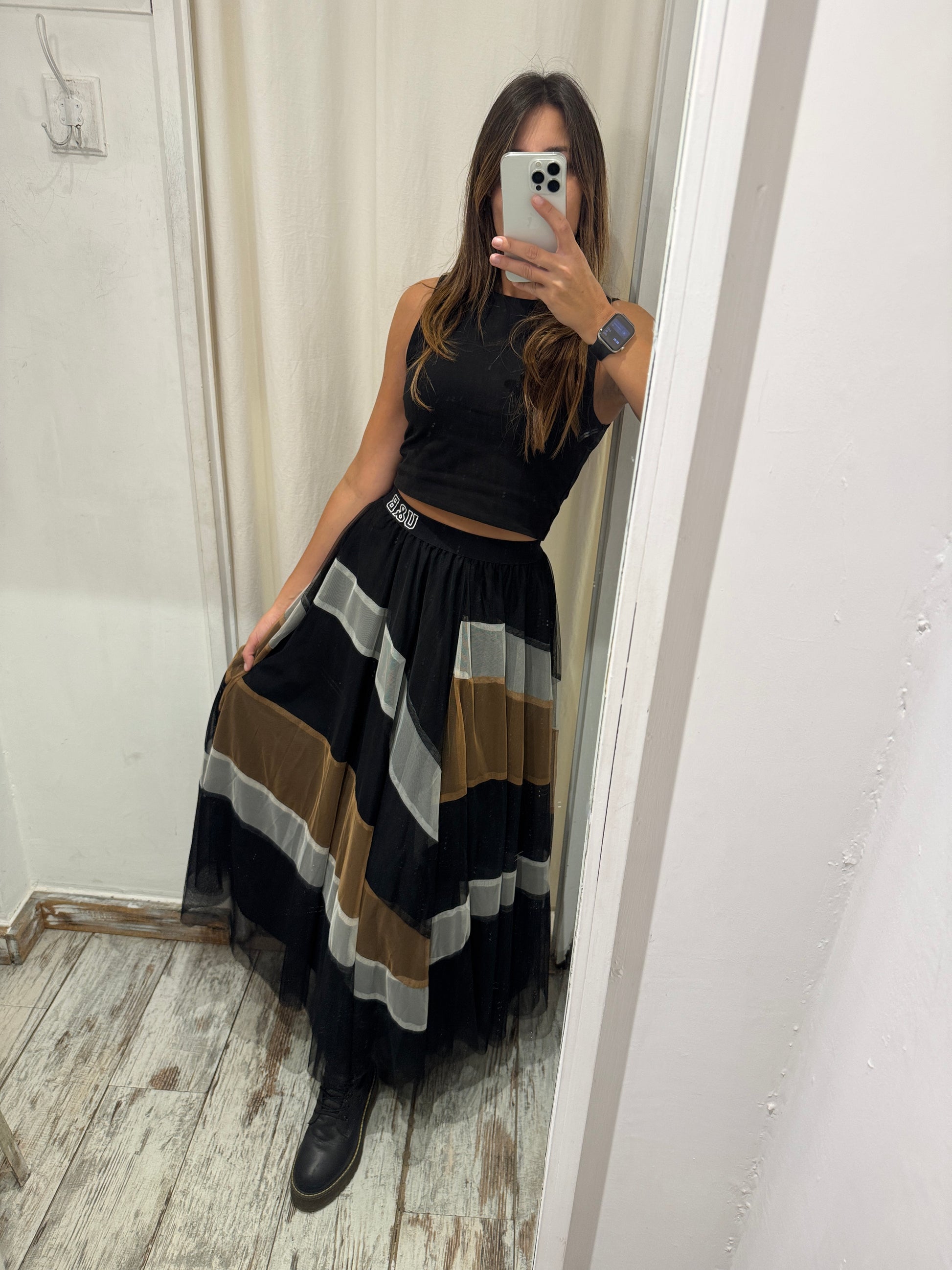 Gonna TwinSet U&B in tulle nero marrone e bianco con elastico in vita.