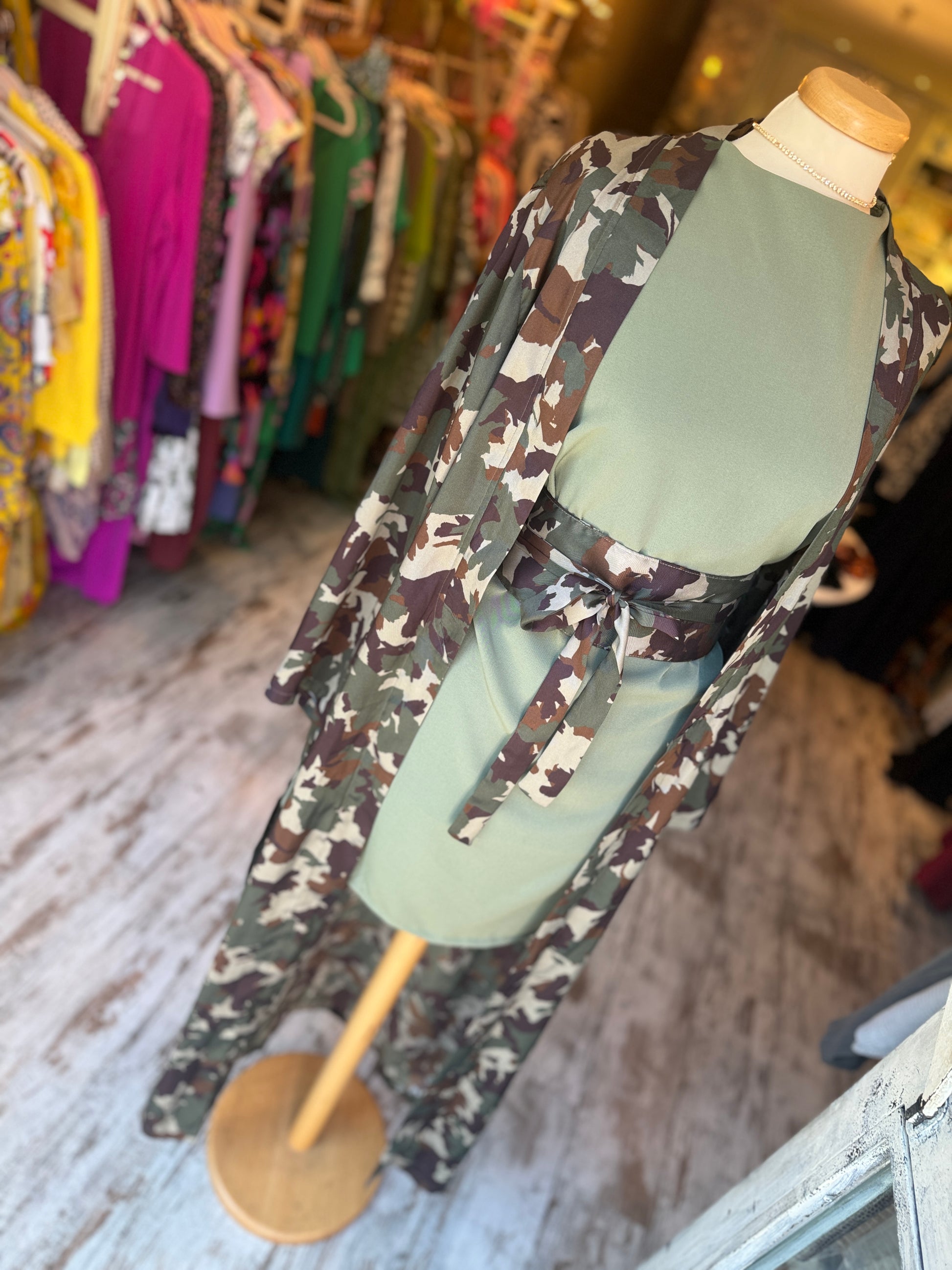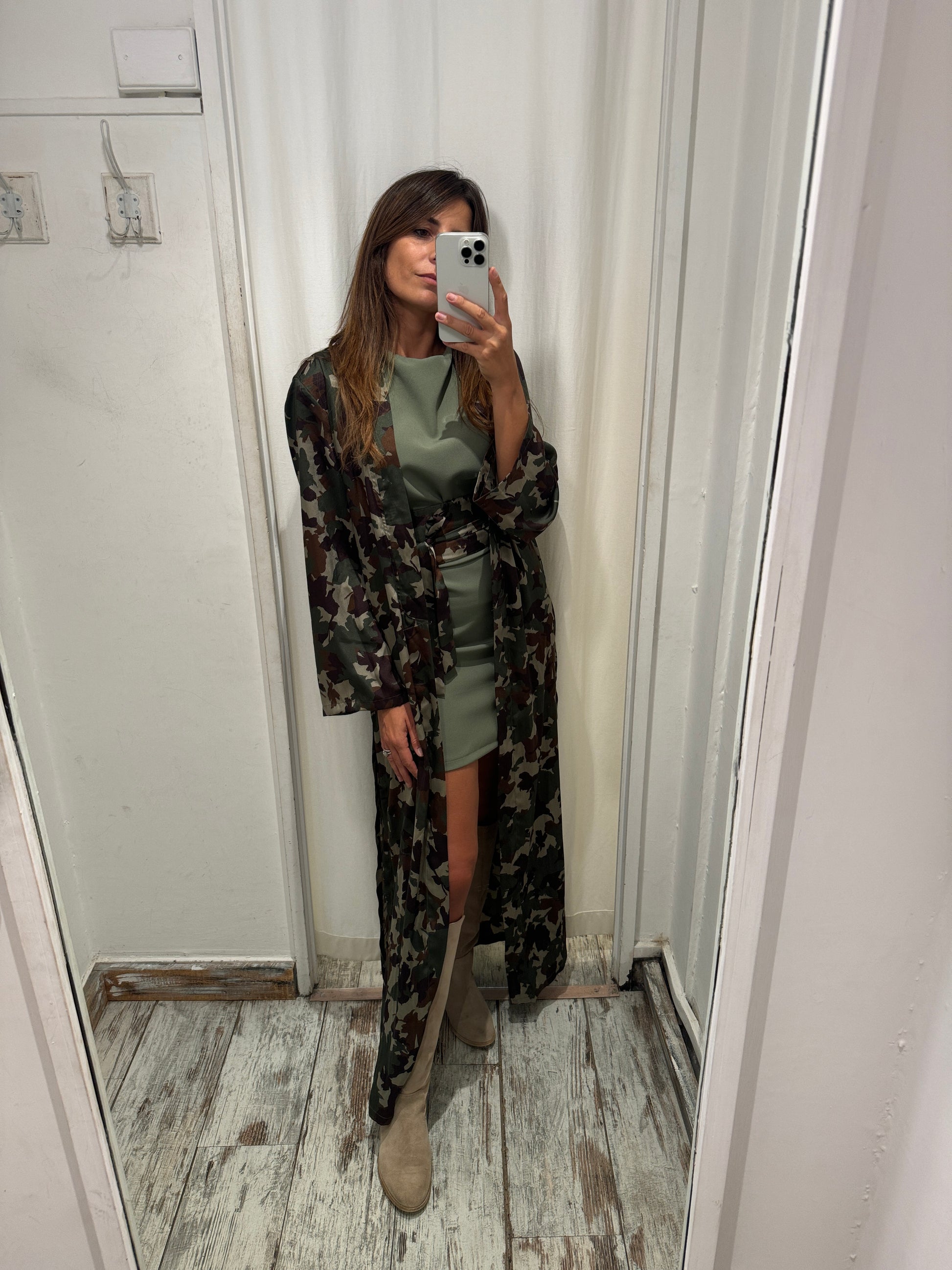 Kimono Ponchia stampa camouflage con cintura a fascia. Spacchetti laterali. Manica lunga