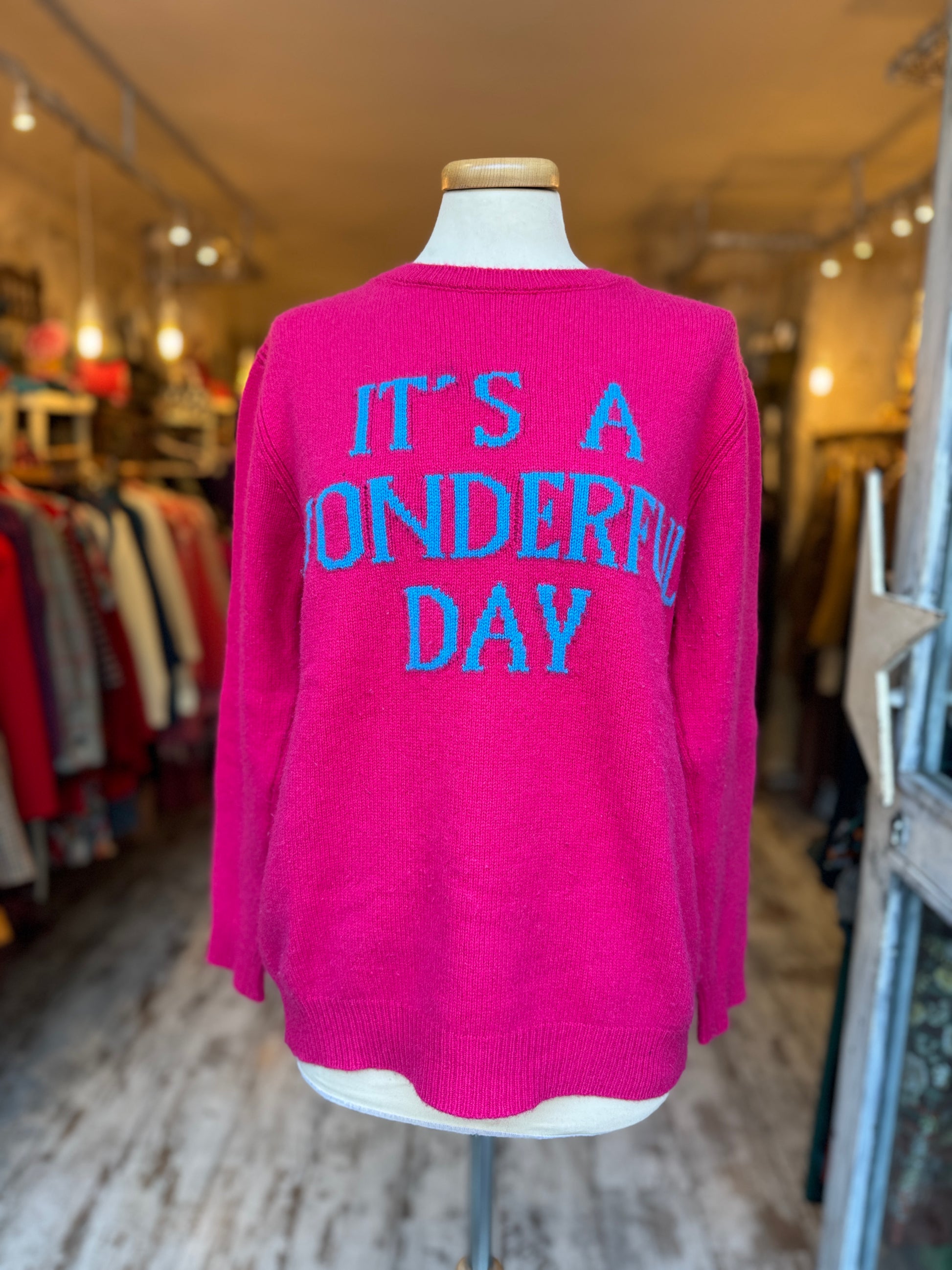 Maglia Alberta Ferretti fucsia con scritta ‘It’s a wonderful day’ azzurra.