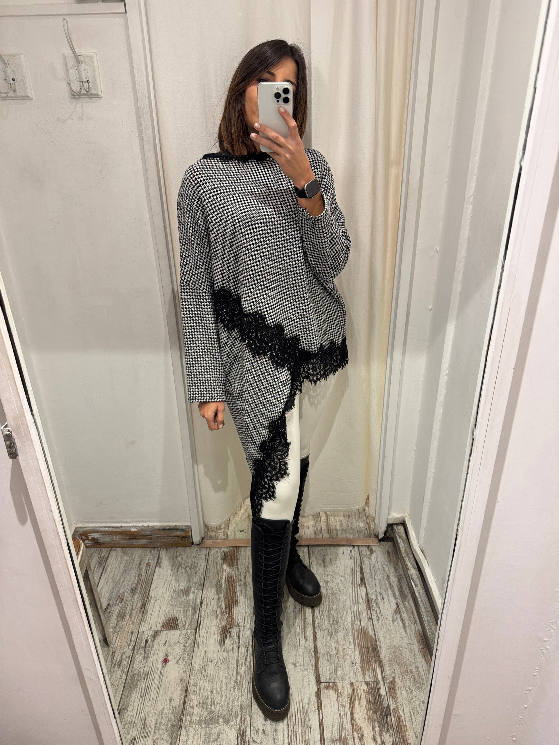 Maglia lunga asimmetrica stampa pied de poule bianco e nero lurex con inserti in pizzo nero.