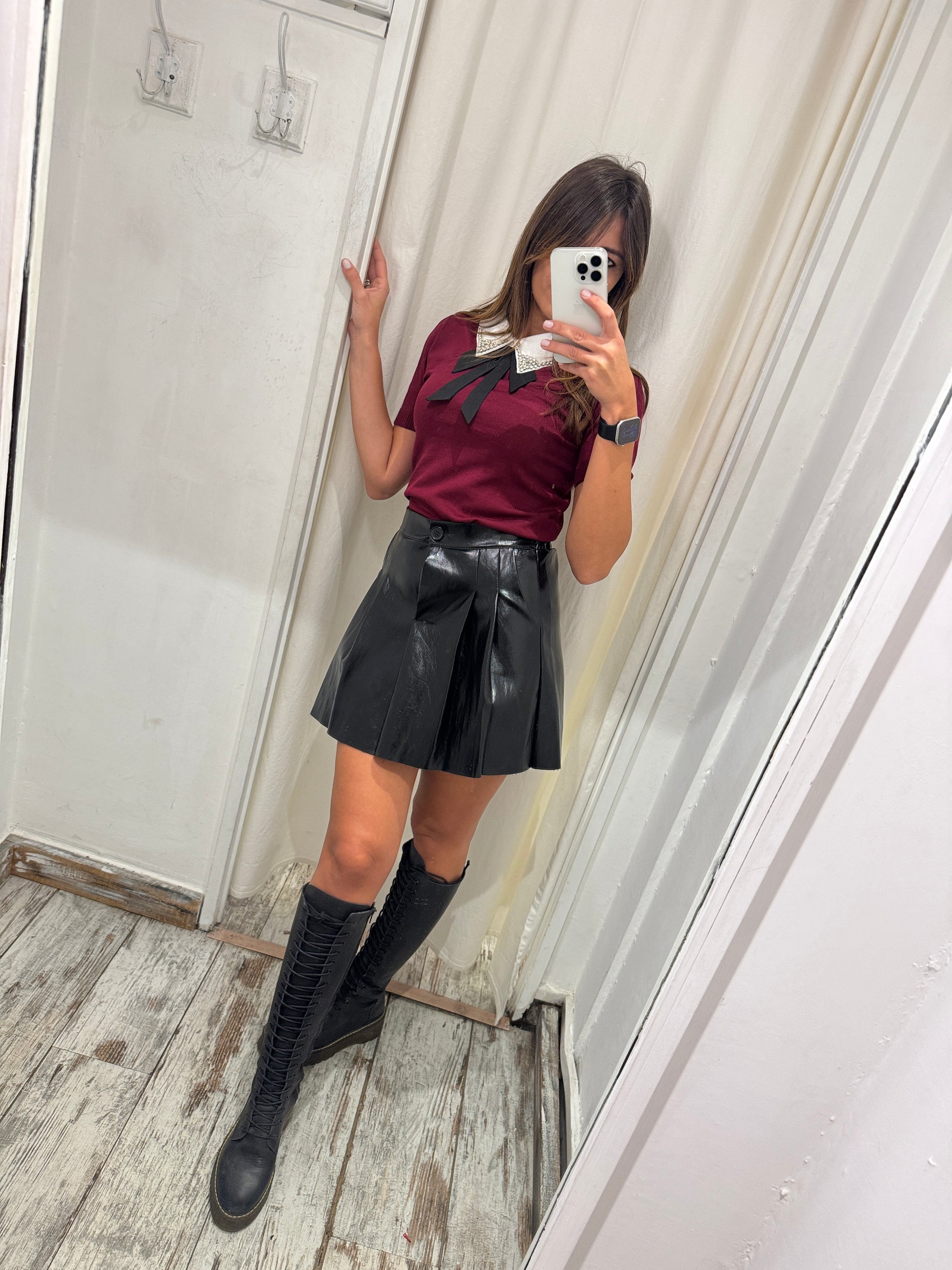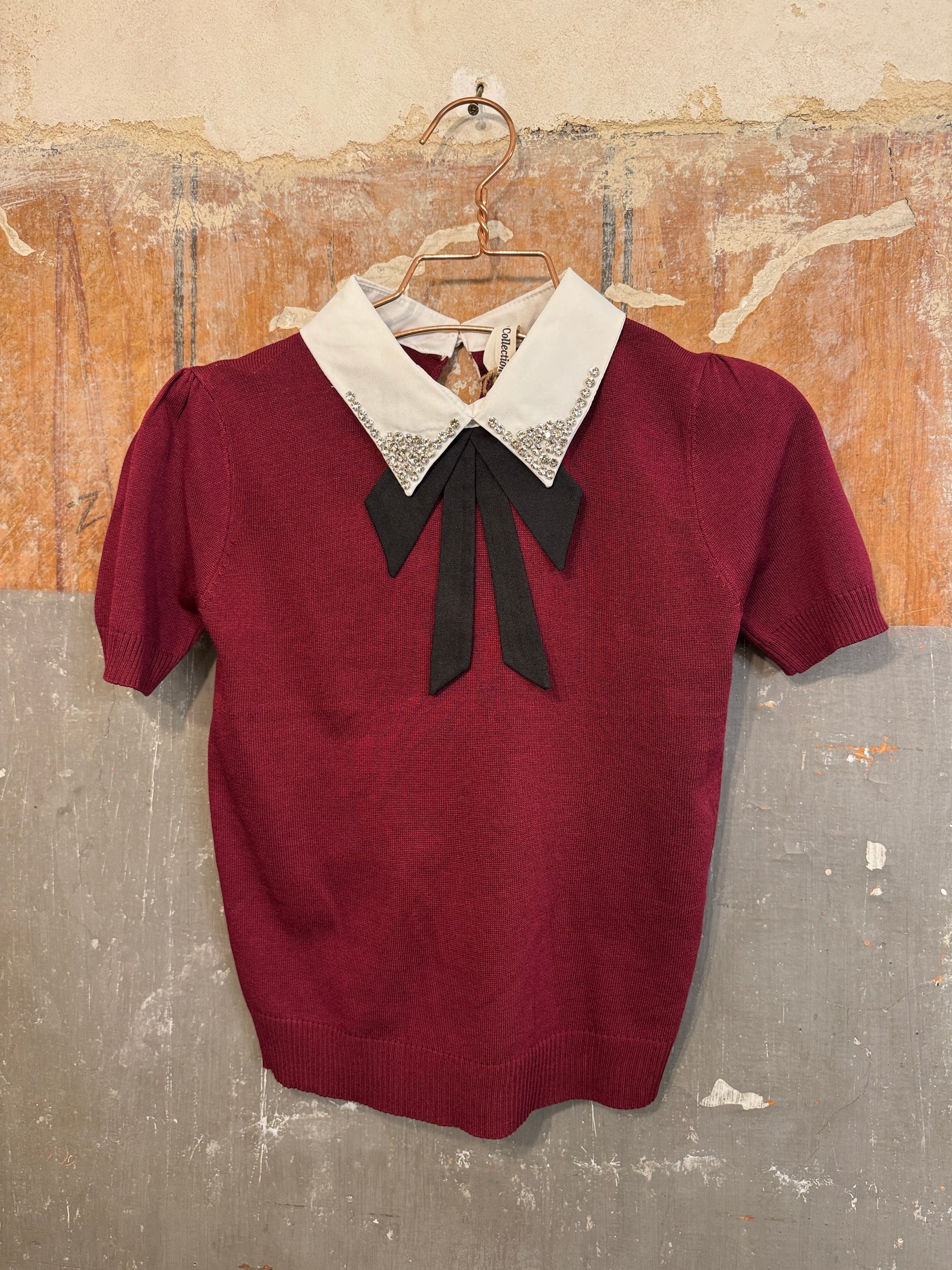 maglia manica corta bordeaux con colletto bianco con swarovski e fiocco nero