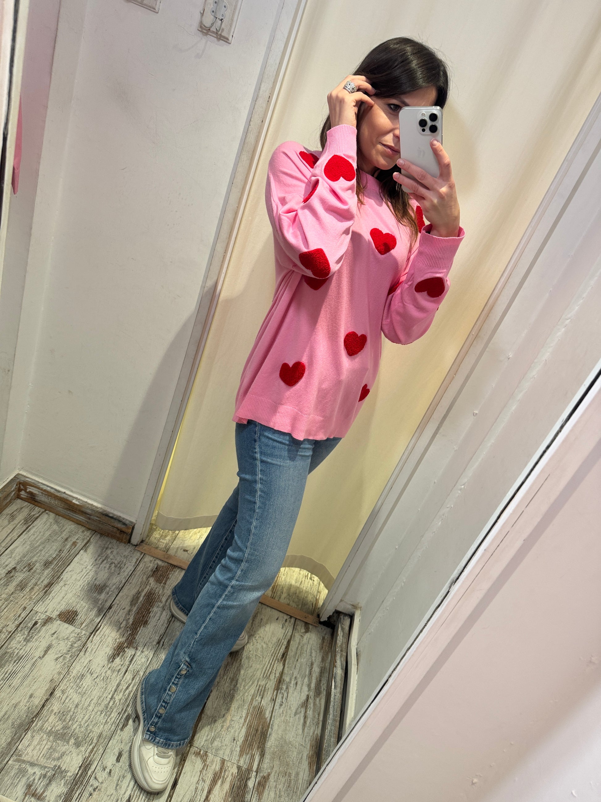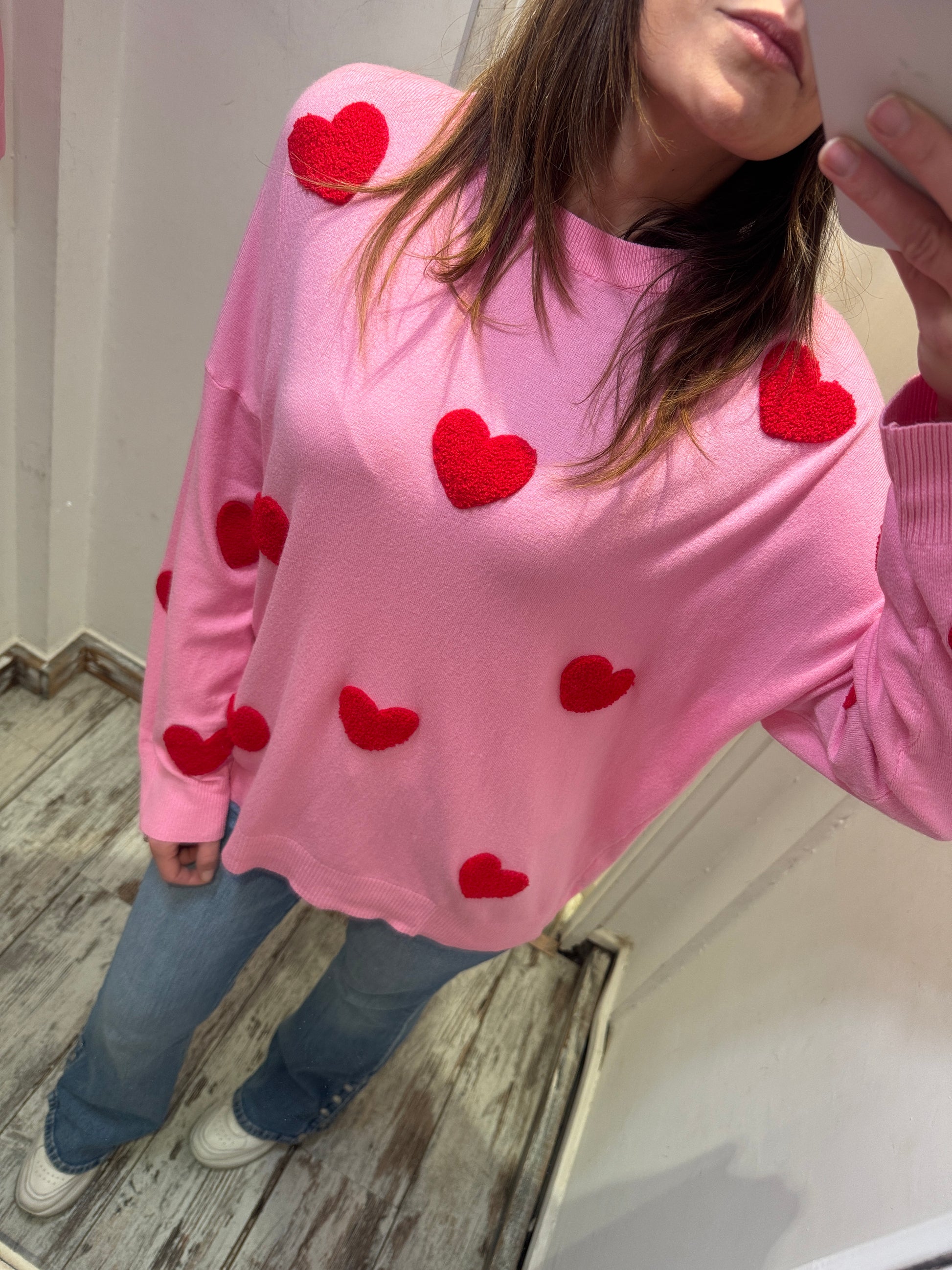 Maglia over girocollo rosa con cuori rossi.