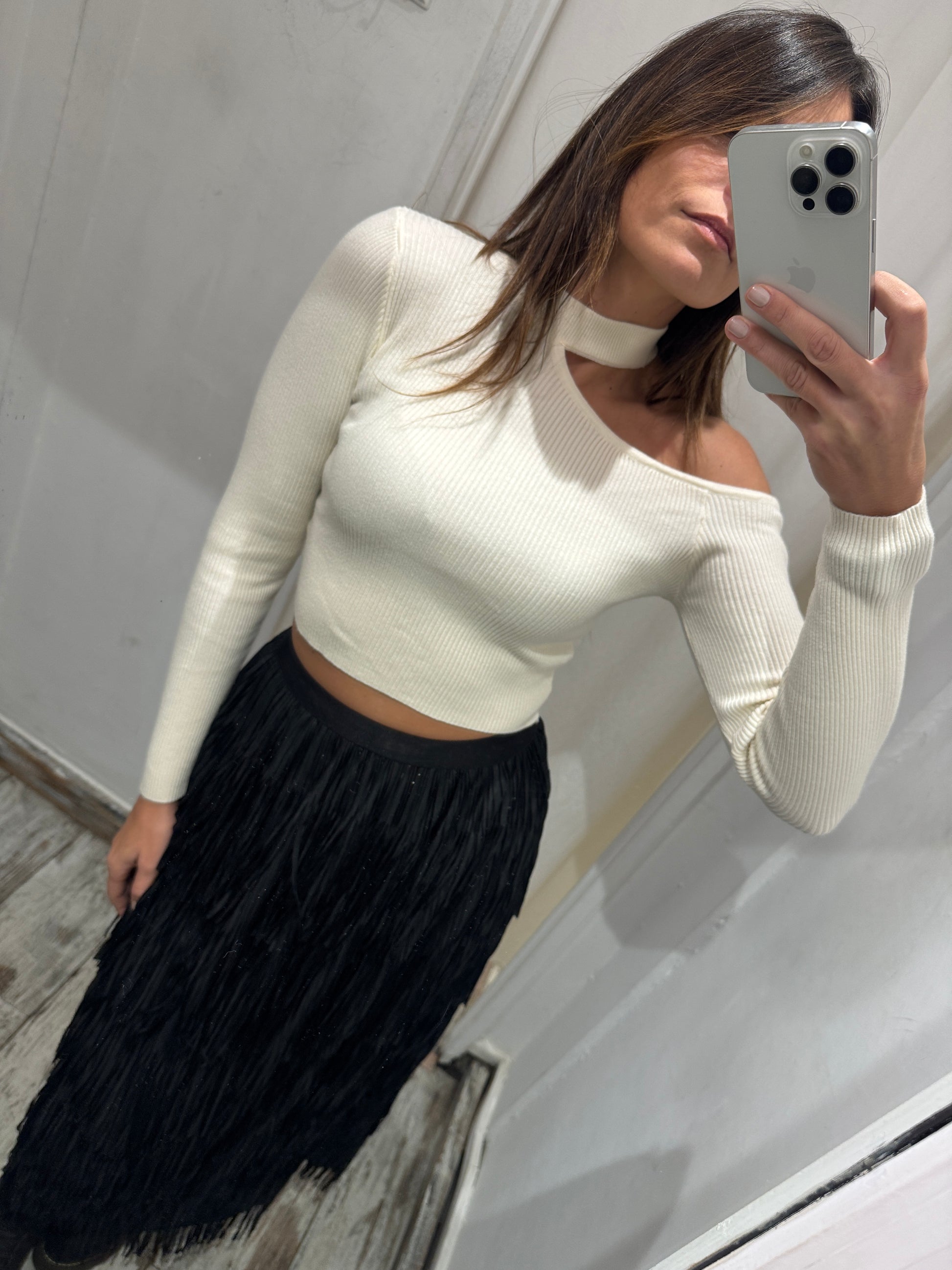 maglia crop a costine bianca con taglio tra il collo e la spalla.