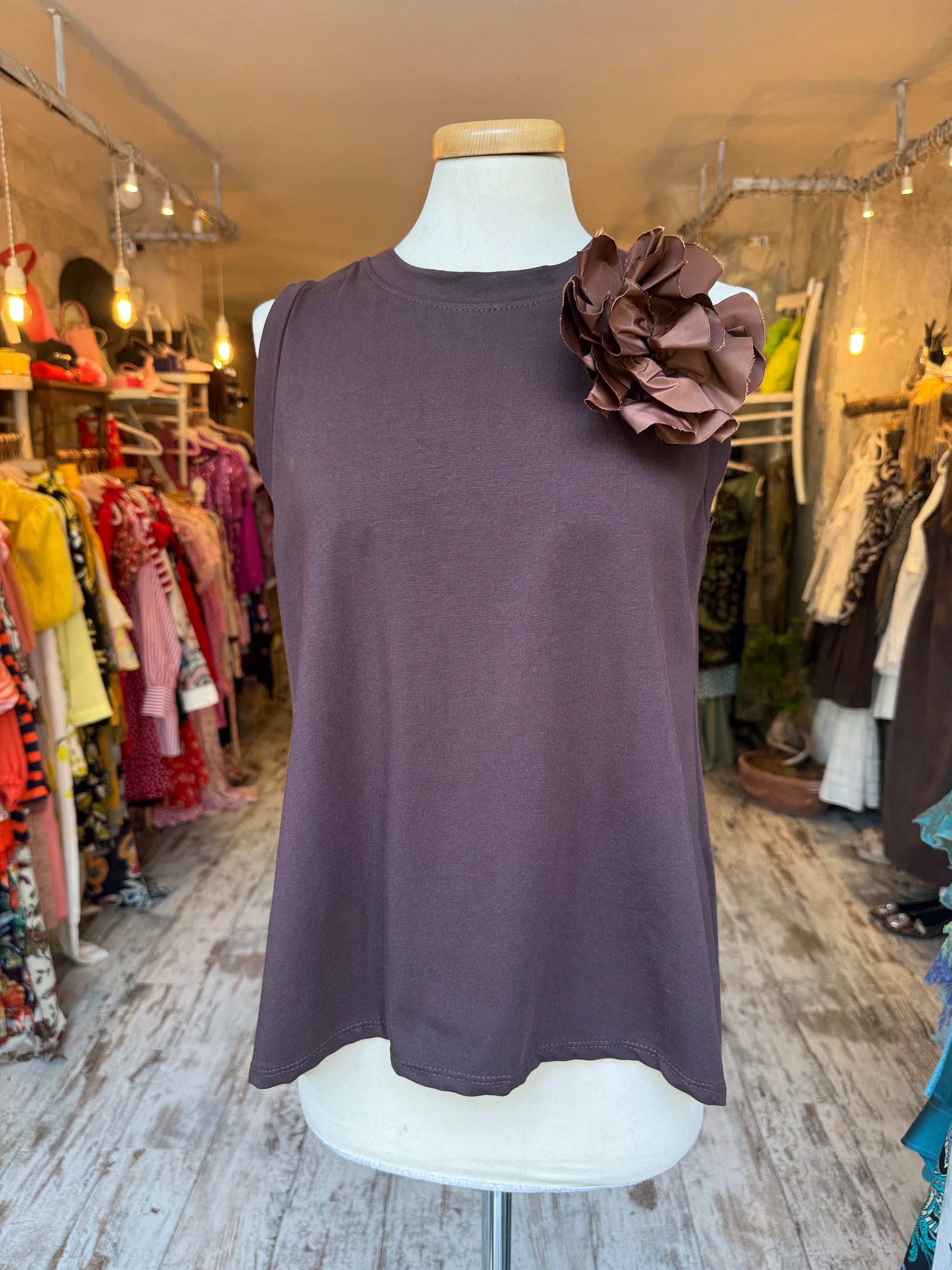 Maglia senza maniche asimmetrica marrone con spilla a fiore removibile. Spacco posteriore.