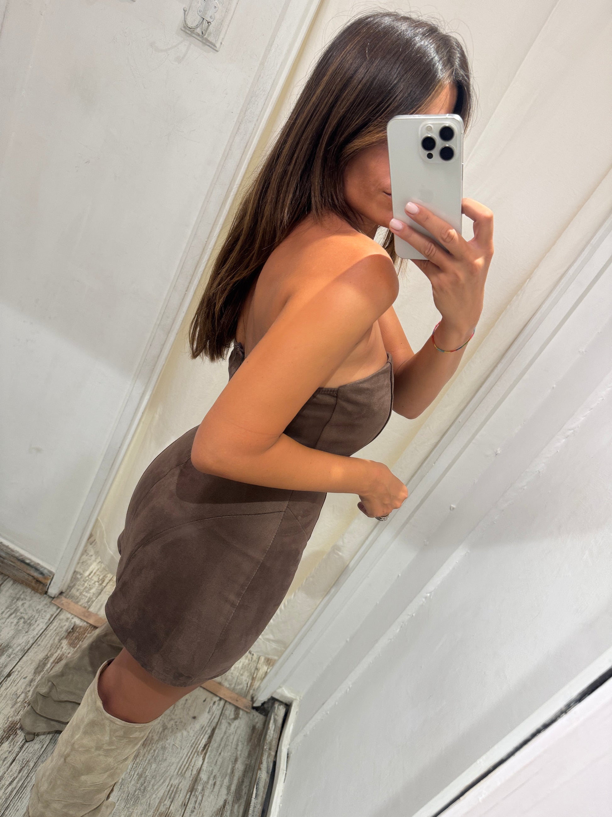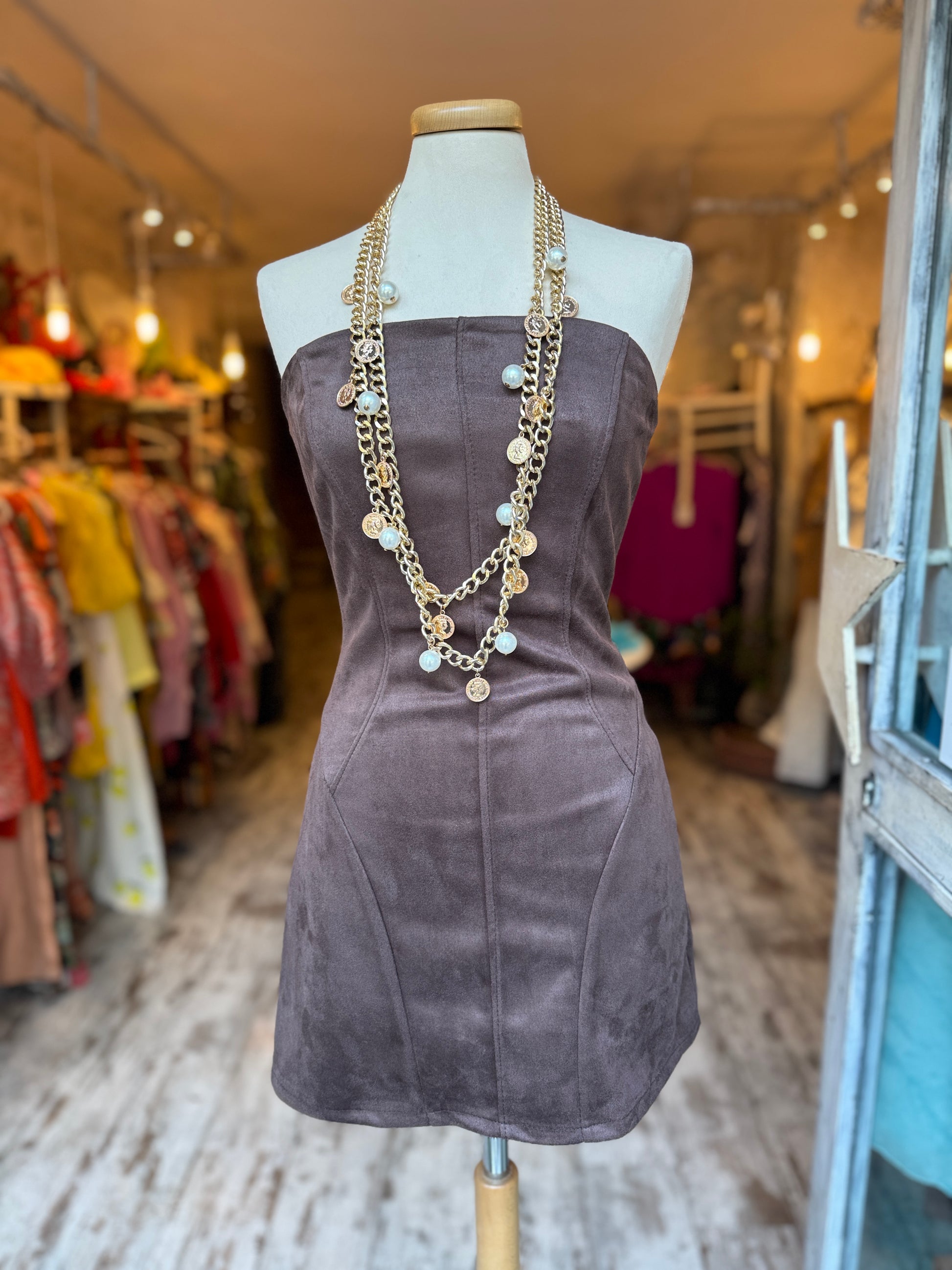 Abito senza spalline scamosciato color testa di moro. Leggermente svasato ed elasticizzato. Zip posteriore a chiusura. Collana non inclusa