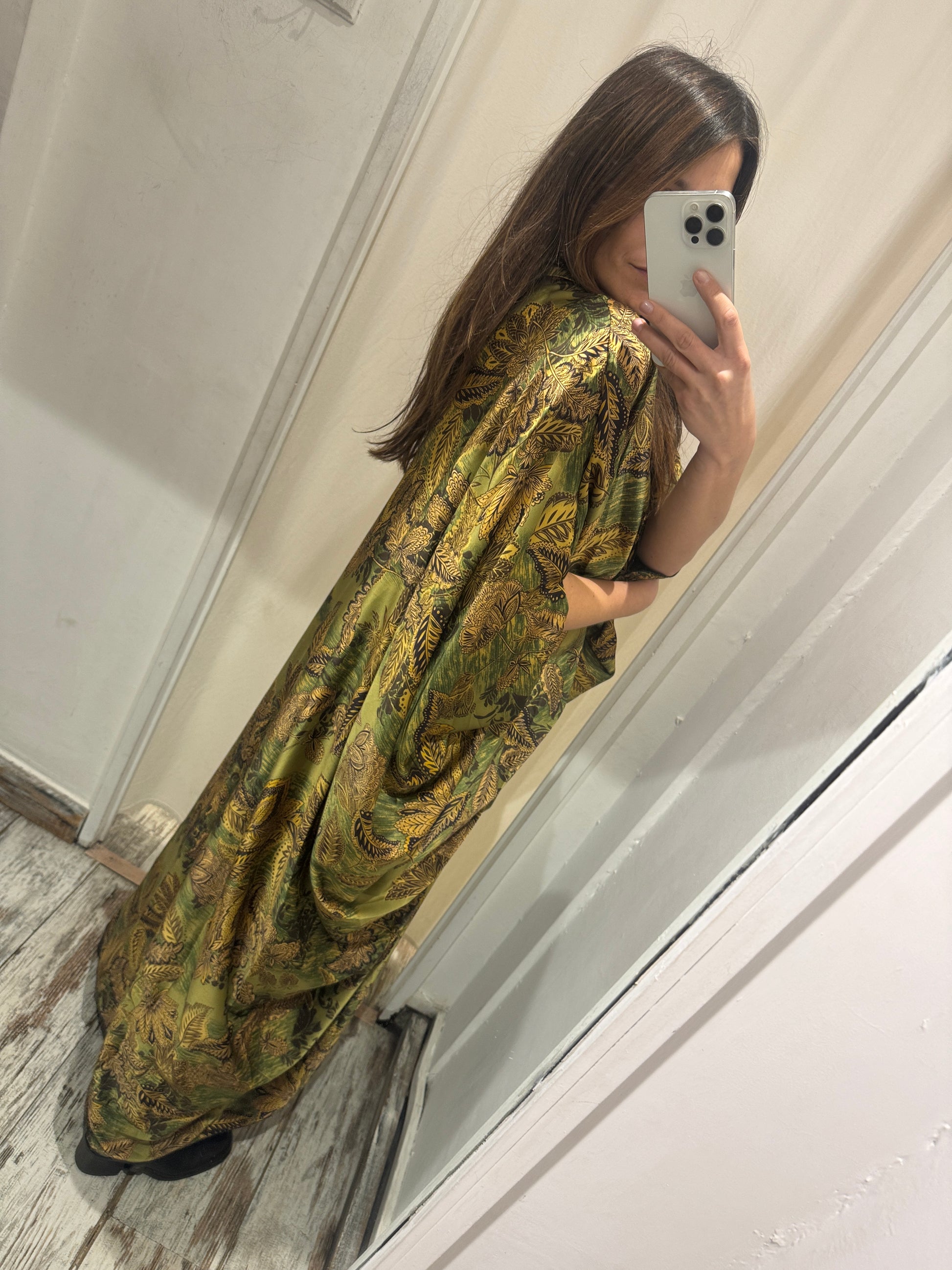 Abito lungo satin verde e oro con drappeggio sul punto vita. Bottoncini a chiusura e manica larga a 3/4. Spilla gioiello inclusa.
