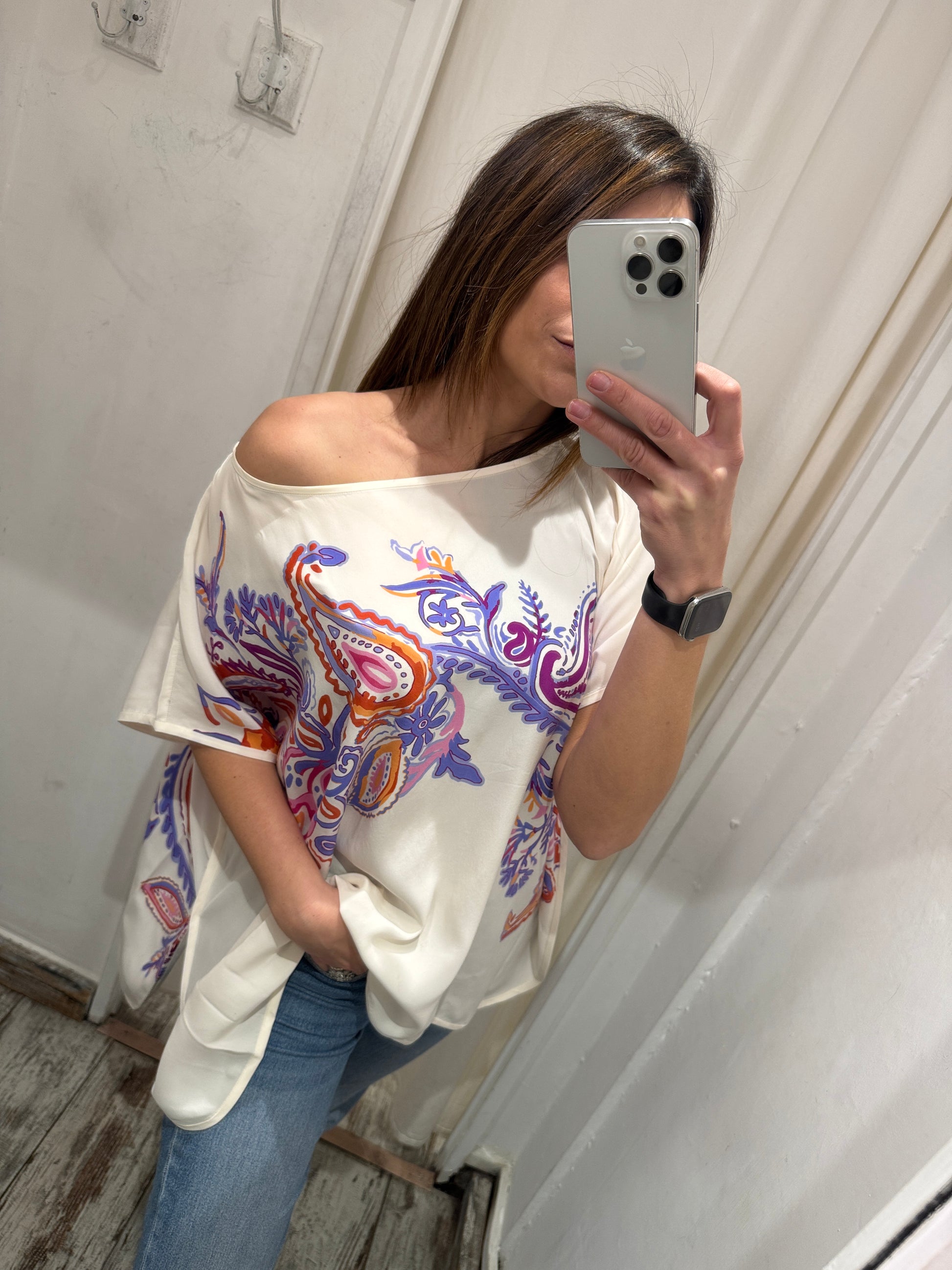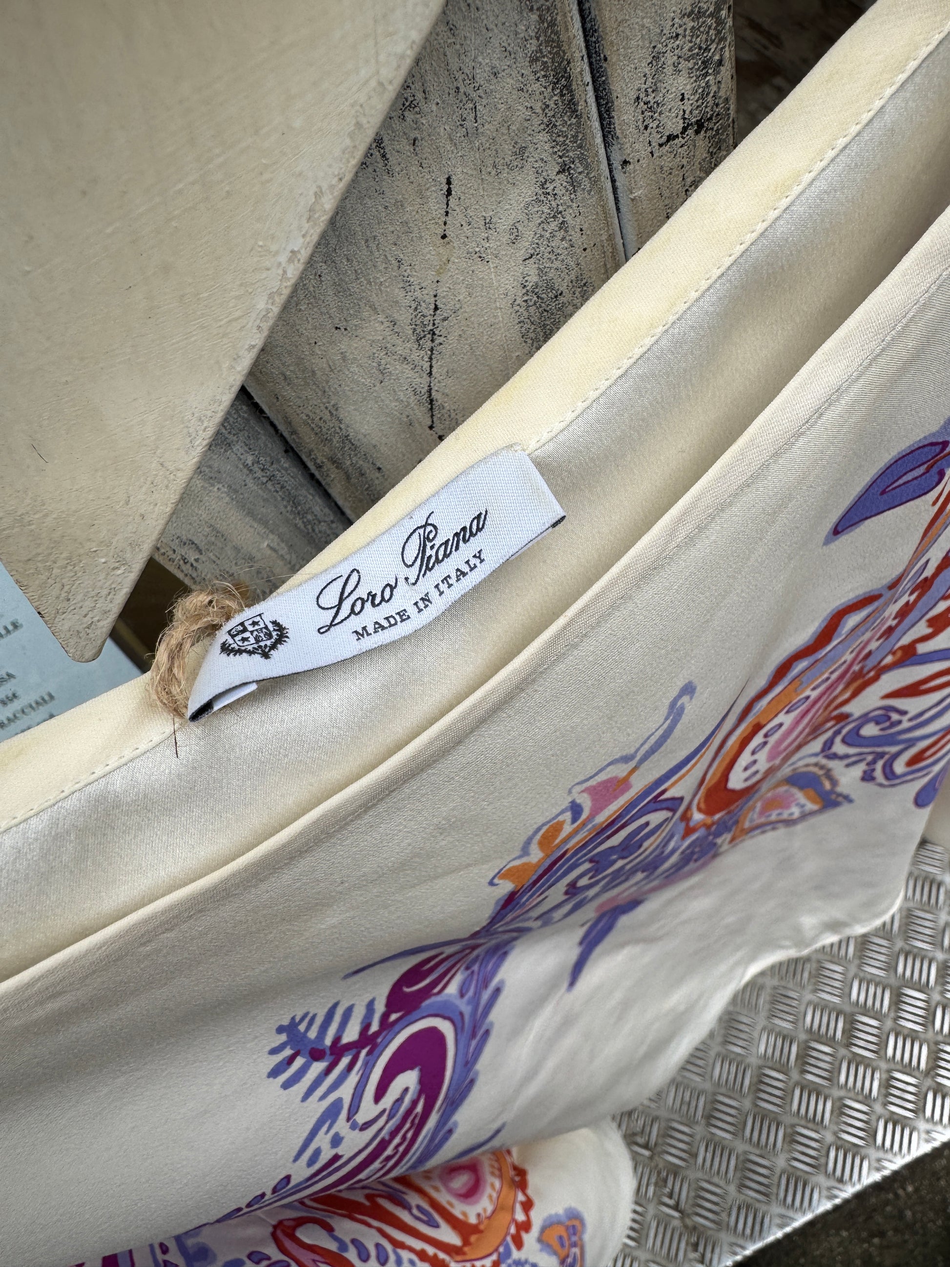 Blusa Loro Piana in seta panna con fantasia viola e arancio