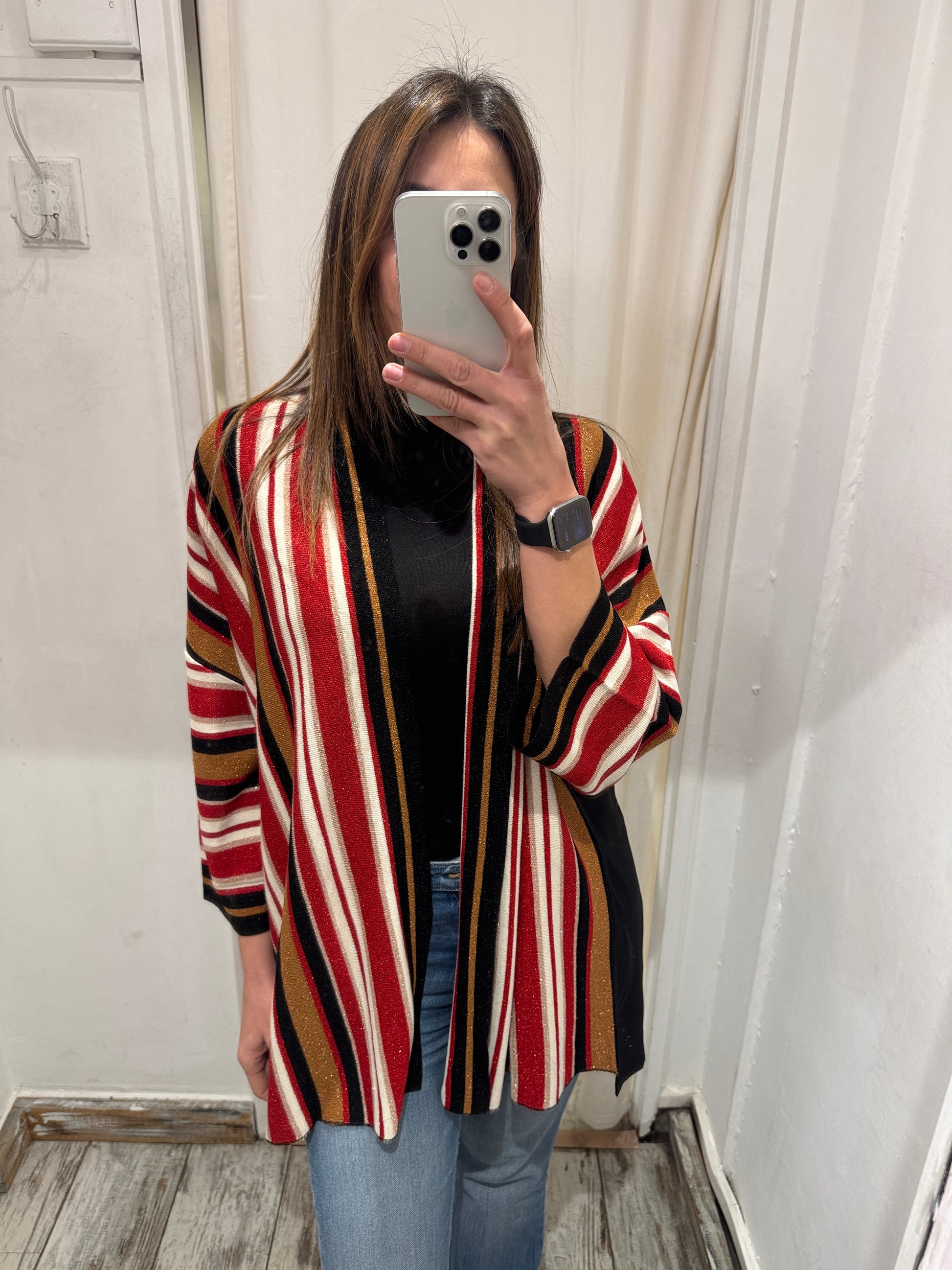 cardigan Kaos lunghezza media a righe lurex rosso nero panna e bronzo e retro in tessuto velato nero. Senza chiusure