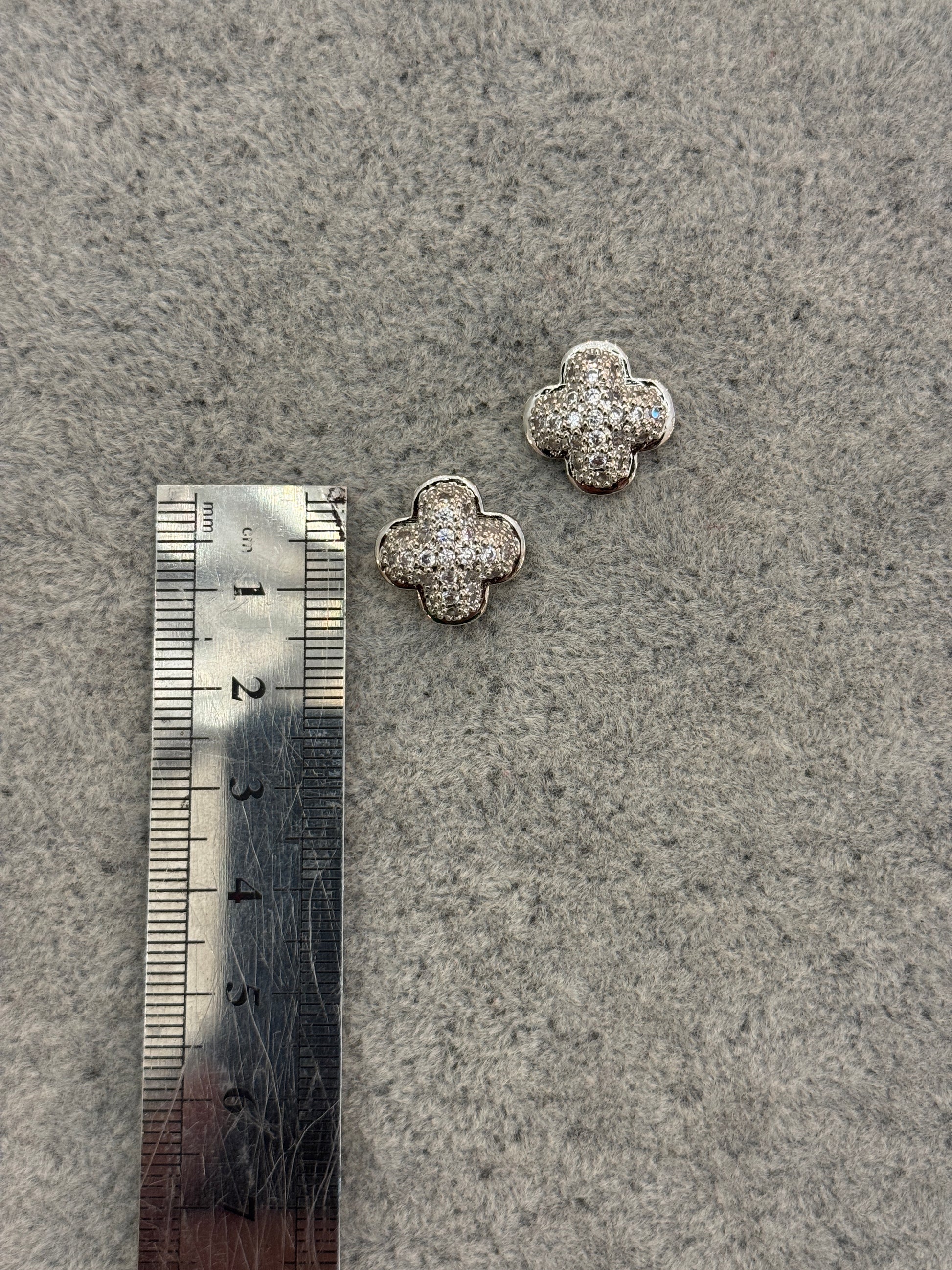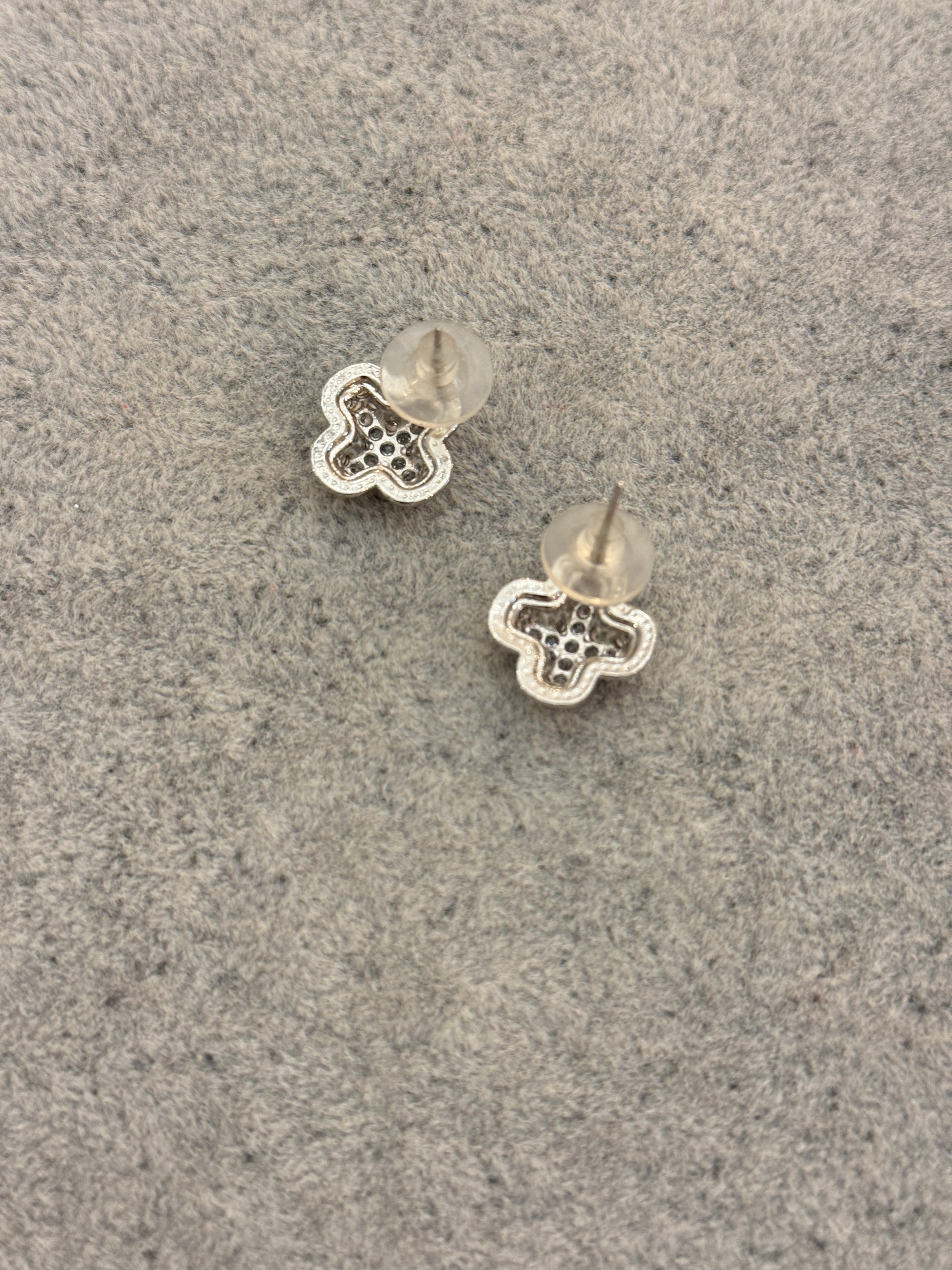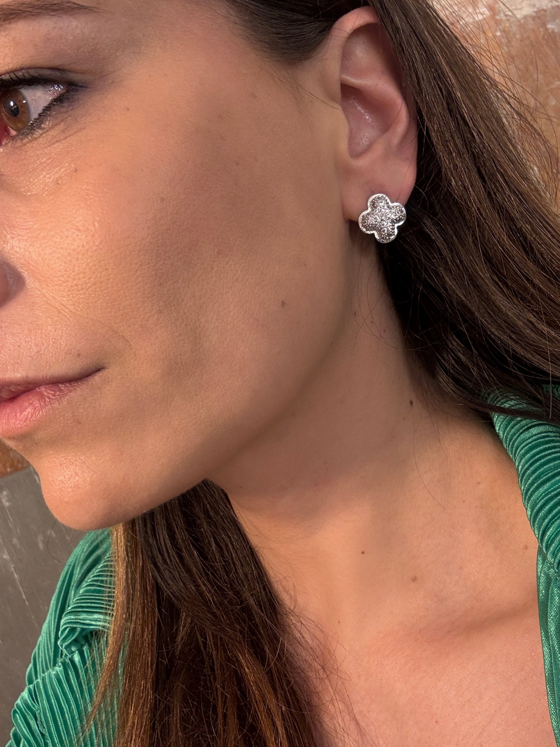 Orecchino a quadrifoglio in metallo argentato con zirconi. Chiusura a farfallina.