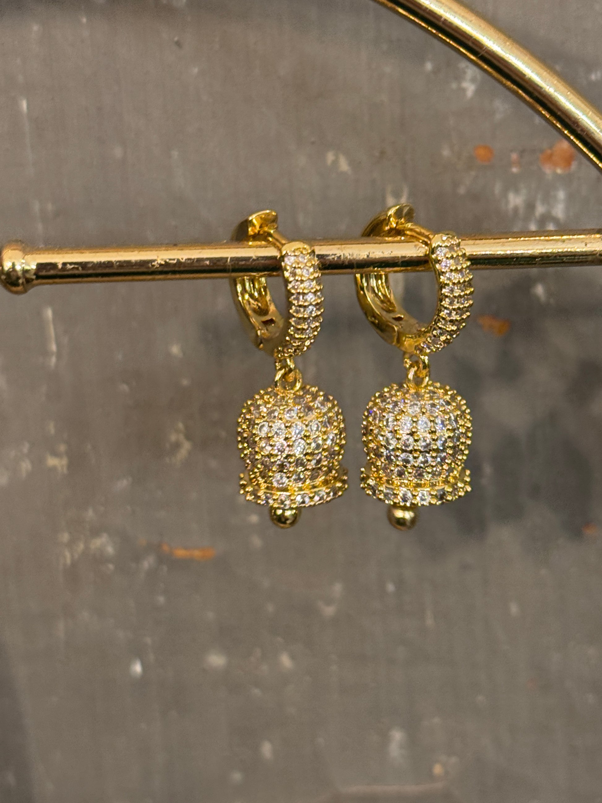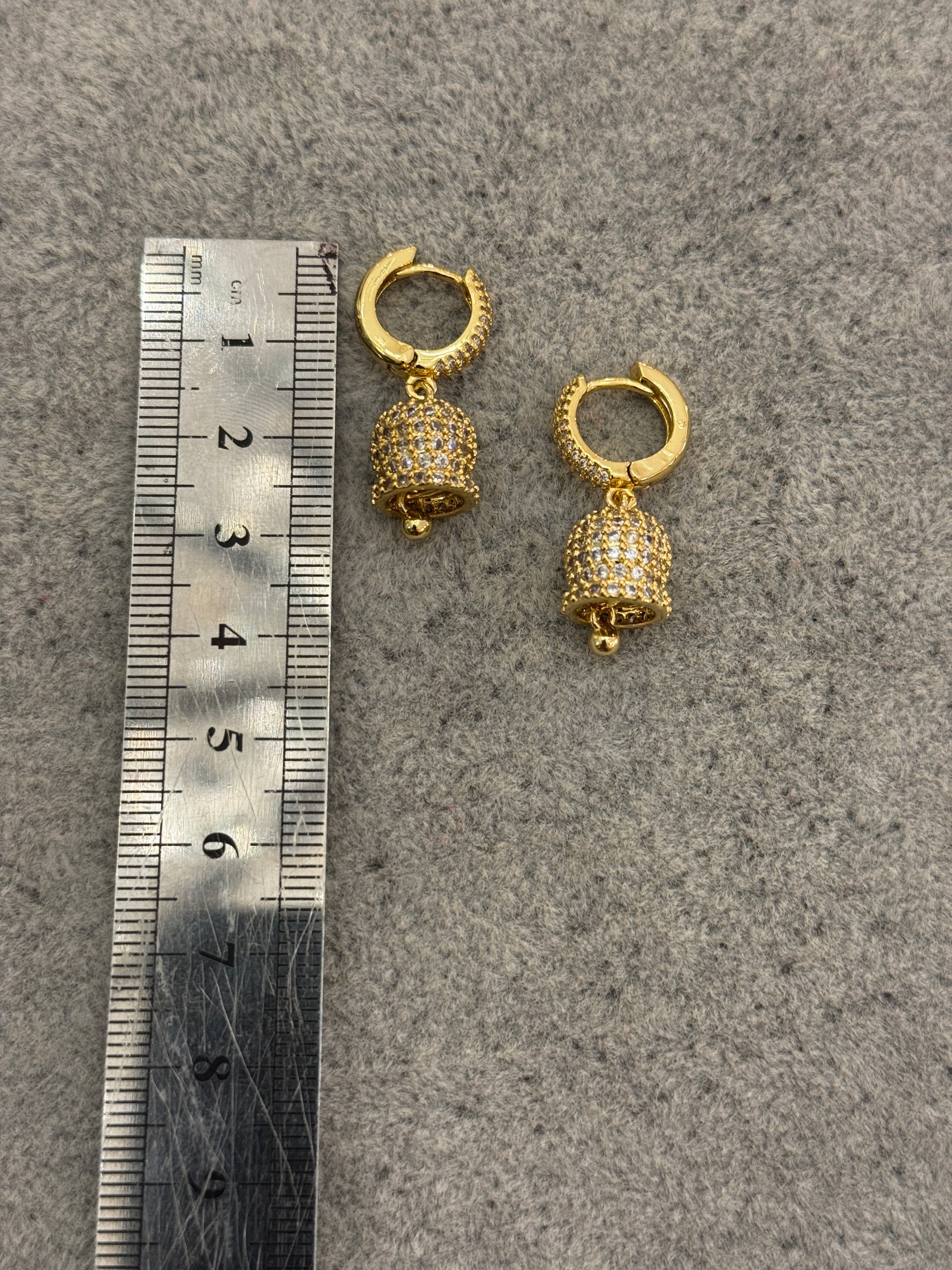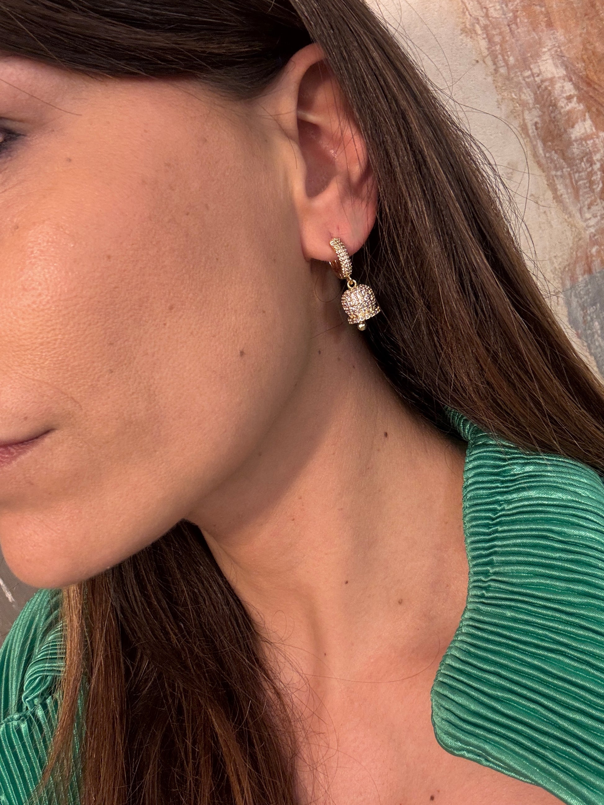 Orecchino in metallo dorato con zirconi. Chiusura con buco a scomparsa.