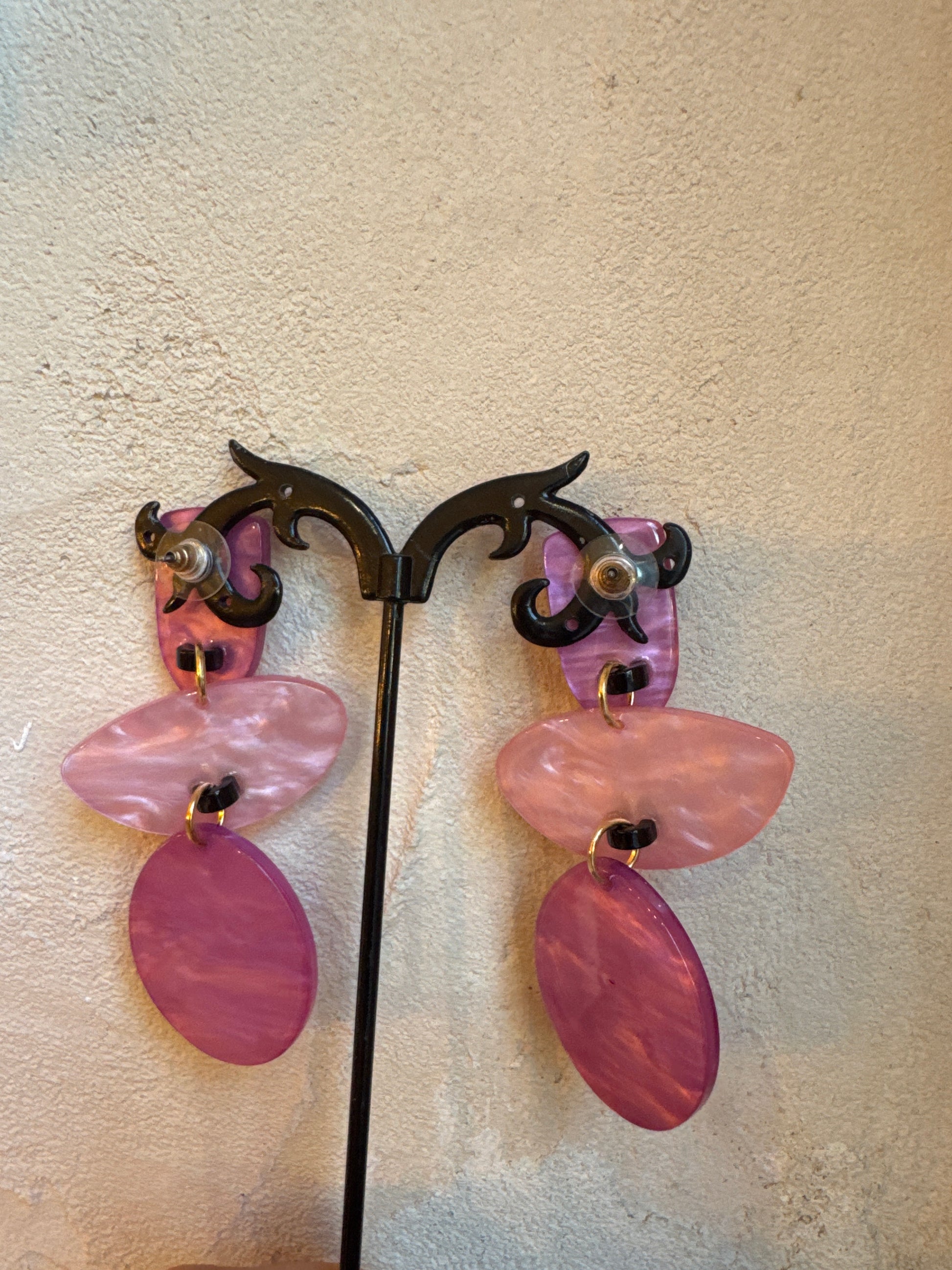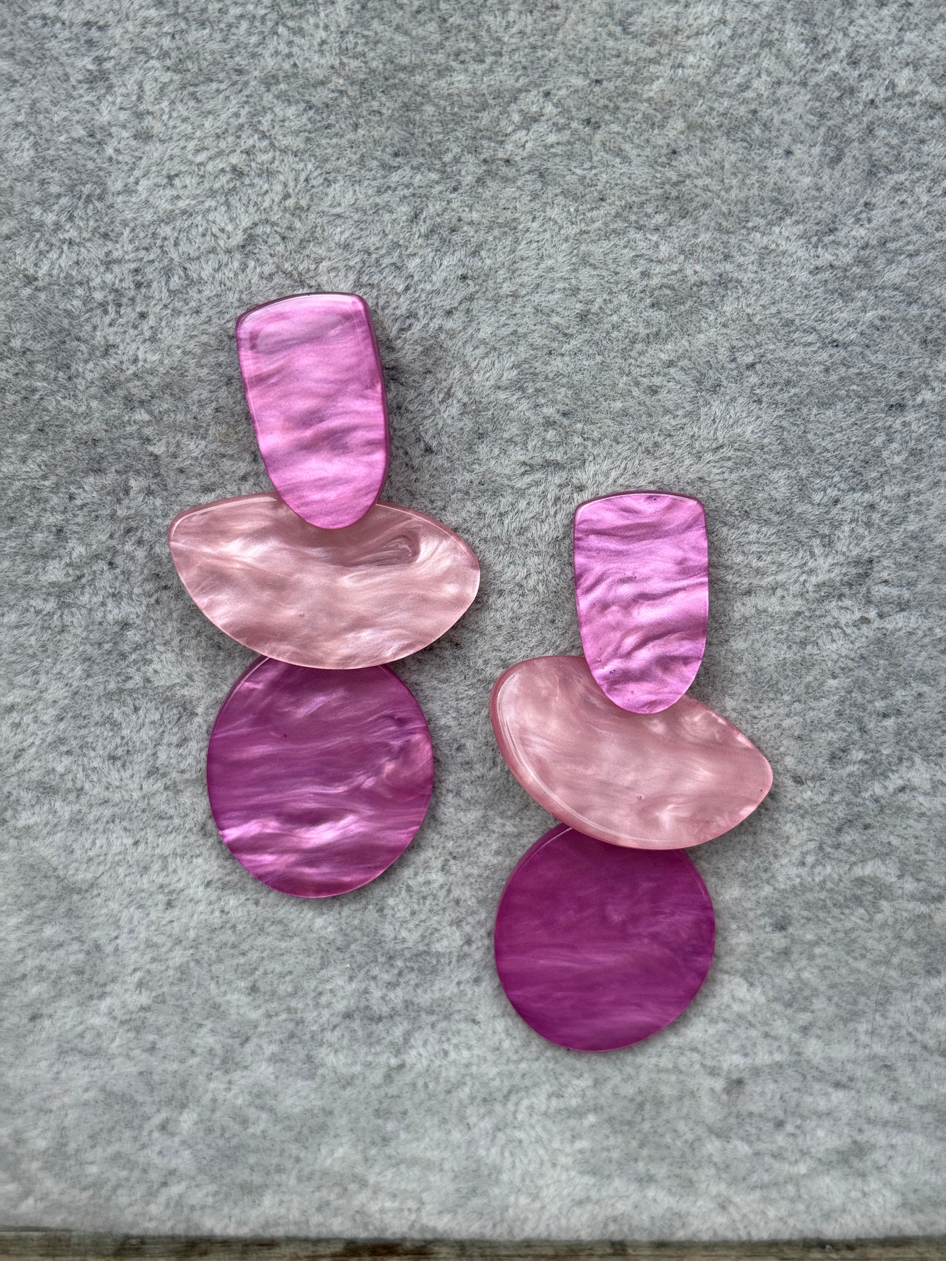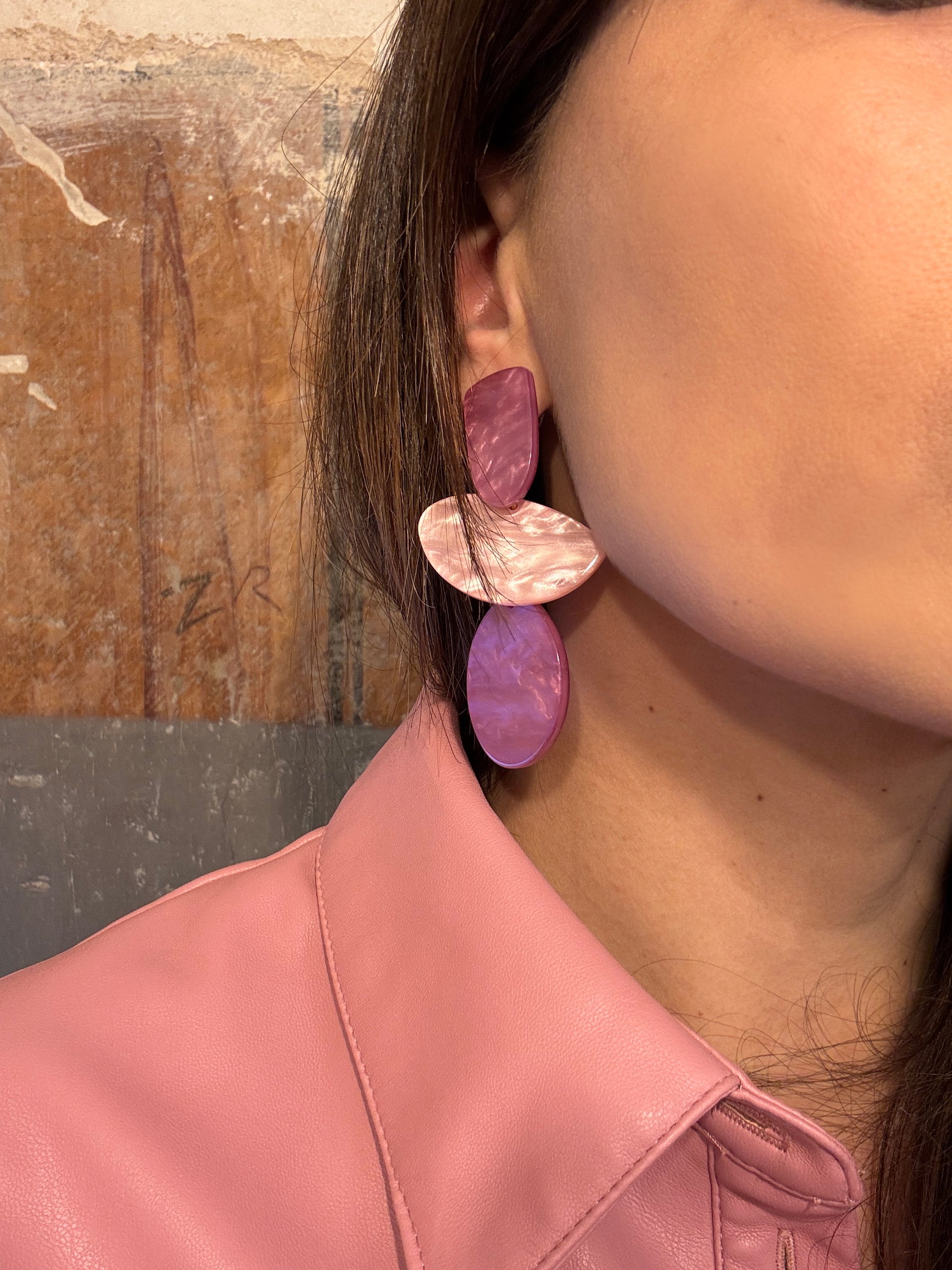 Orecchino in resina rosa e lilla con chiusura a farfallina.