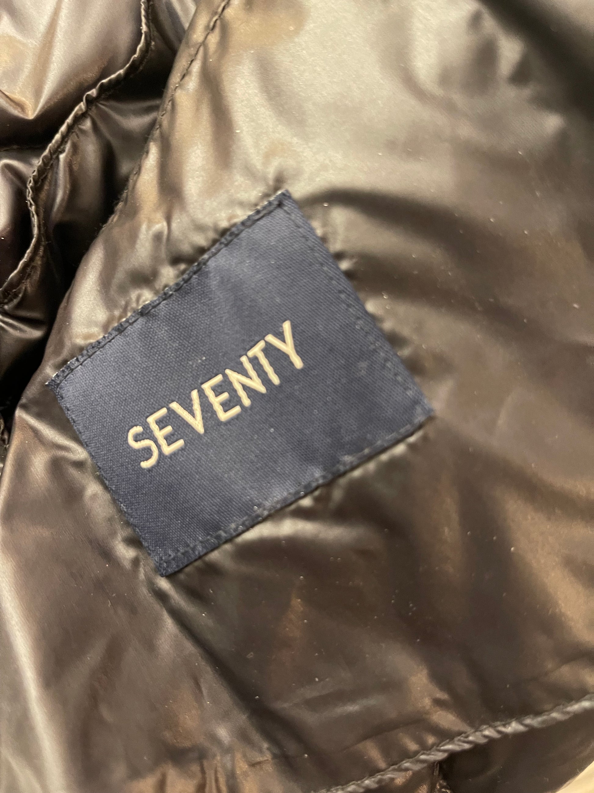 Piumino Seventy nero. Chiusura zip e doppia tasca frontale.