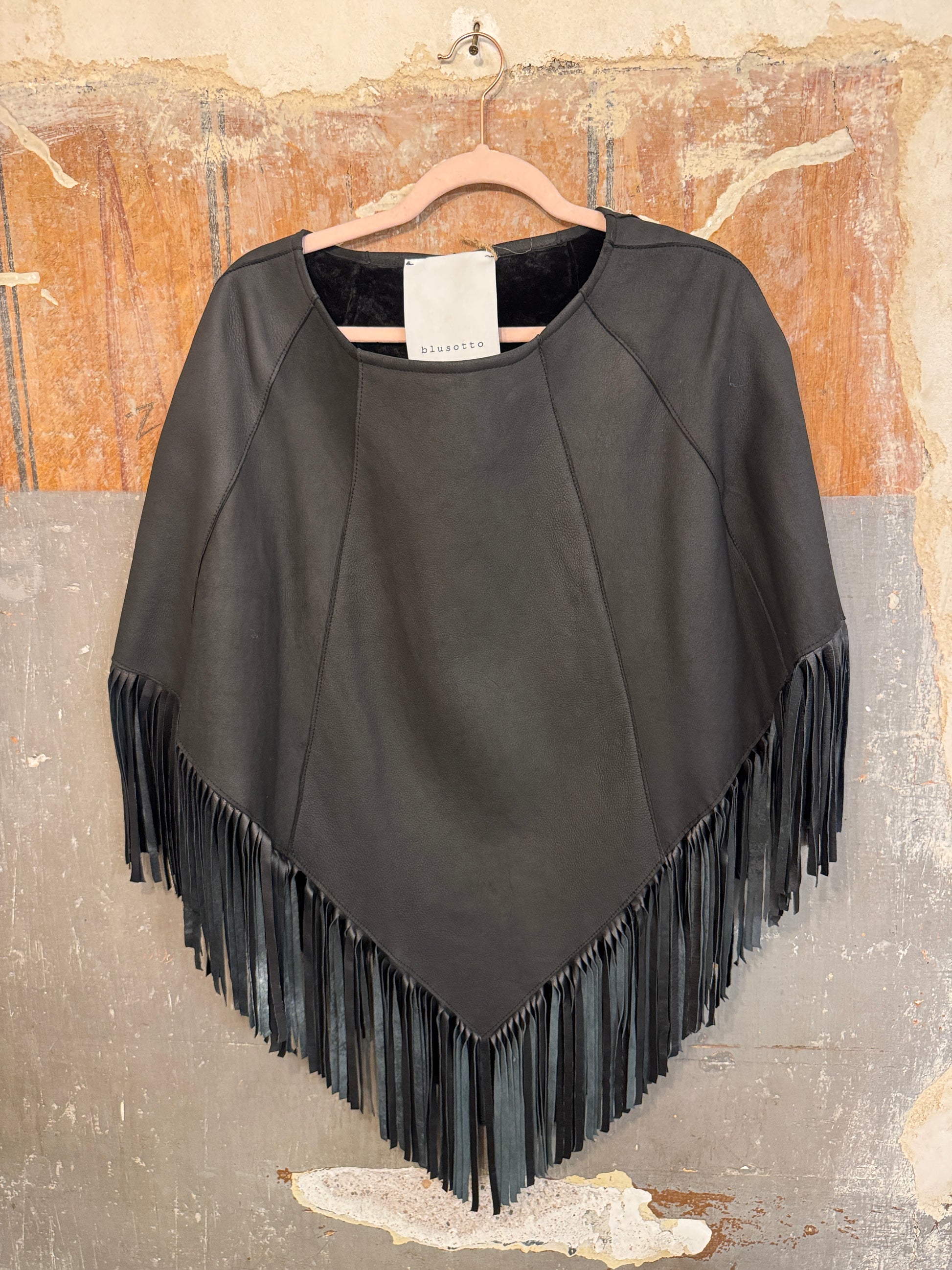 PONCHO BLUSOTTO PELLE NERO CON FRANGE