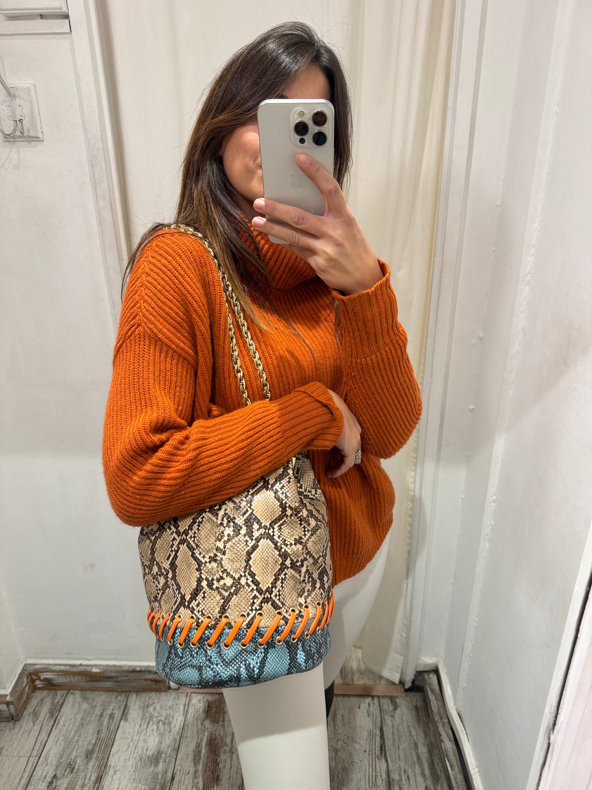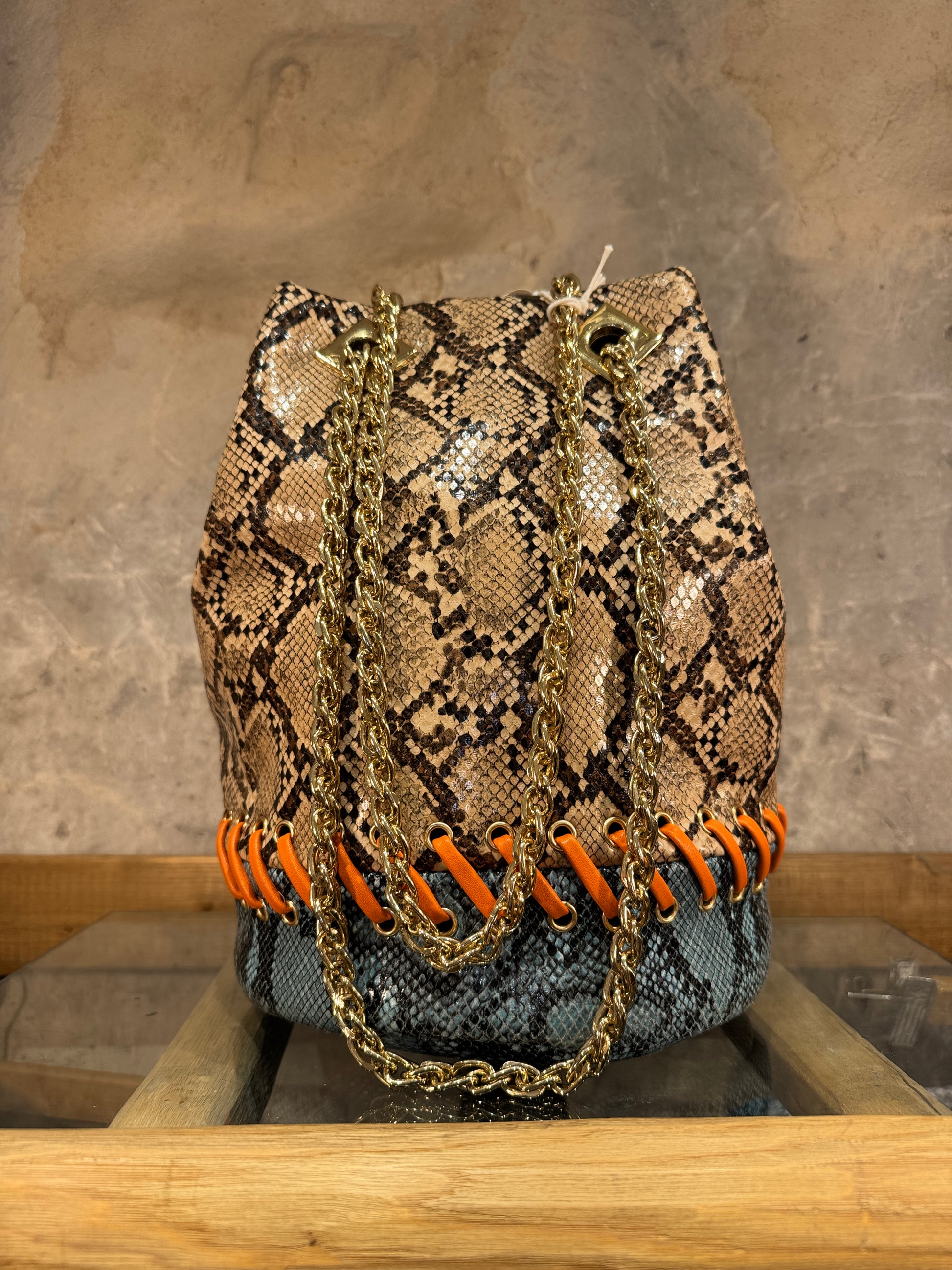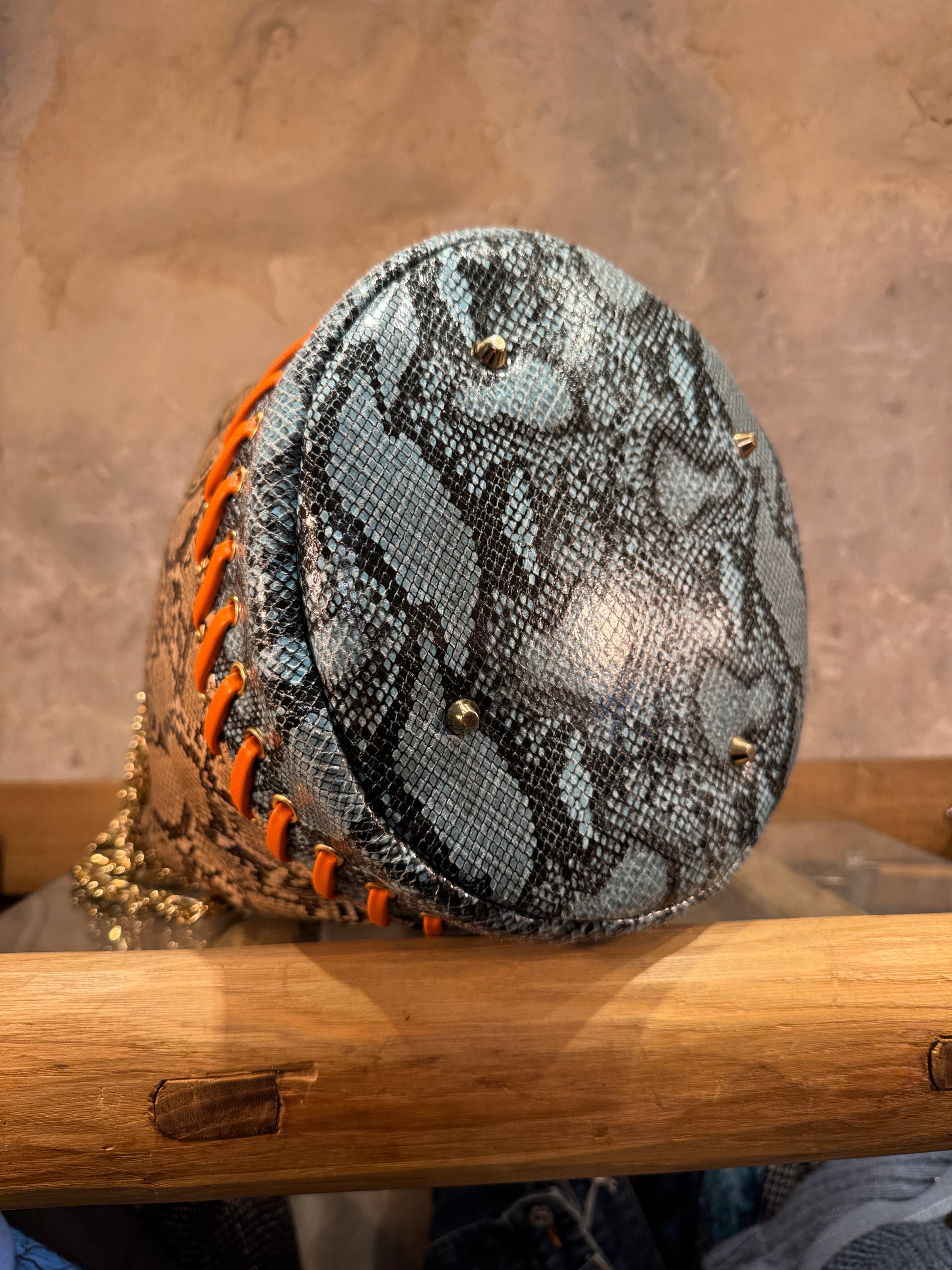 borsa a secchiello grande La Carrie in ecopelle stampa pitone classico e pitone azzurro sulla base. Tracolla a catena dorata. Chiusura con bottone a clip. Piedini sul fondo