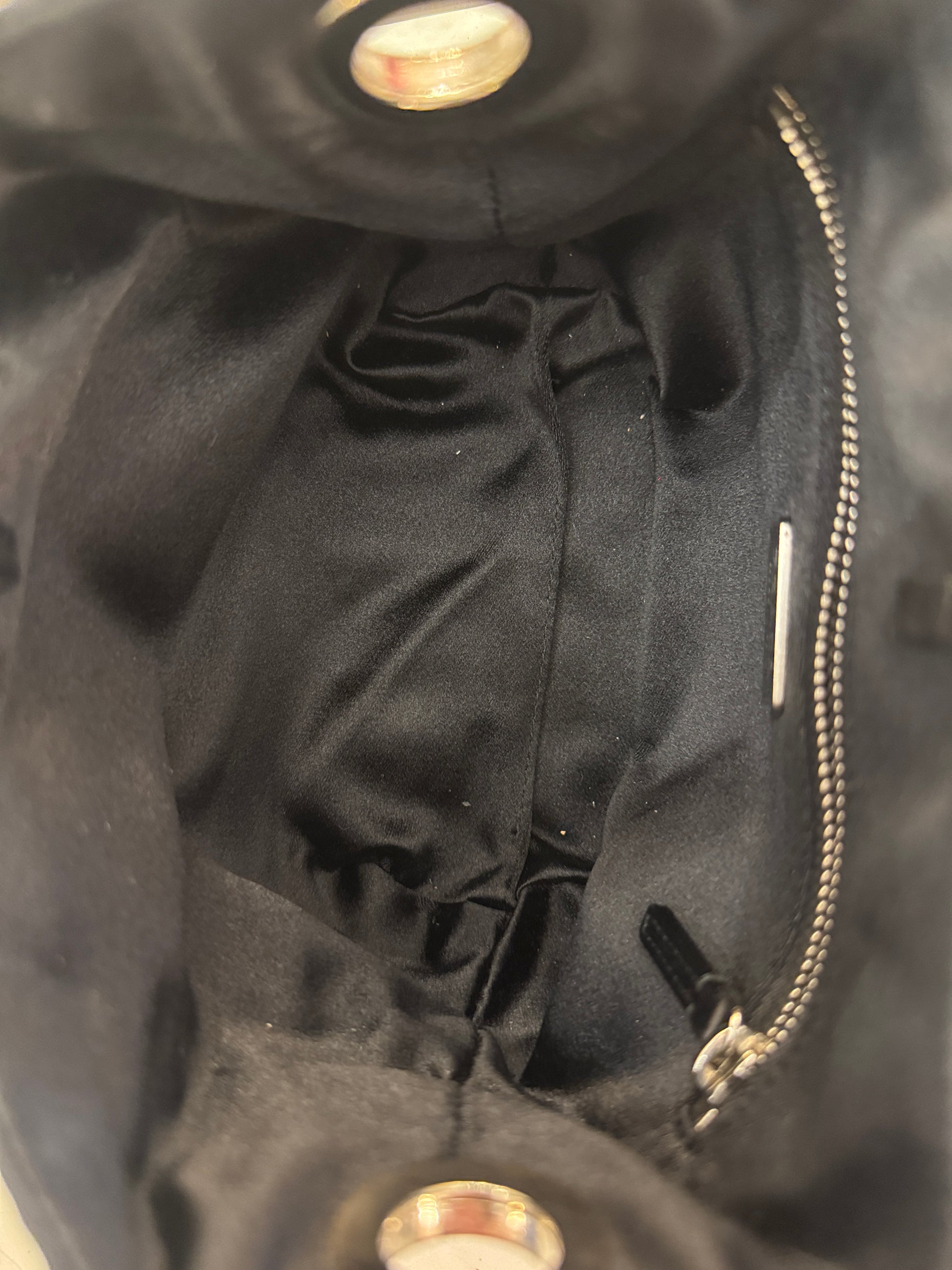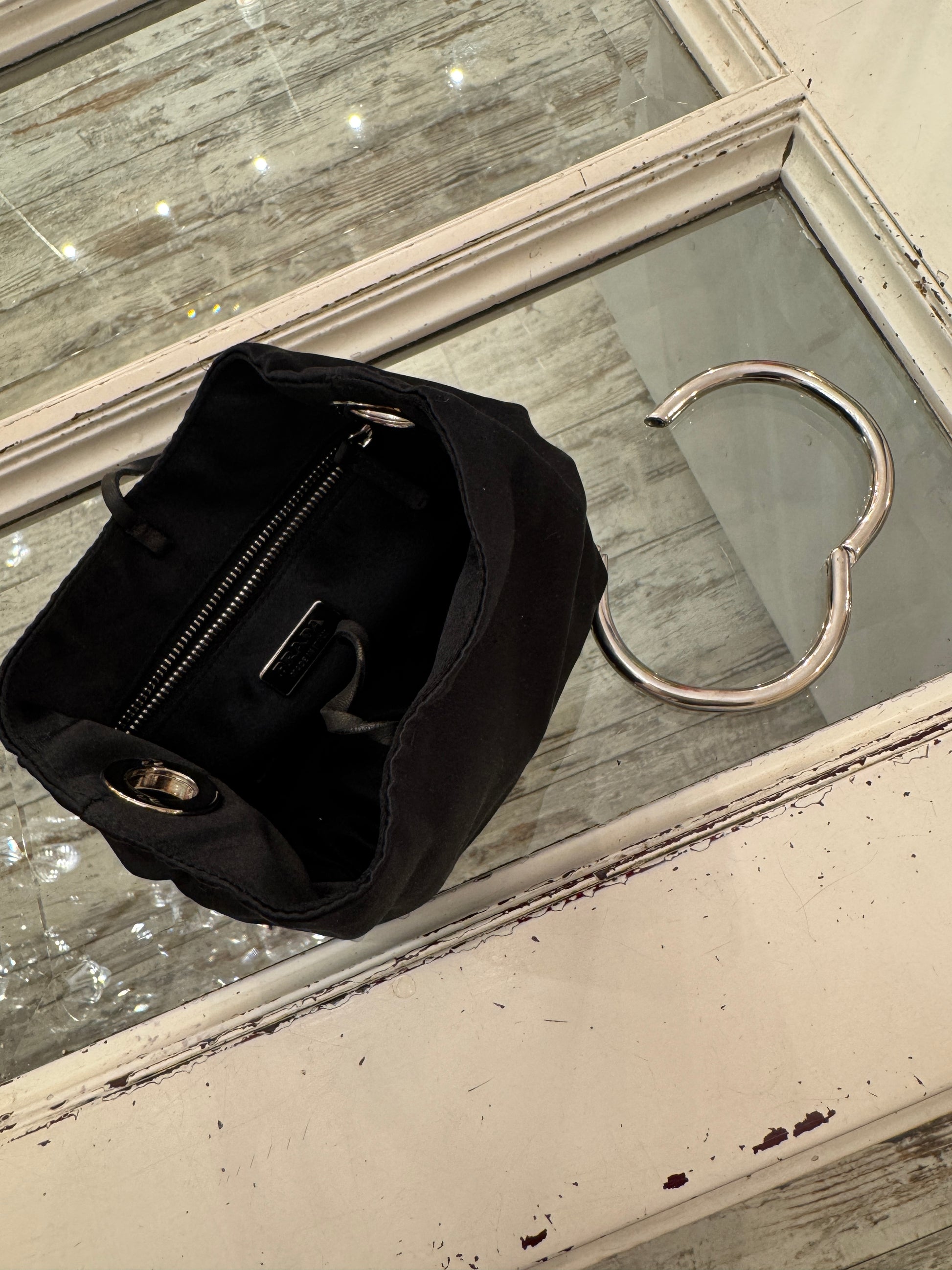 Mini borsa a sacchetto Prada vintage nero in bylon satin con manico in metallo argentato. Chiusura con nastrino in pelle