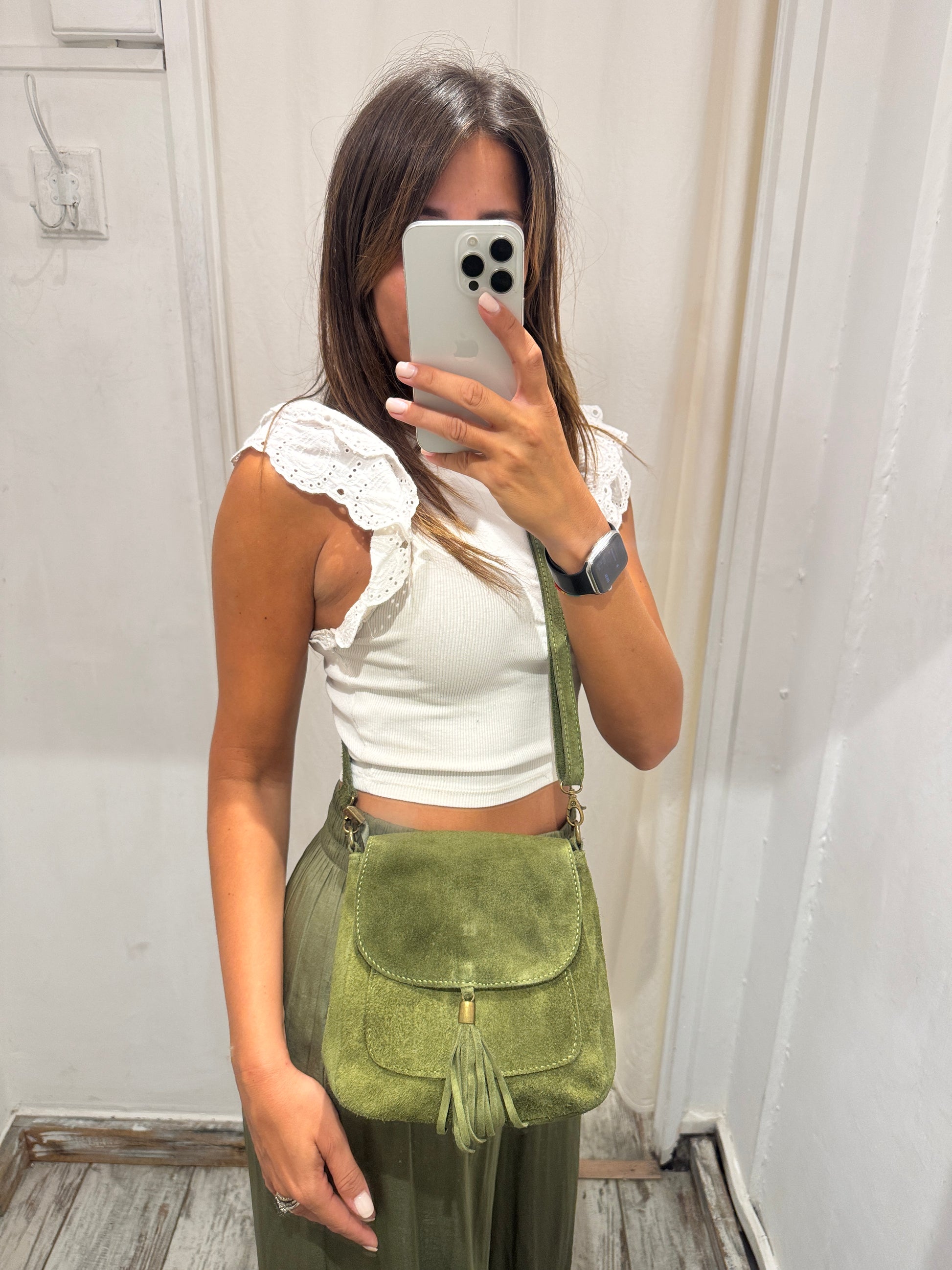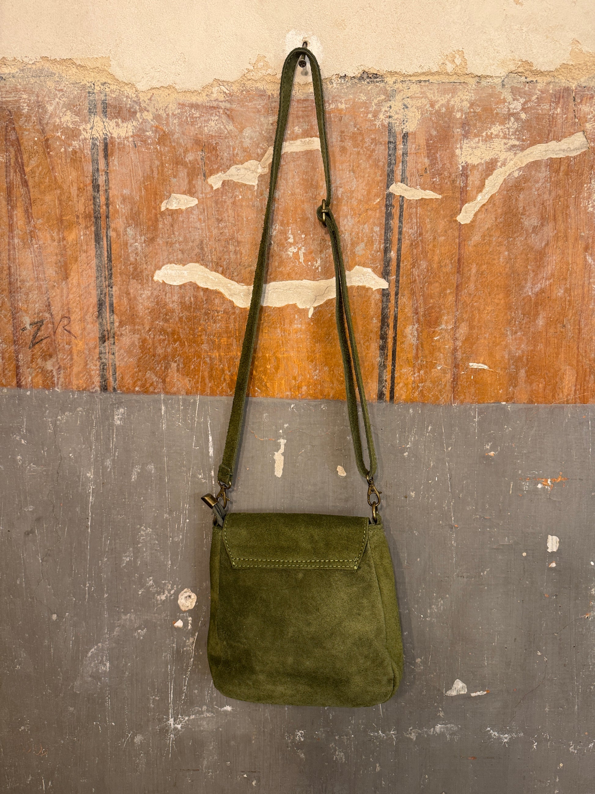 borsa piccola a tracolla in pelle scamosciata color verde militare con nappina. Tracollina in pelle. Chiusura con zip