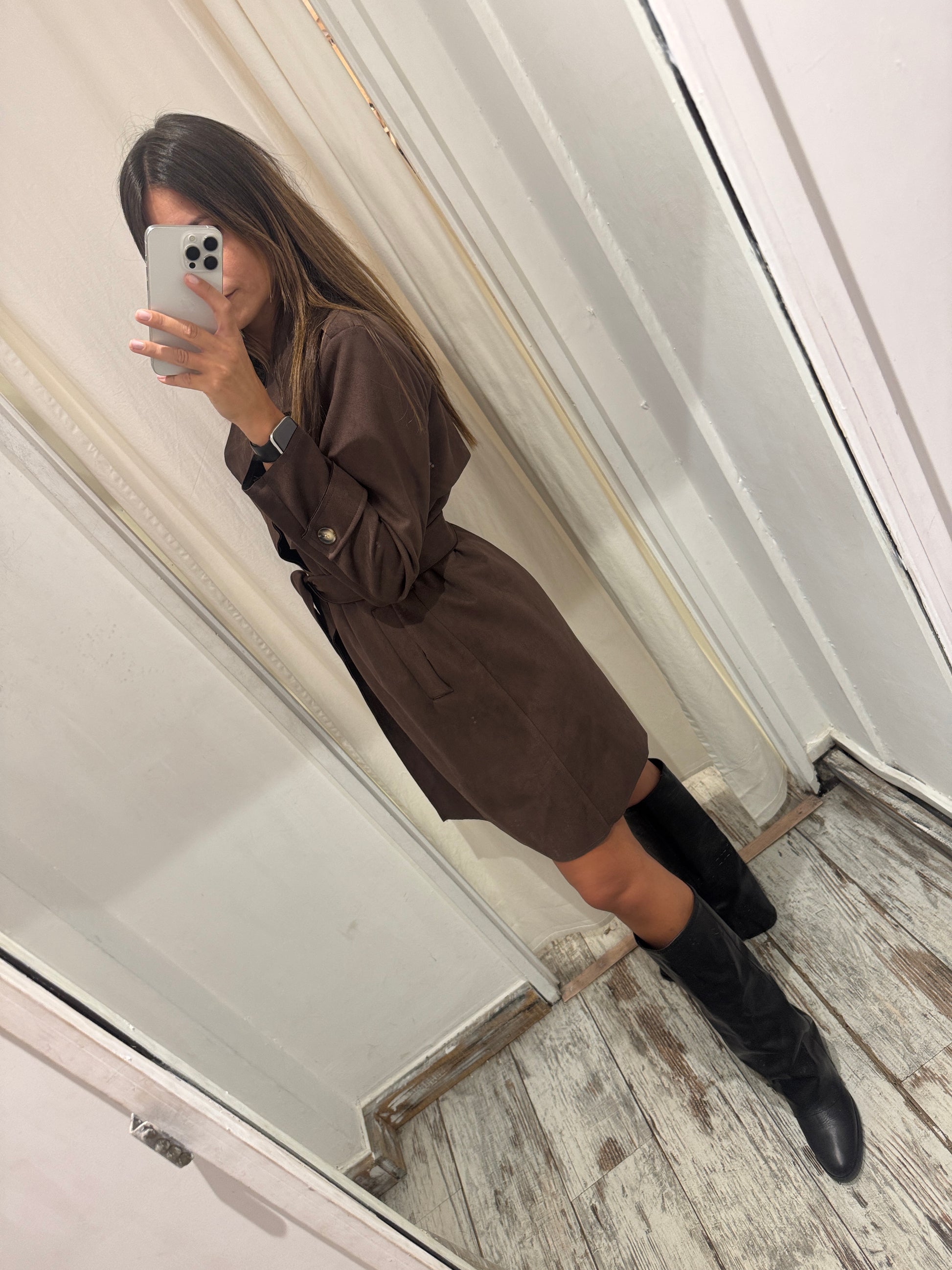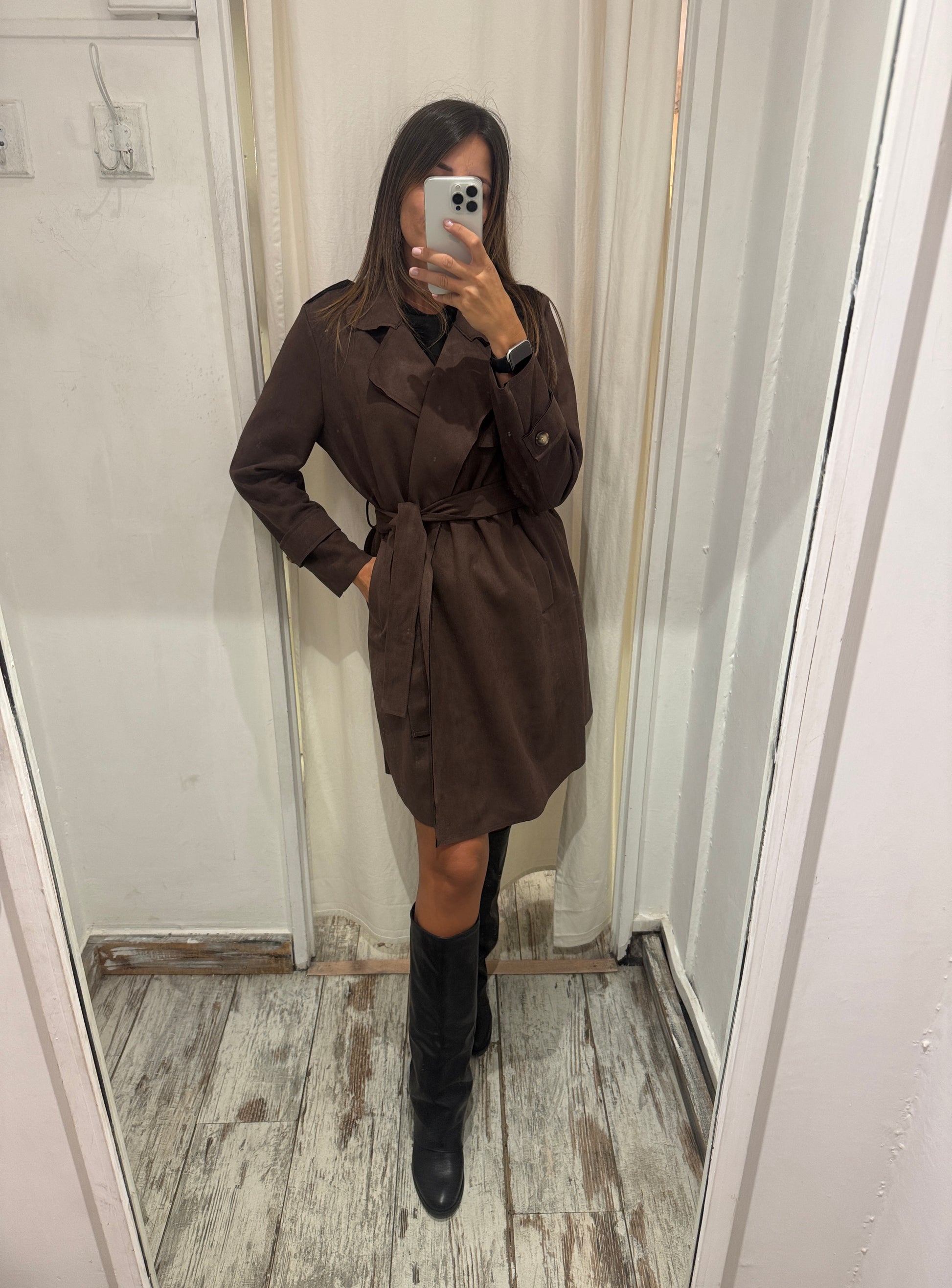 Trench scamosciata color testa di moro con cintura in vita removibile e tasche.
