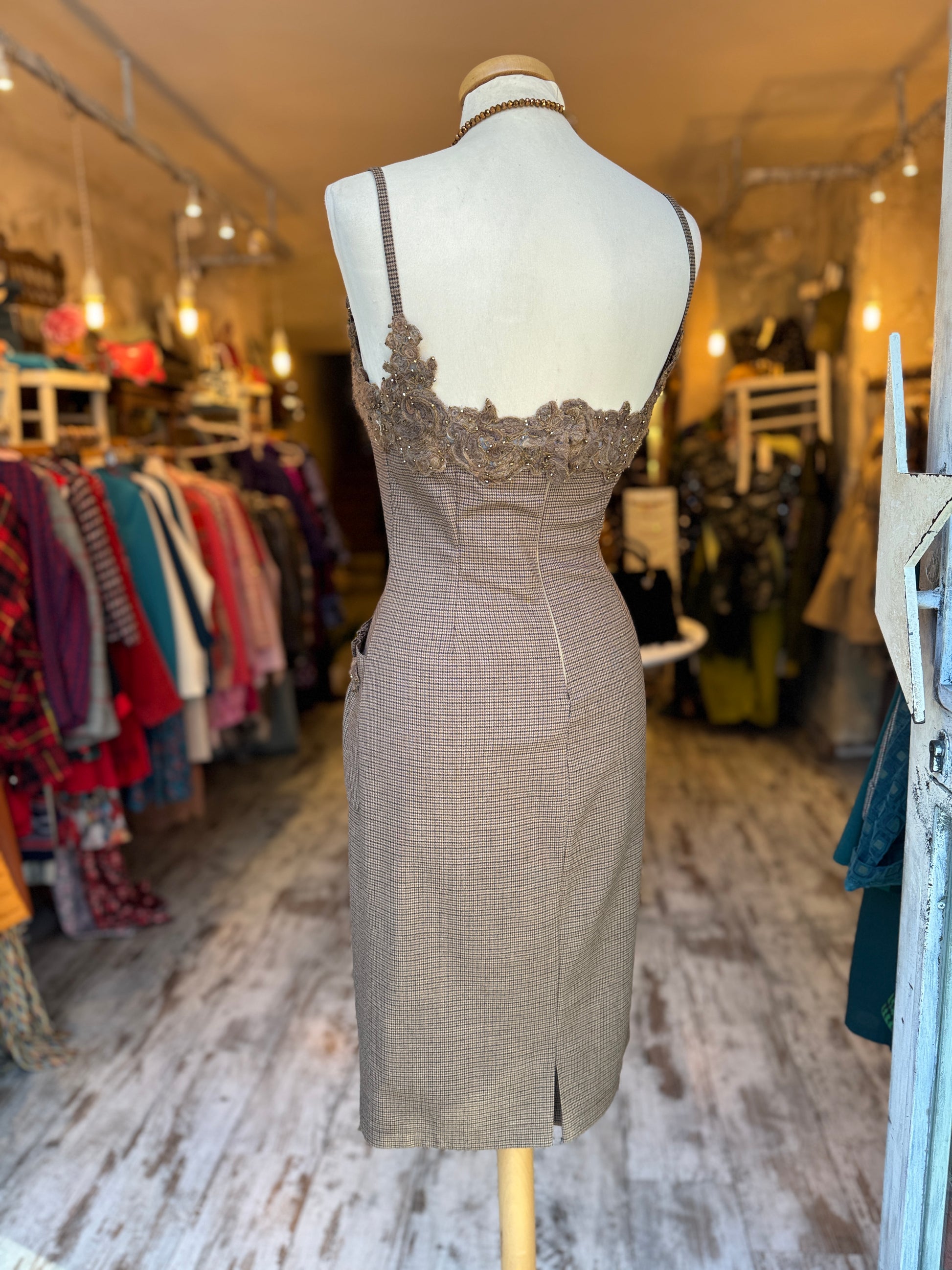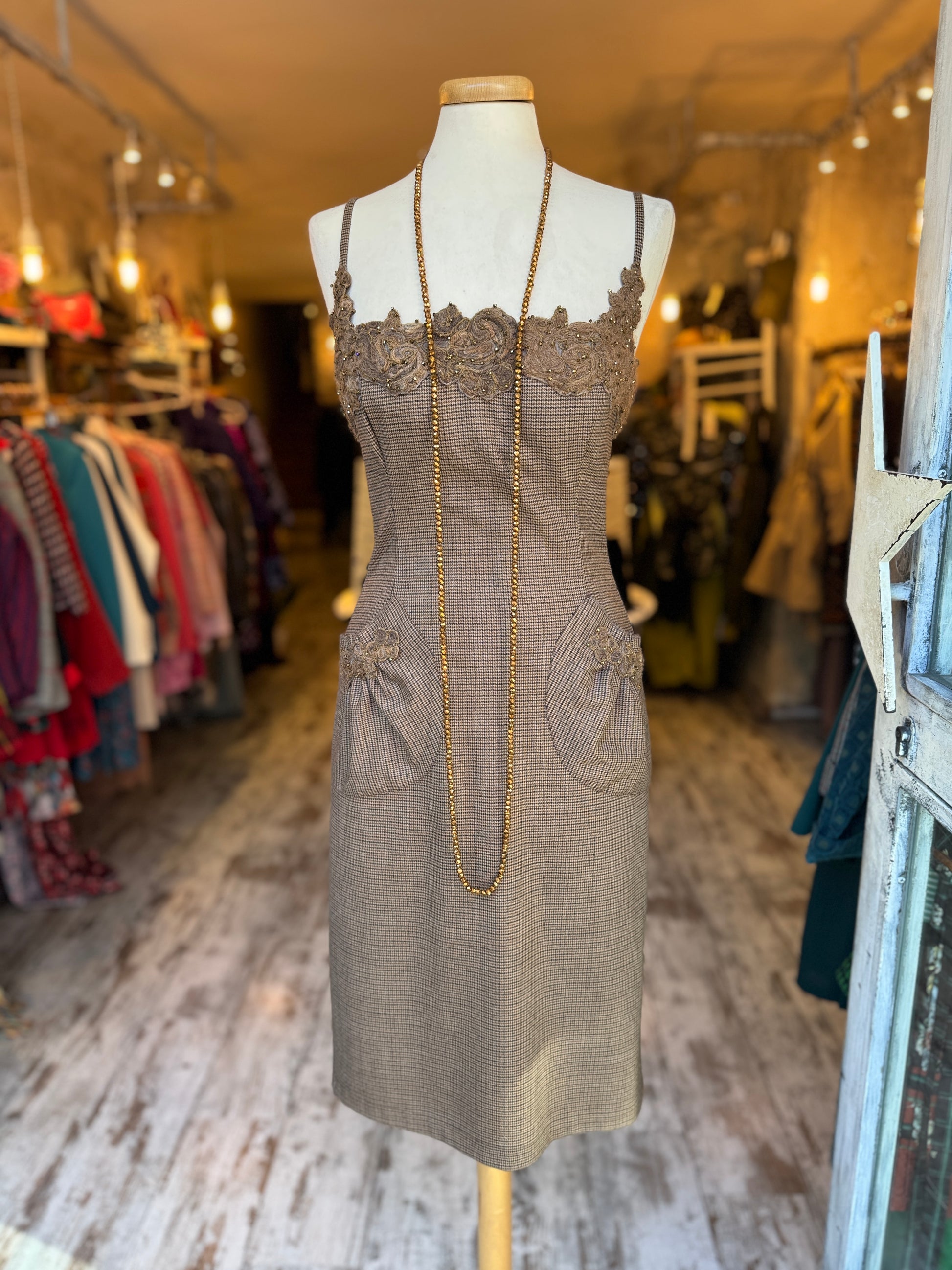 Tubino Ermanno Scervino in micro pied de poule marrone con pizzo di lana e perline sul seno e sulle tasche frontali. Reggiseno interno. Zip posteriore a chiusura.