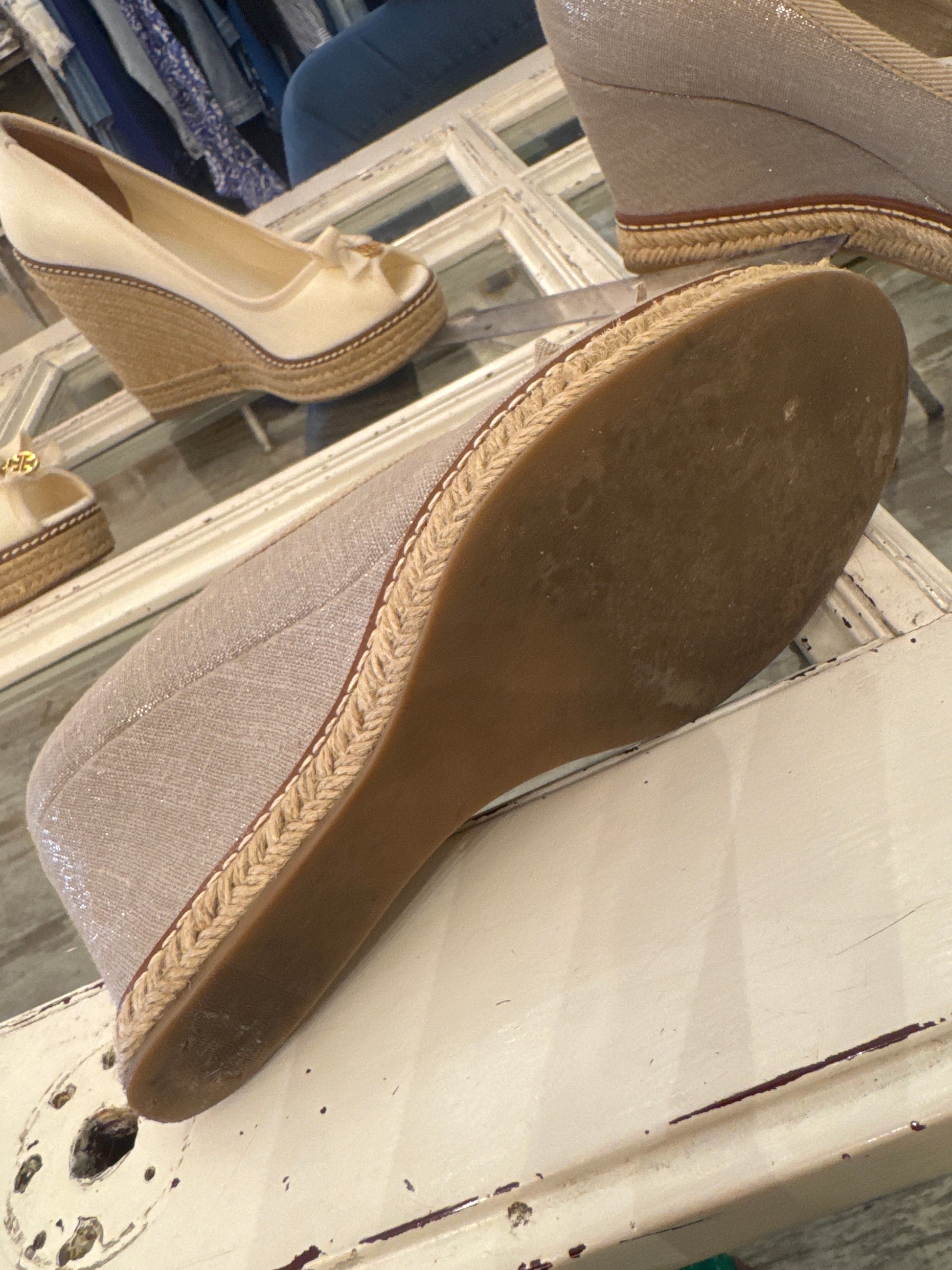 Zeppa Tory Burch open toe in tela color sabbia laminato con zeppa in tela e suola in corda. Fiocchetto con logo in metallo oro sulla punta.